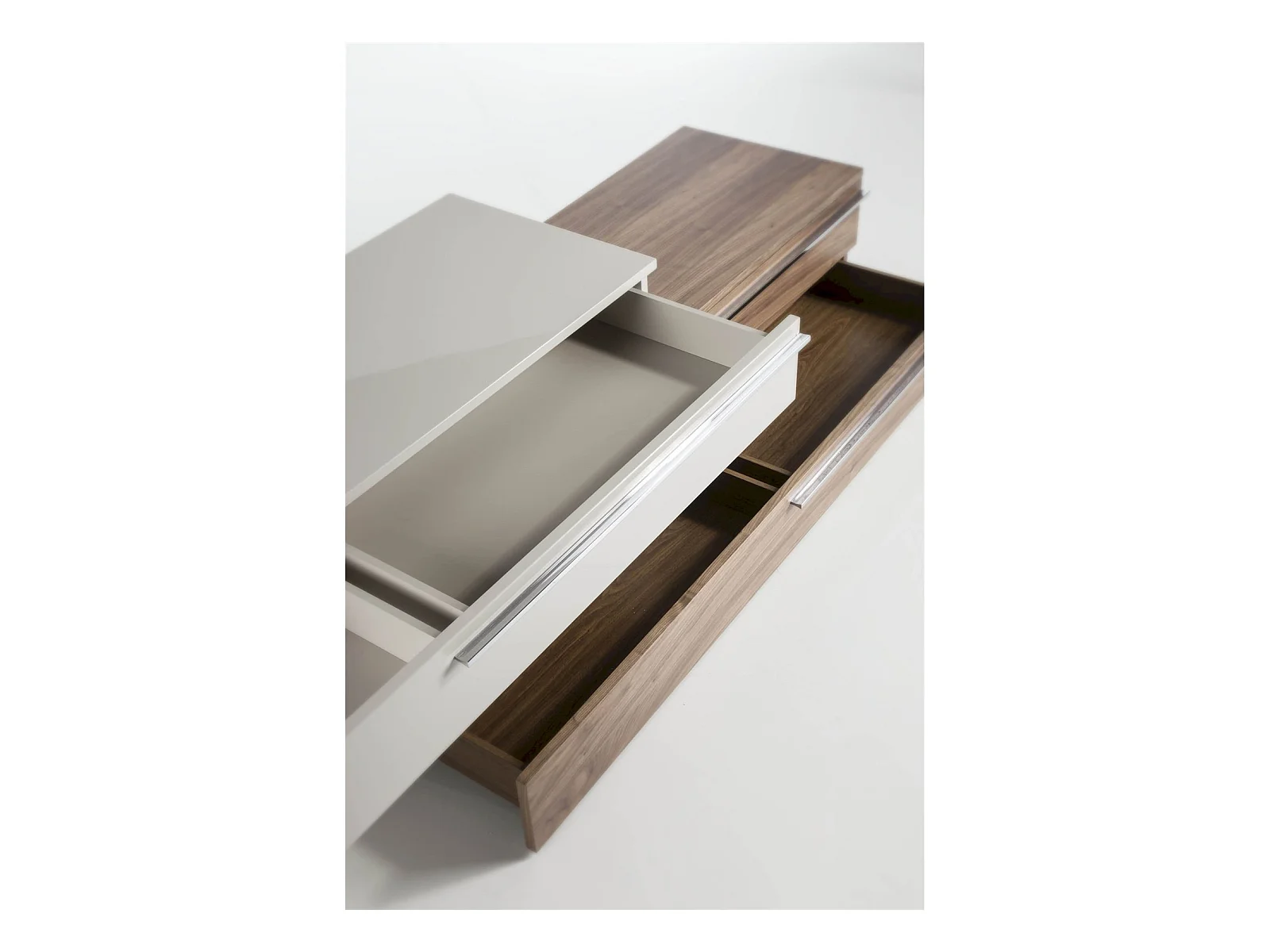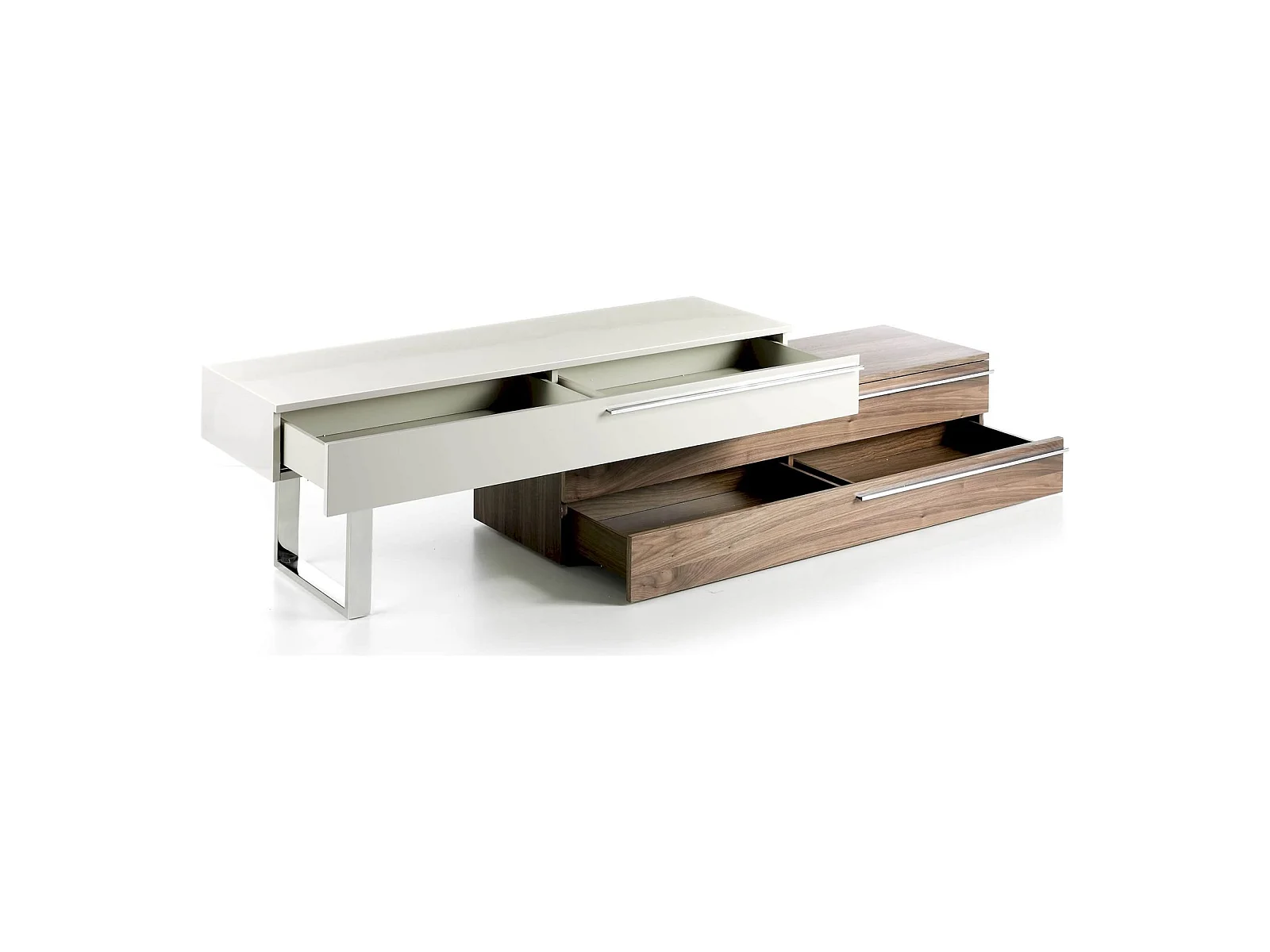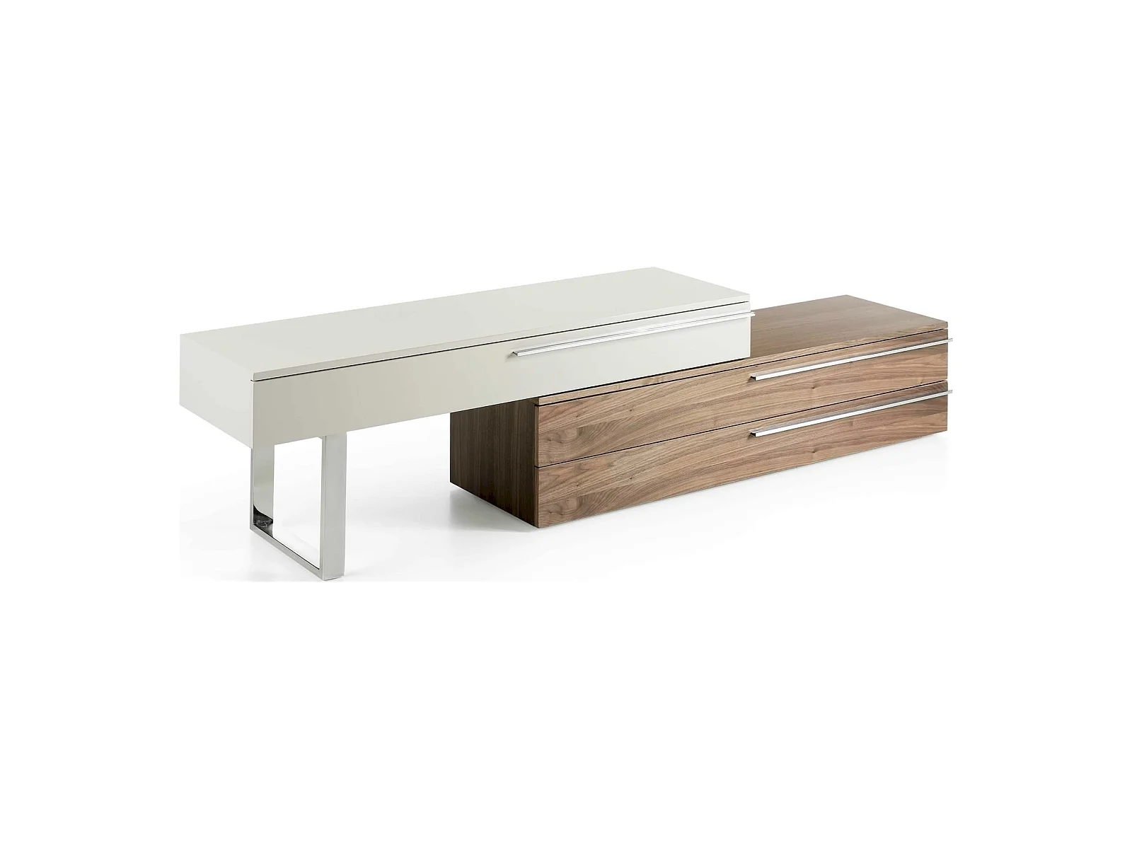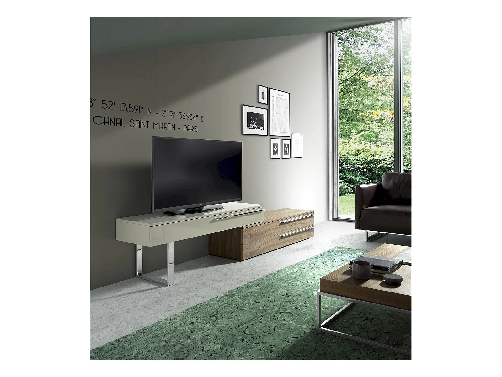 Meuble TV bois laqué poignées et pied acier inoxydable