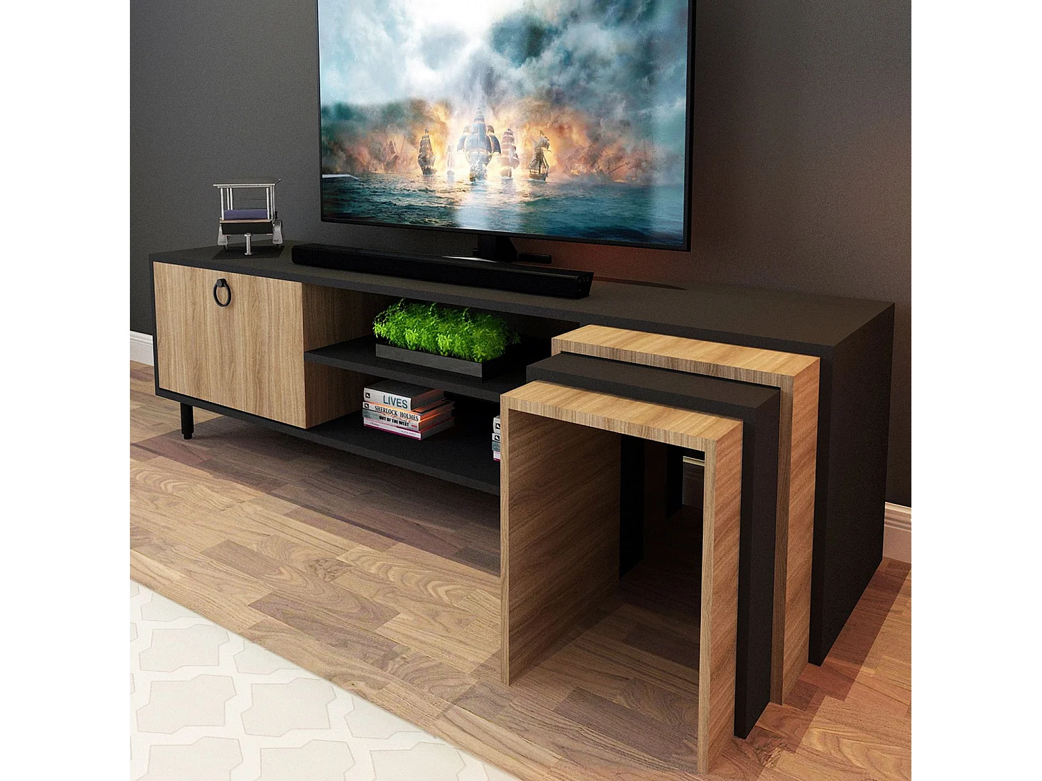 Meuble TV combiné table gigogne Aptare 180cm Panneau Bois Chêne Noir