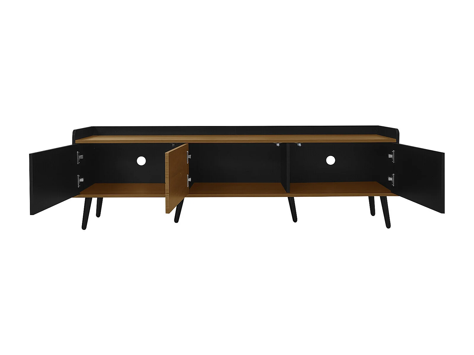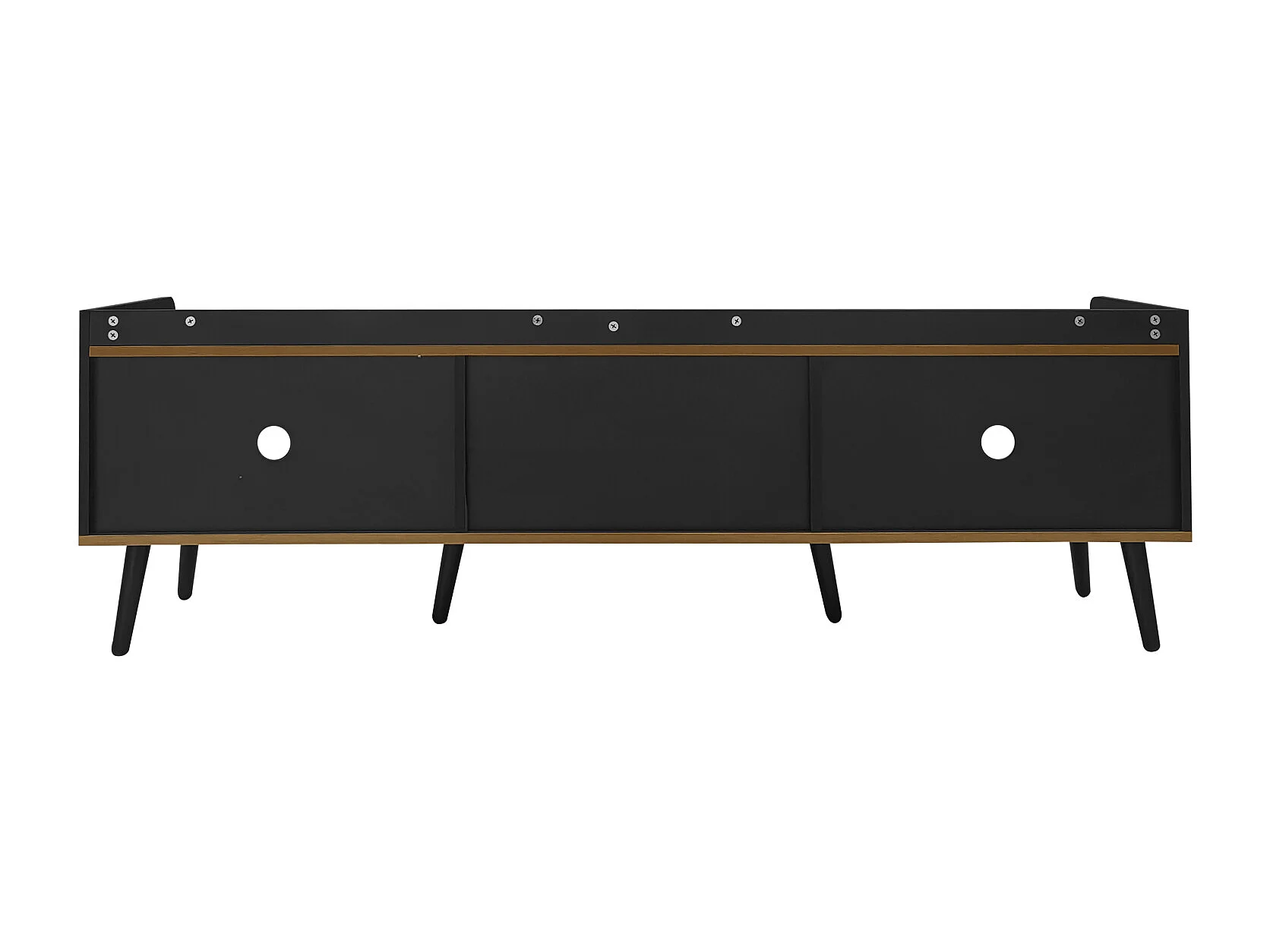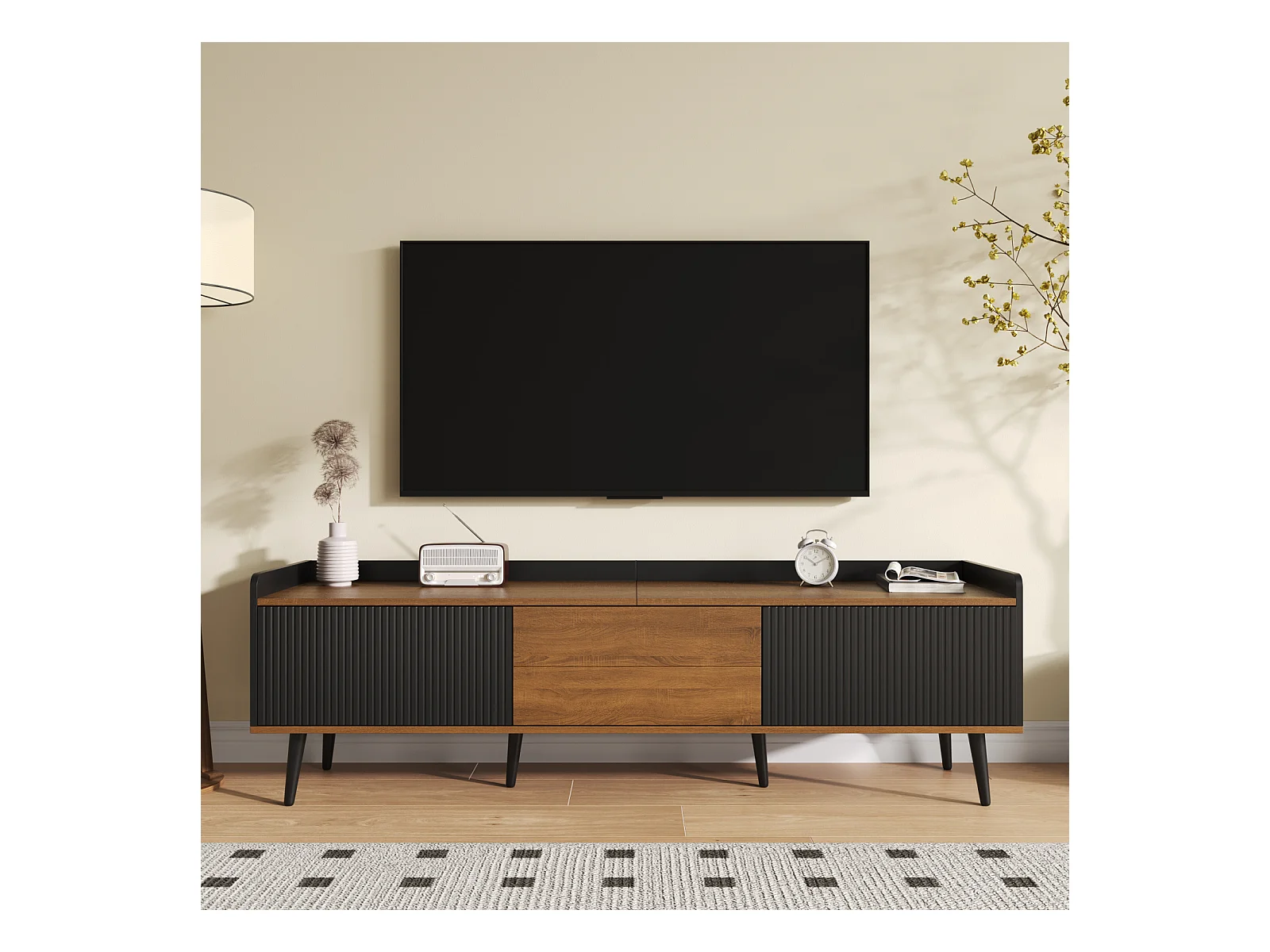 Meuble TV compact 3 portes. Finition noir/bois, 160 x 39 x 49,5 cm. Meuble bas pratique pour vos supports multimédia.