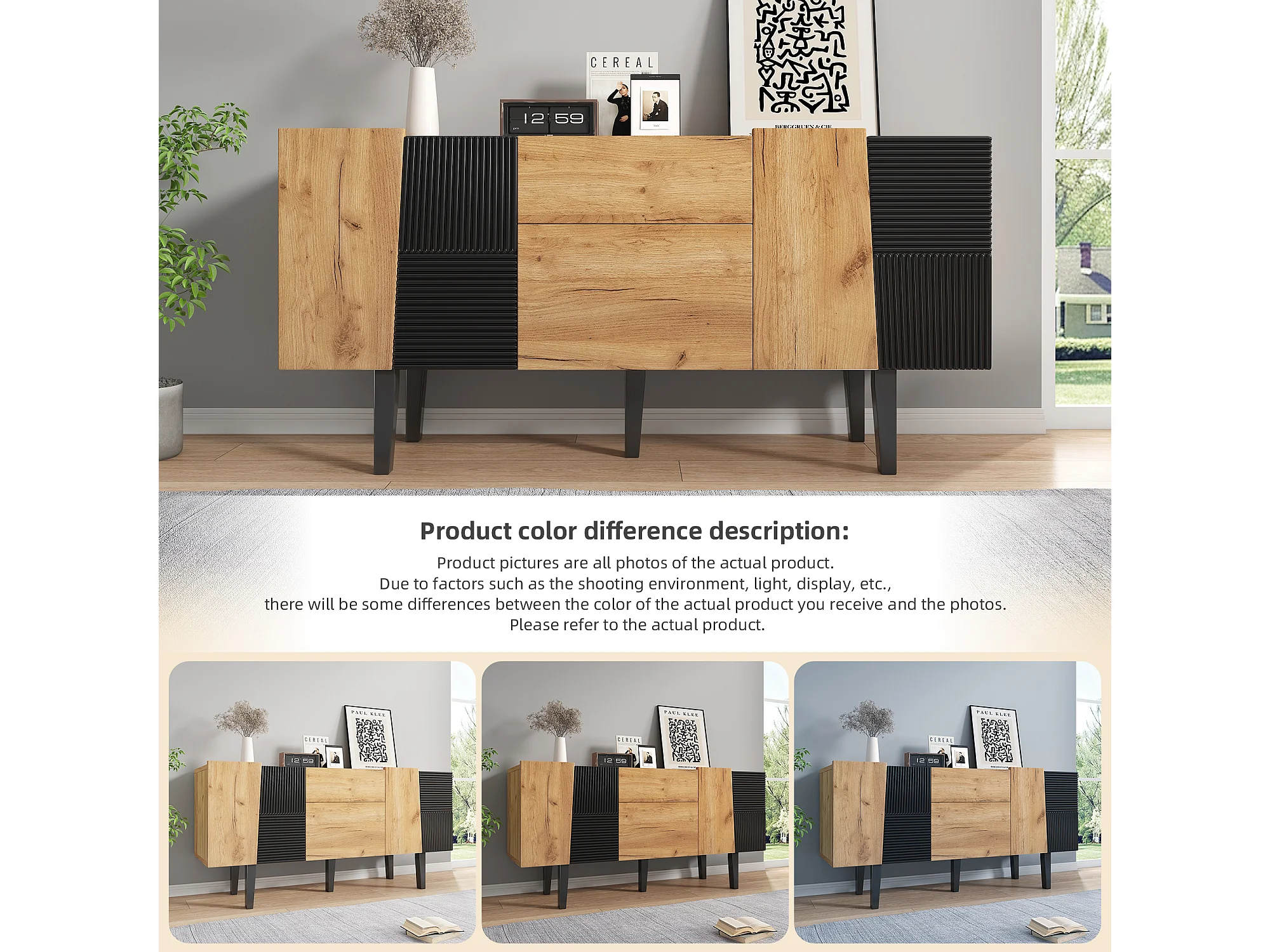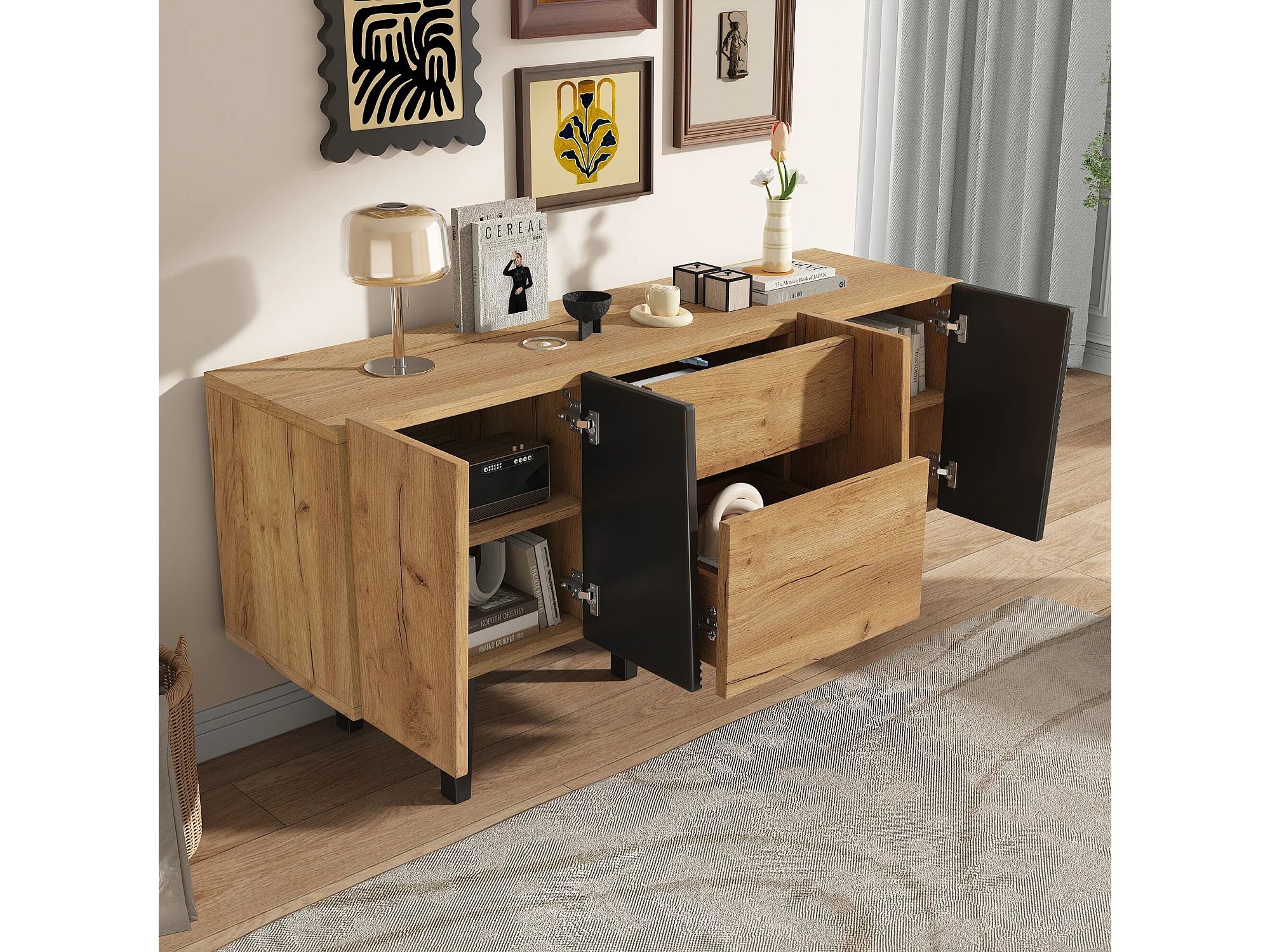 Meuble TV contemporain effet bois portes texturées noir