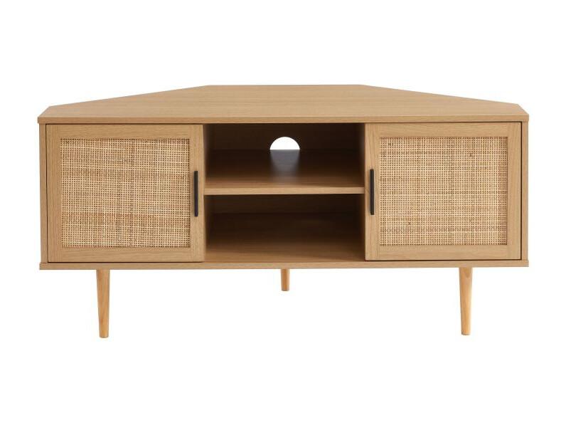 Meuble tv d'angle effet chêne et cannage rotin 2 portes ZIRCON