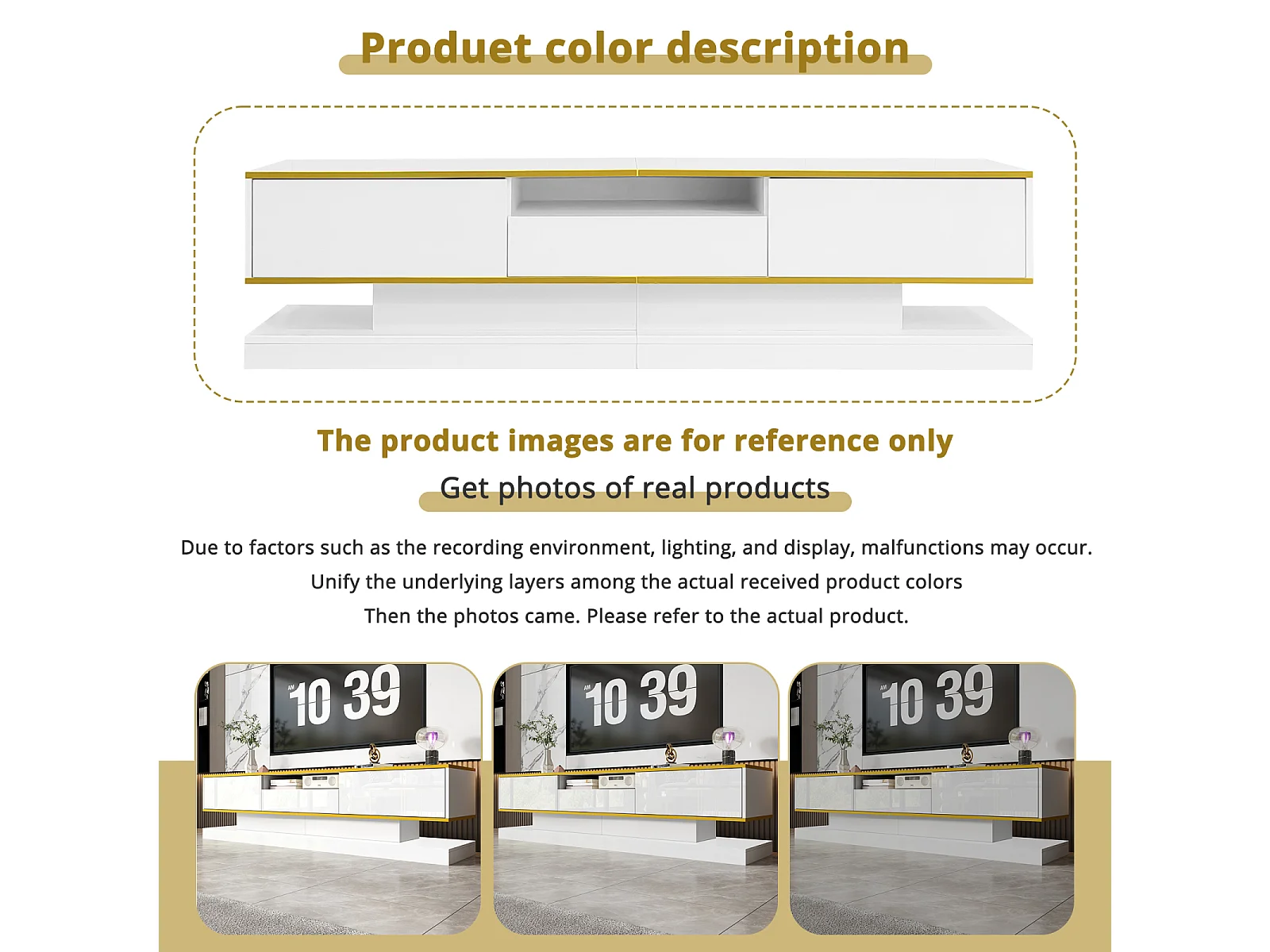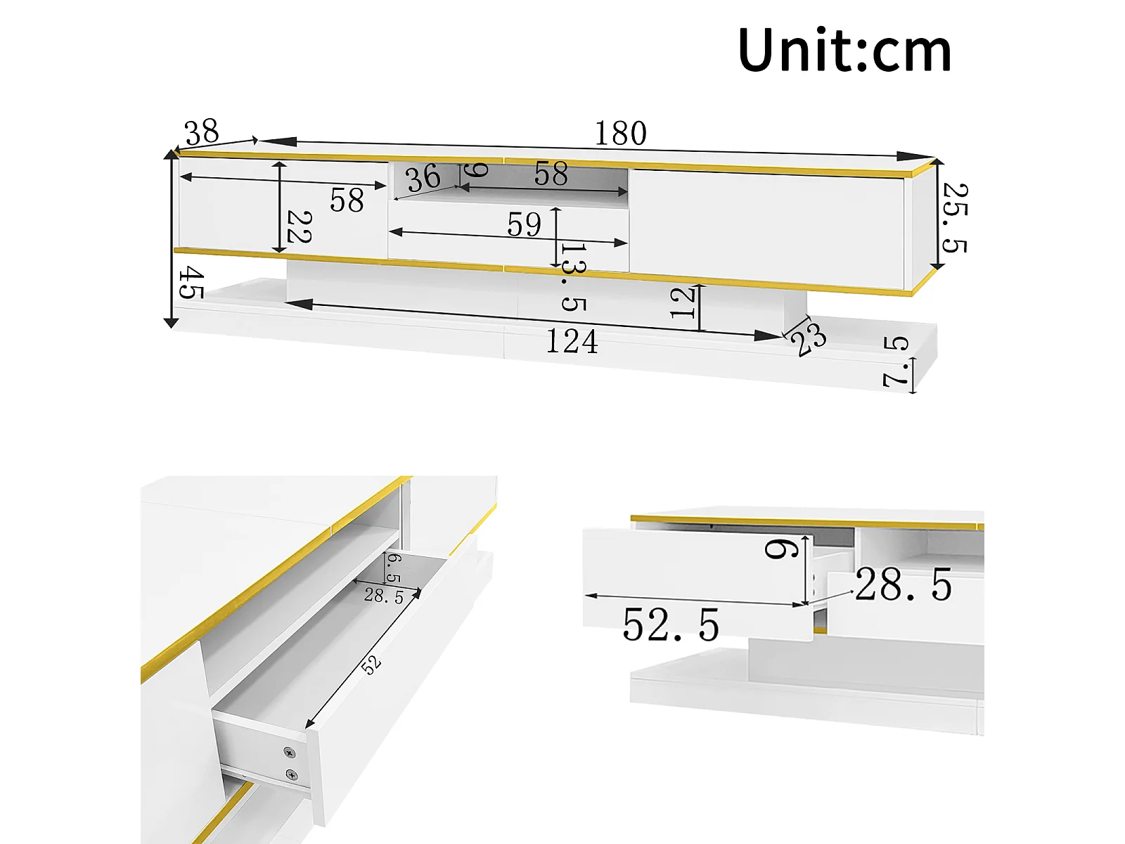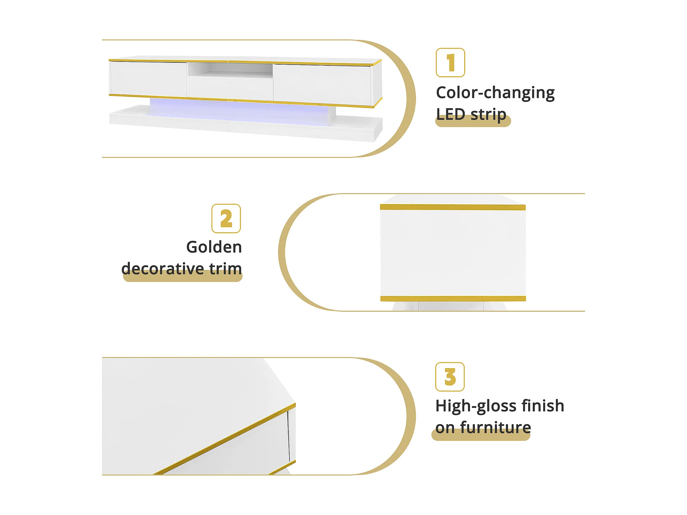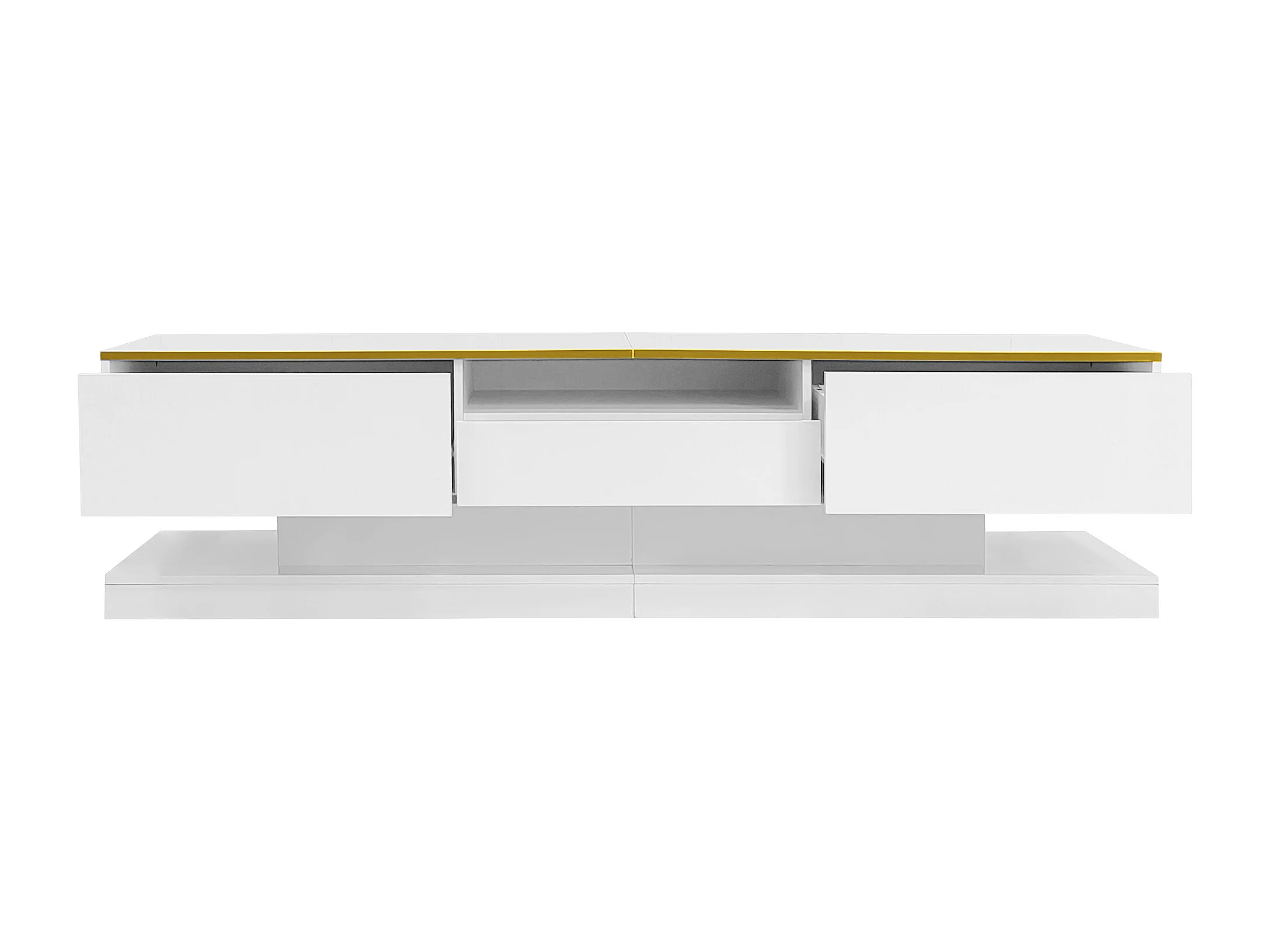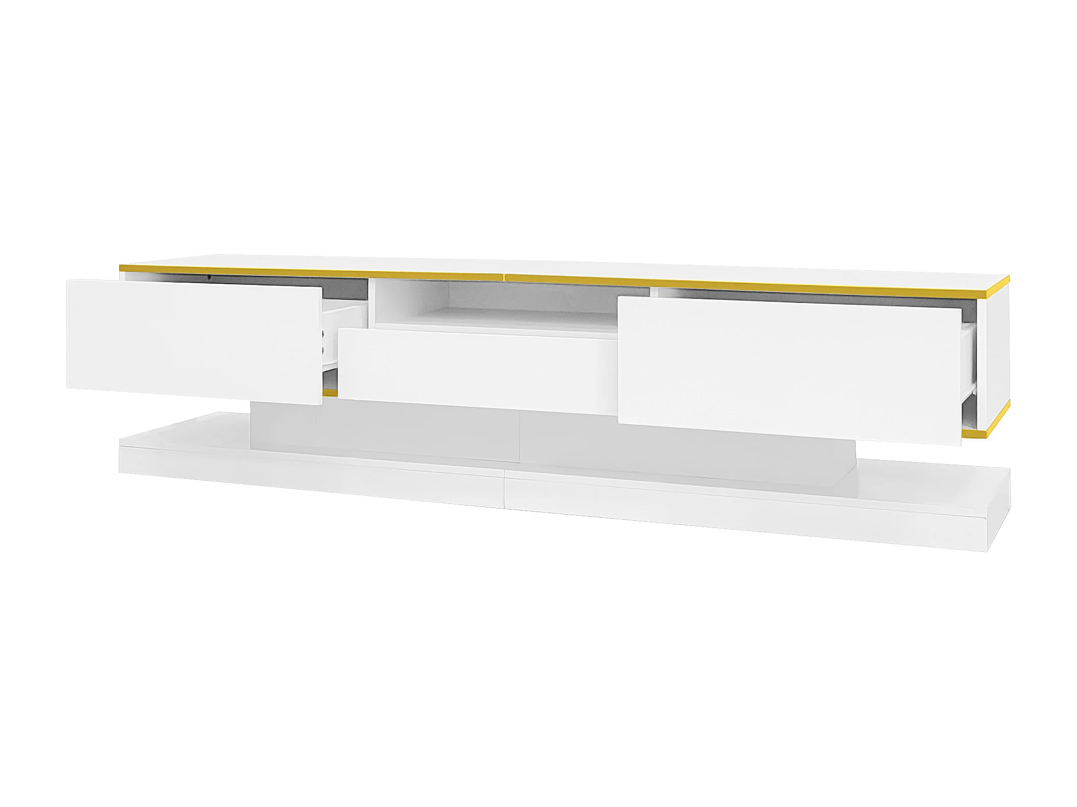 Meuble TV de 180 cm avec éclairage LED , brillant avec 3 tiroirs et compartiment ouvert , blanc