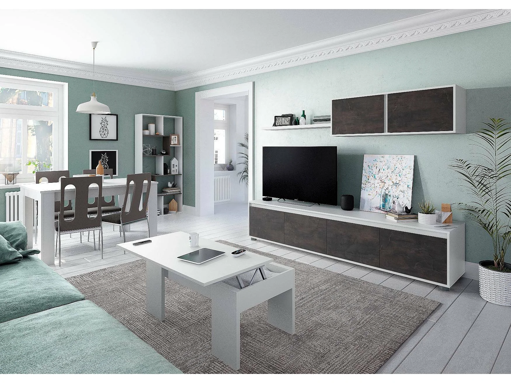 Système mural Savannah, meuble TV meuble de salon, Composition d'ensemble de salon, Ensemble de salon avec élément mural, 200x41h43 cm, Blanc et Oxyde