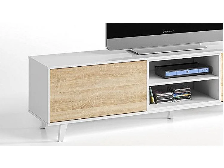 Système mural Buffalo, meuble TV, meuble de salon, composition de salon avec élément mural, 180x41h51 cm, blanc et chêne