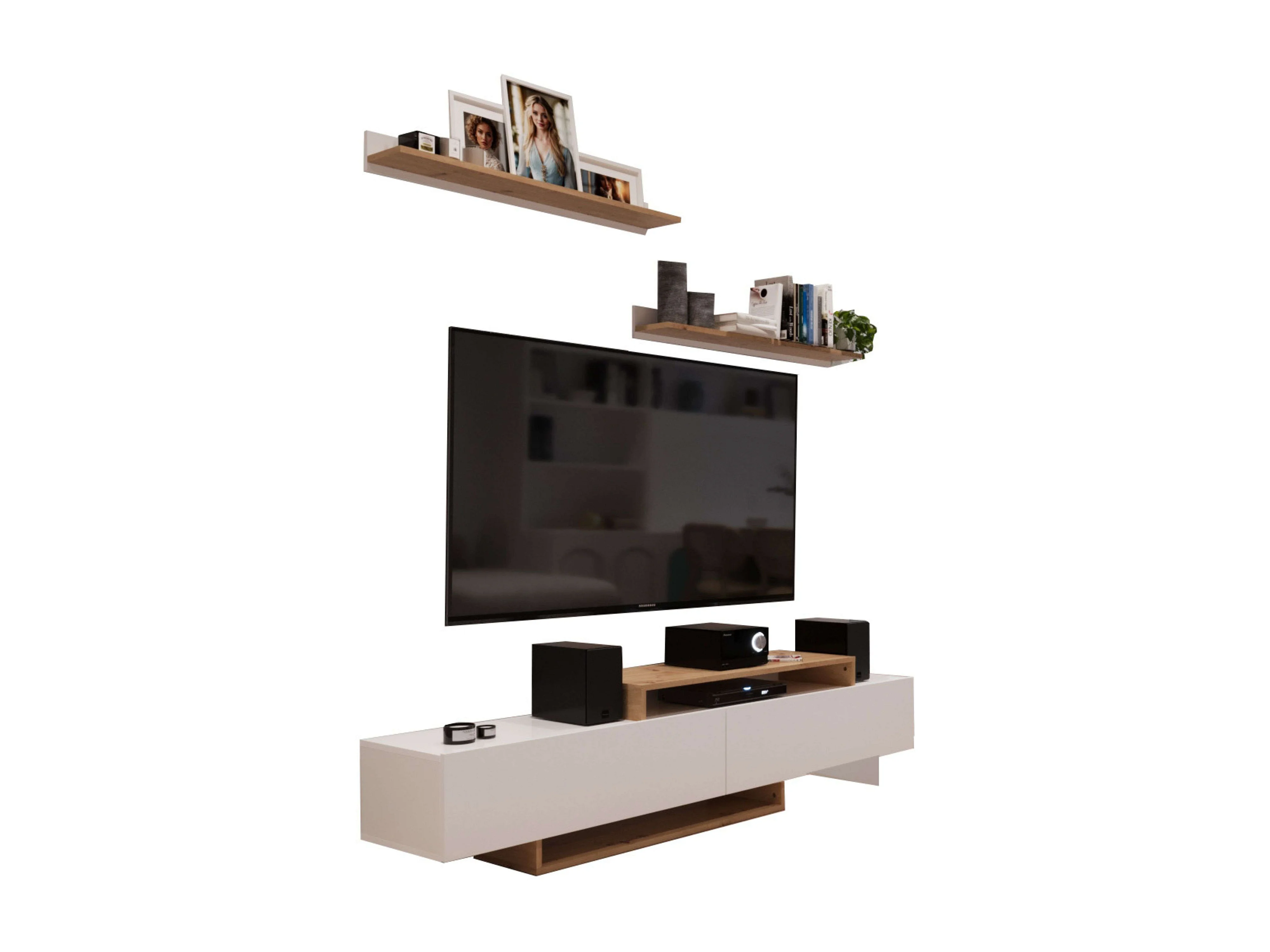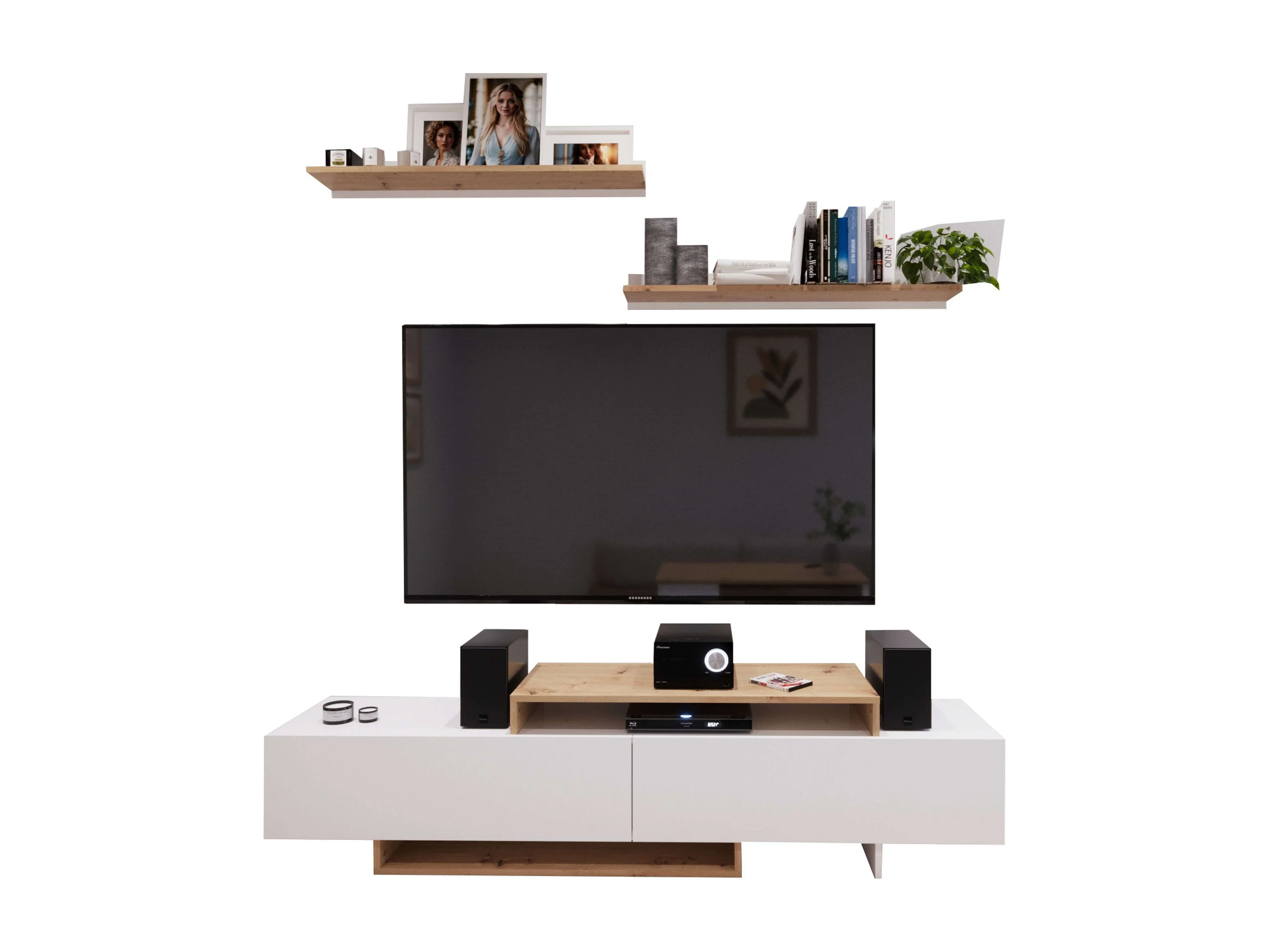 Meuble TV de salon Opole avec 2 portes pliantes, blanc et chêne clair, 180 cm