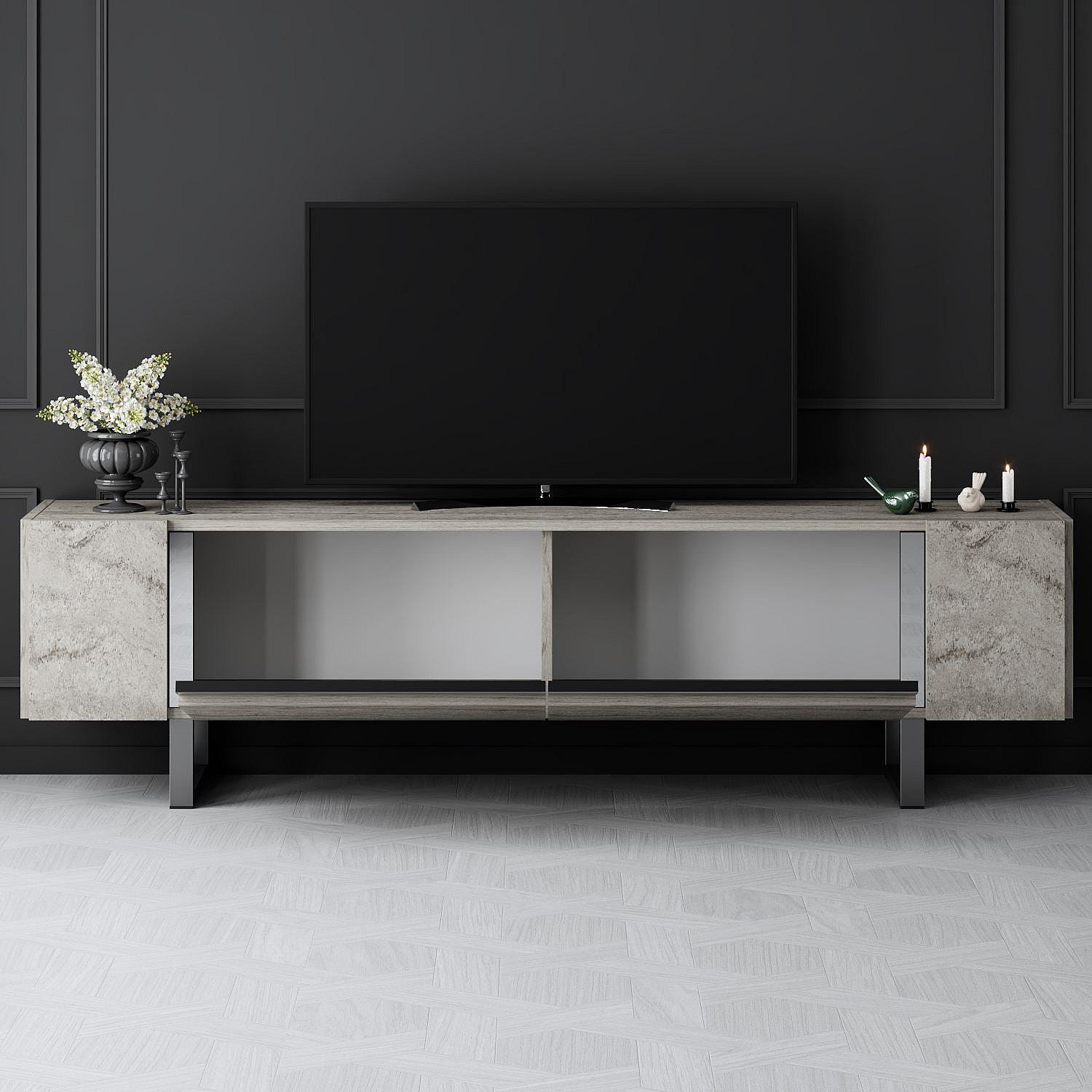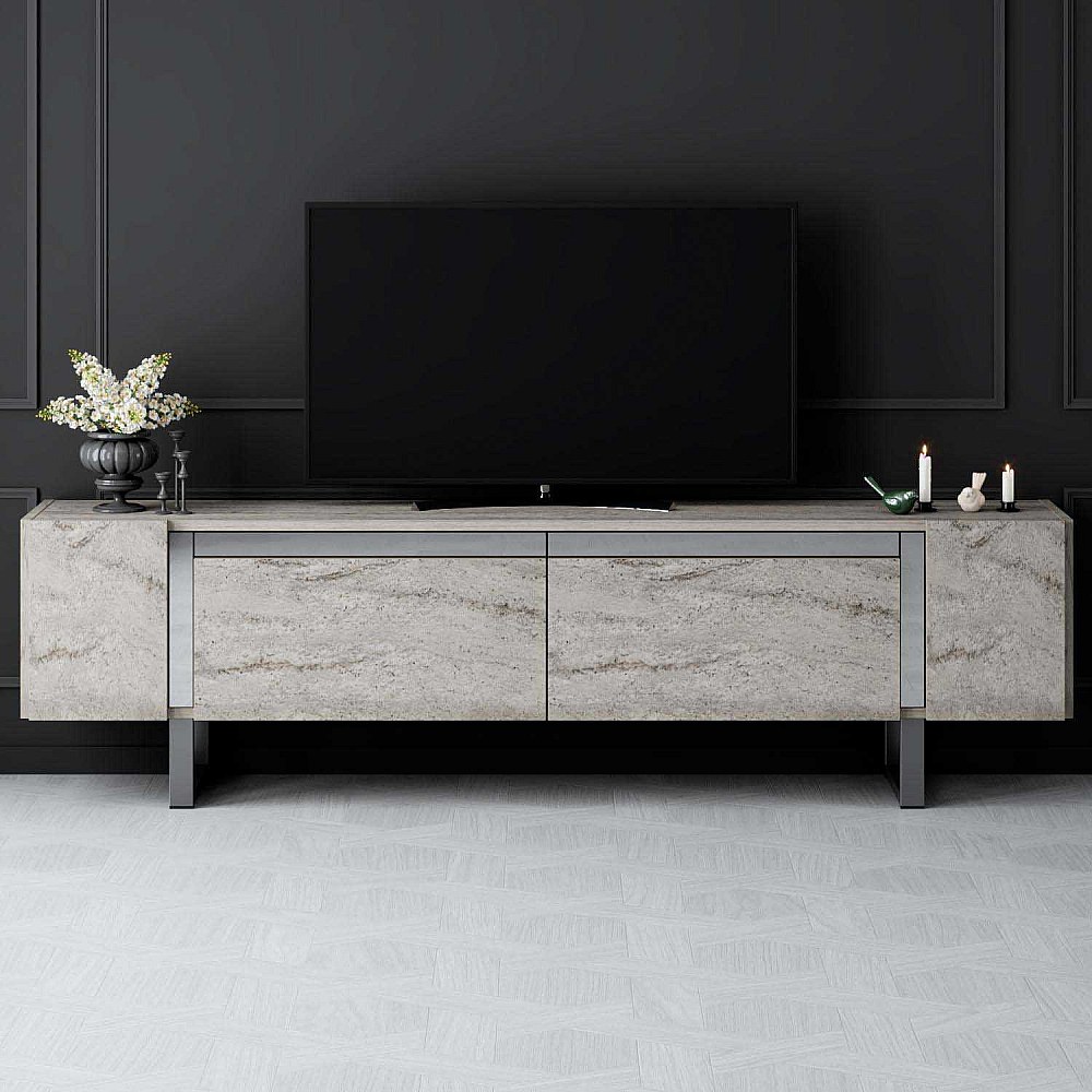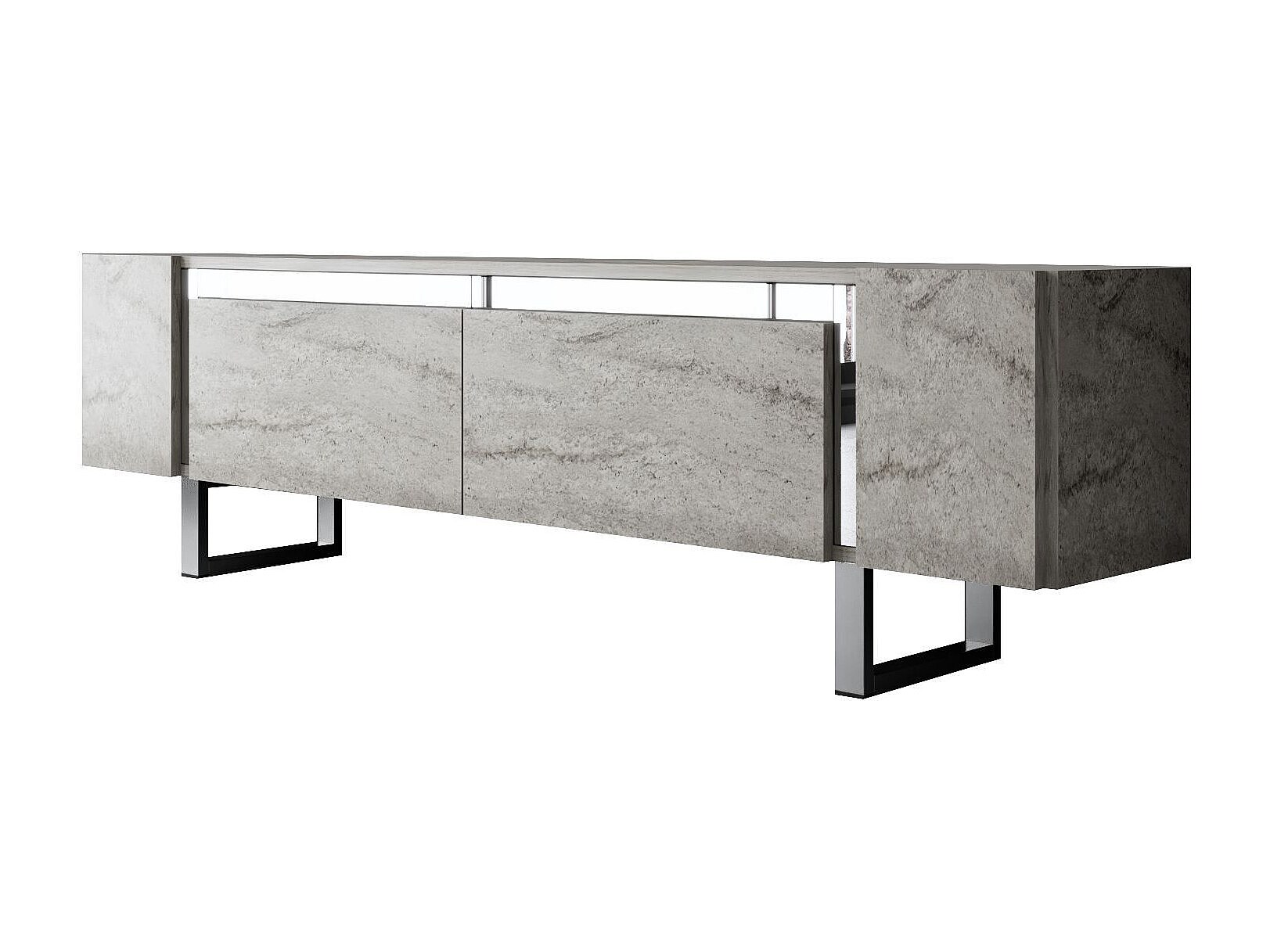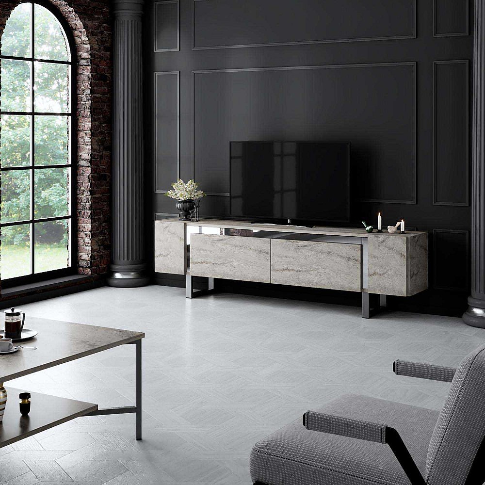 Meuble Tv design 2 portes basculantes Merany L180cm Bois Effet travertin beige et Métal Argent