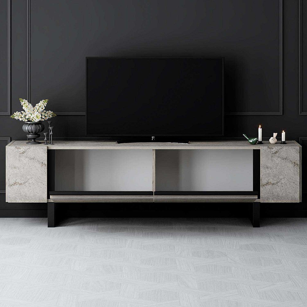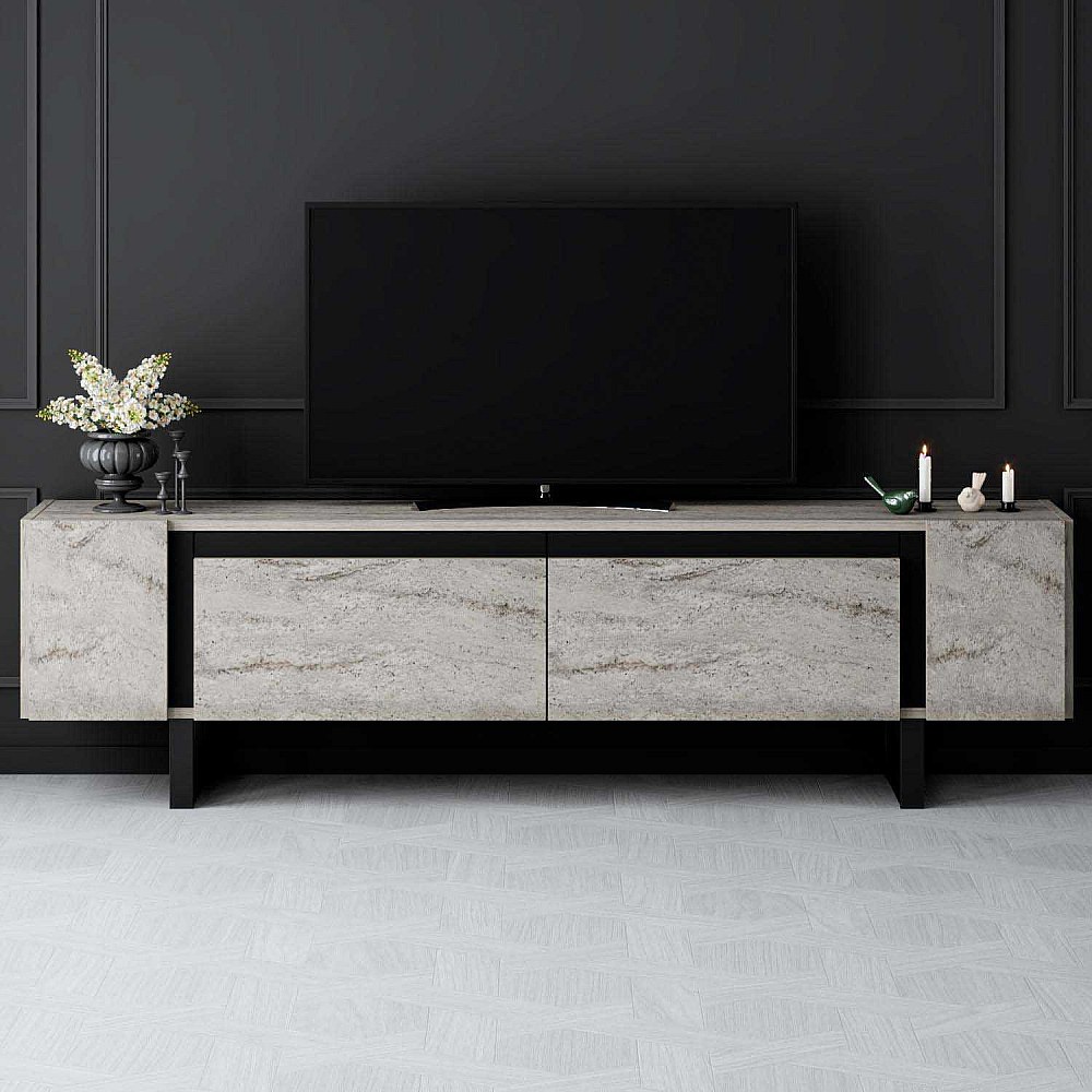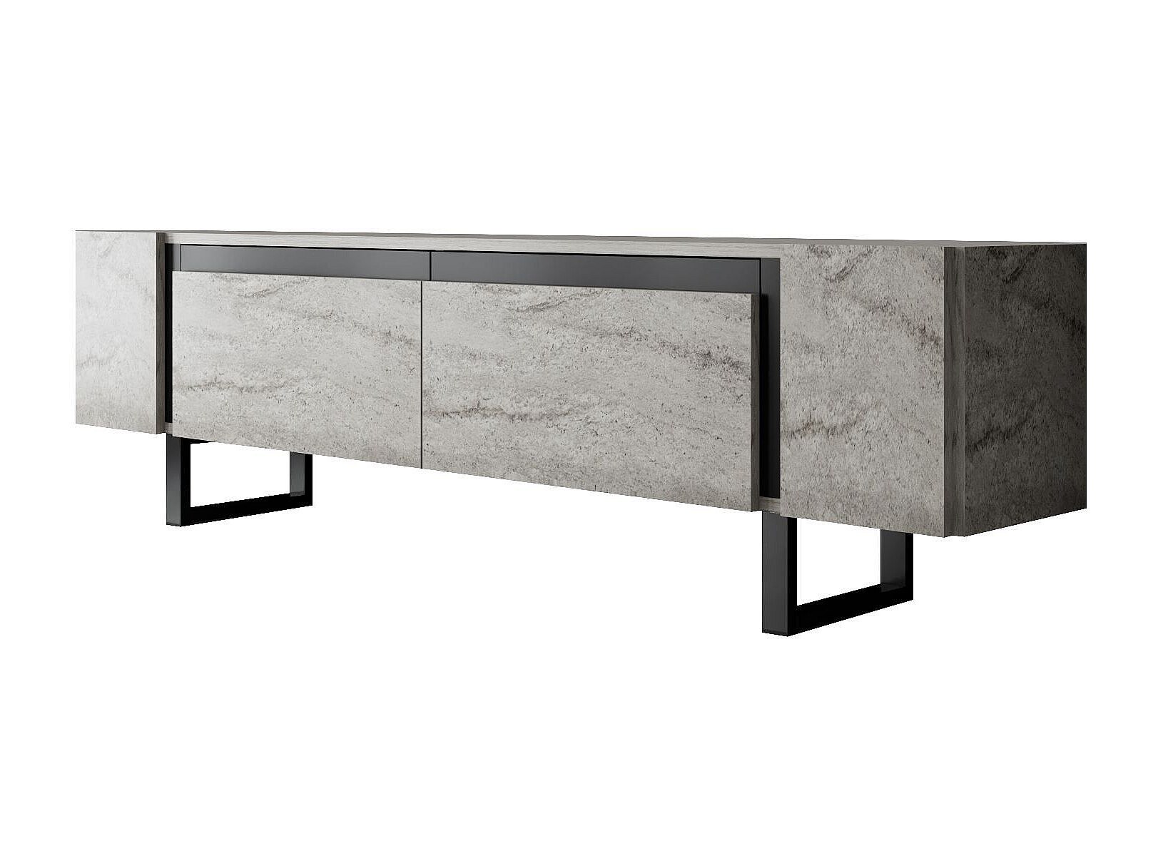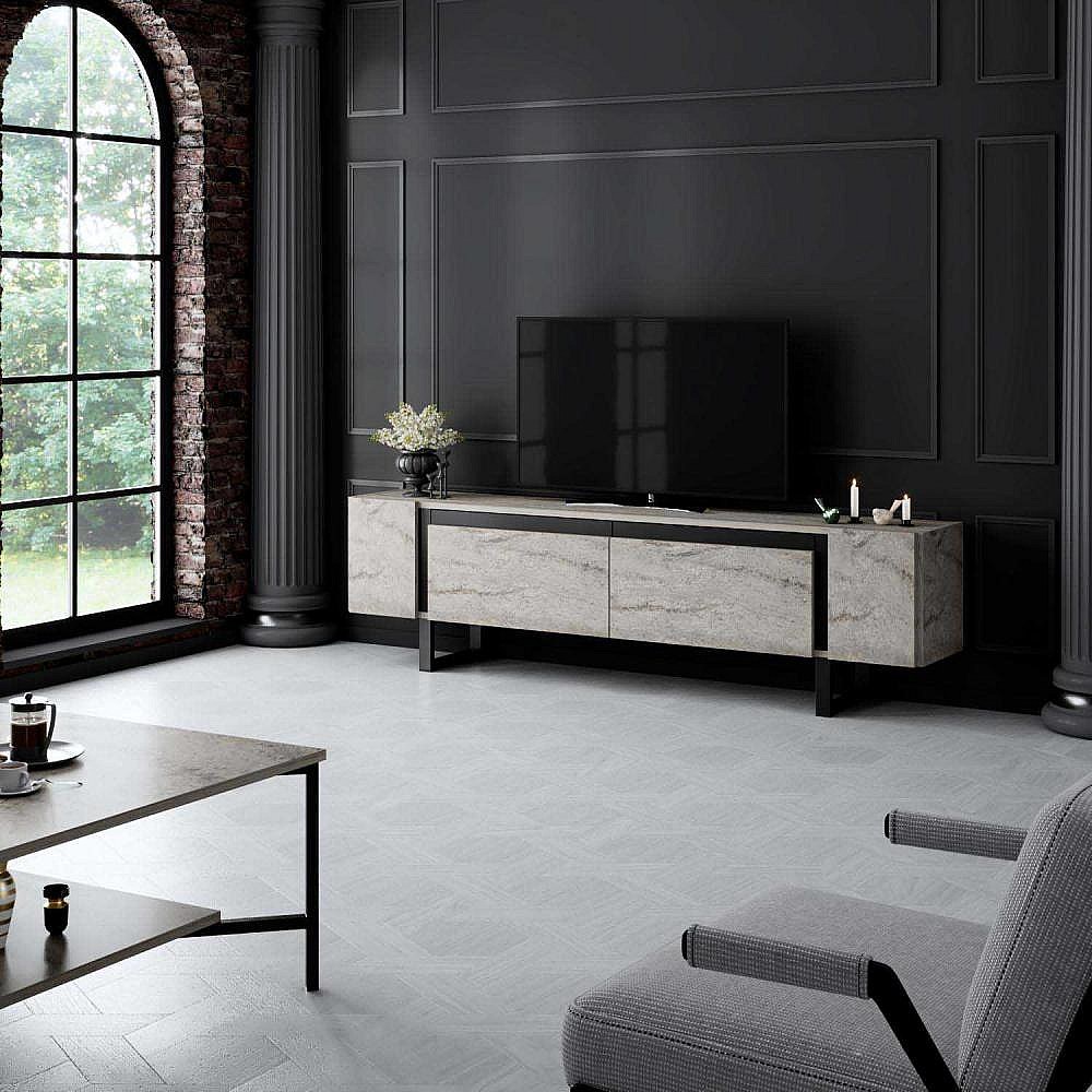 Meuble Tv design 2 portes basculantes Merany L180cm Bois Effet travertin beige et Métal Noir