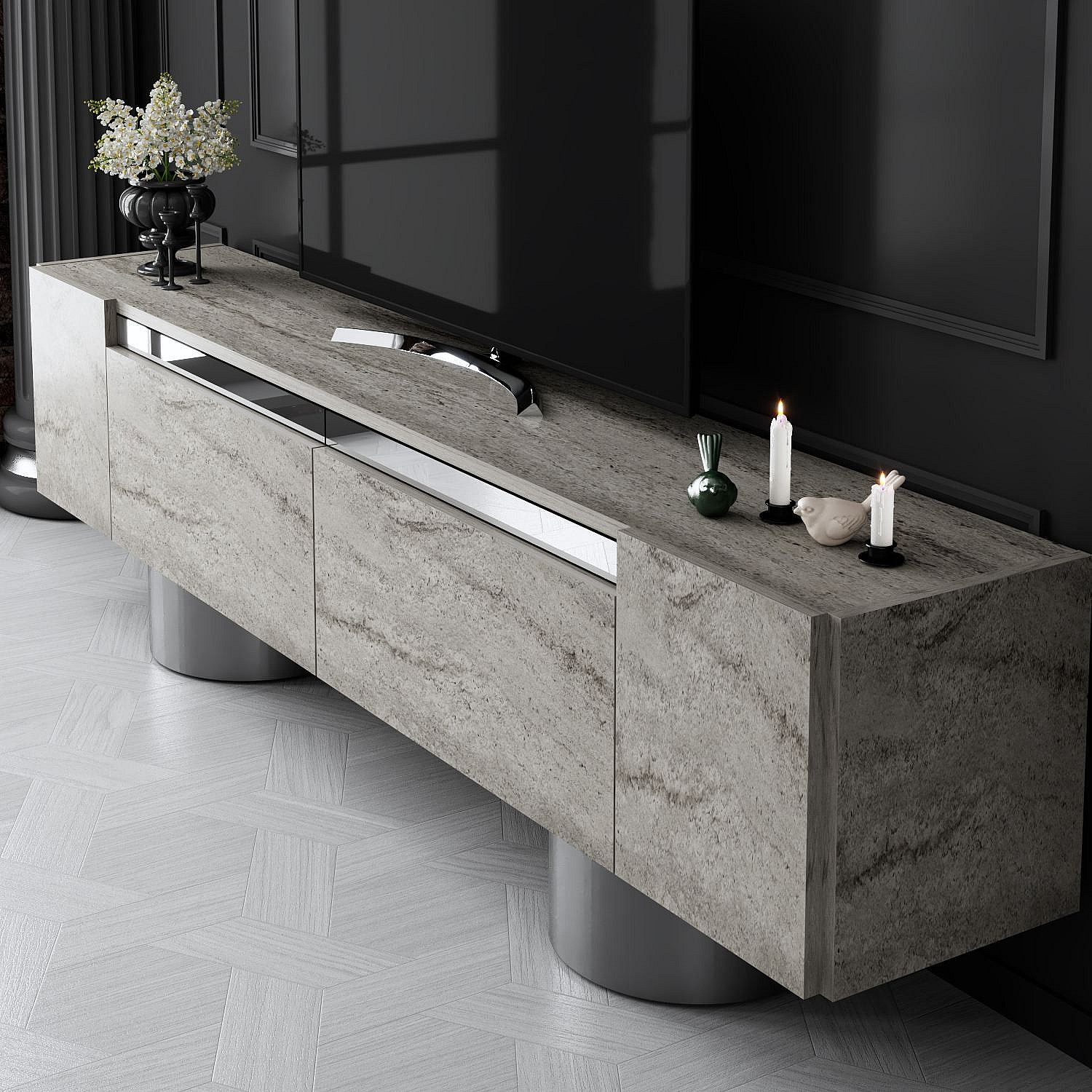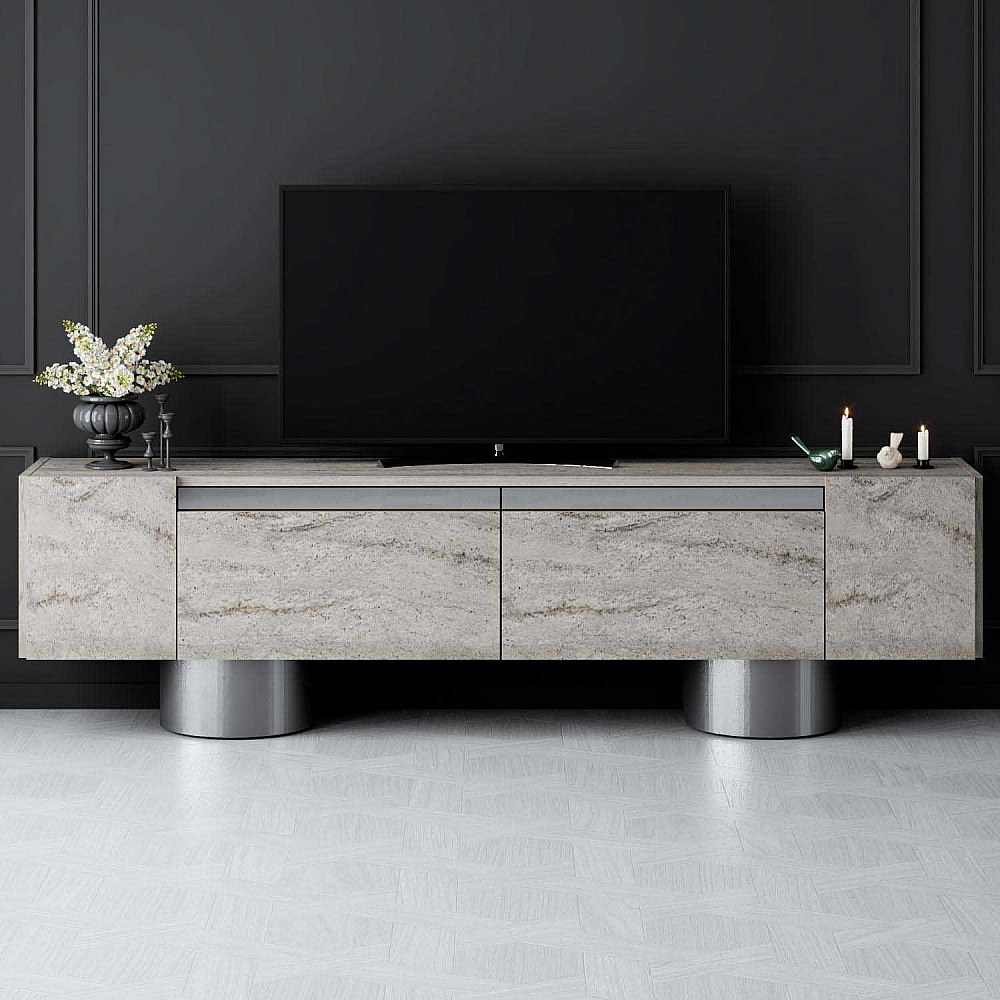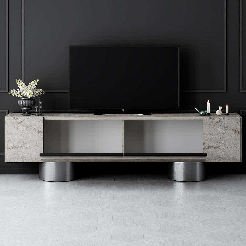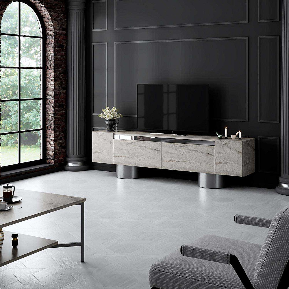 Meuble Tv design 2 portes basculantes Merna L180cm Bois Effet travertin beige et Métal Argent