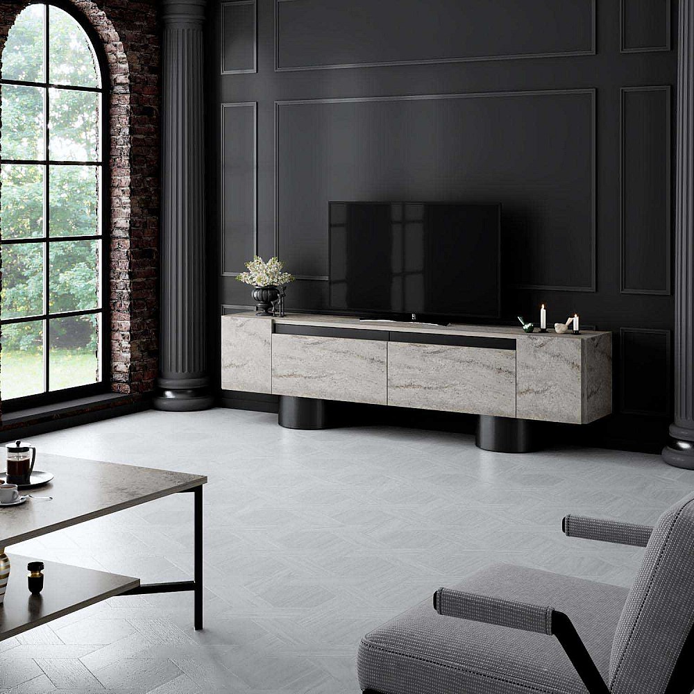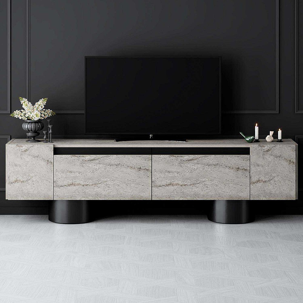Meuble Tv design 2 portes basculantes Merna L180cm Bois Effet travertin beige et Métal Noir