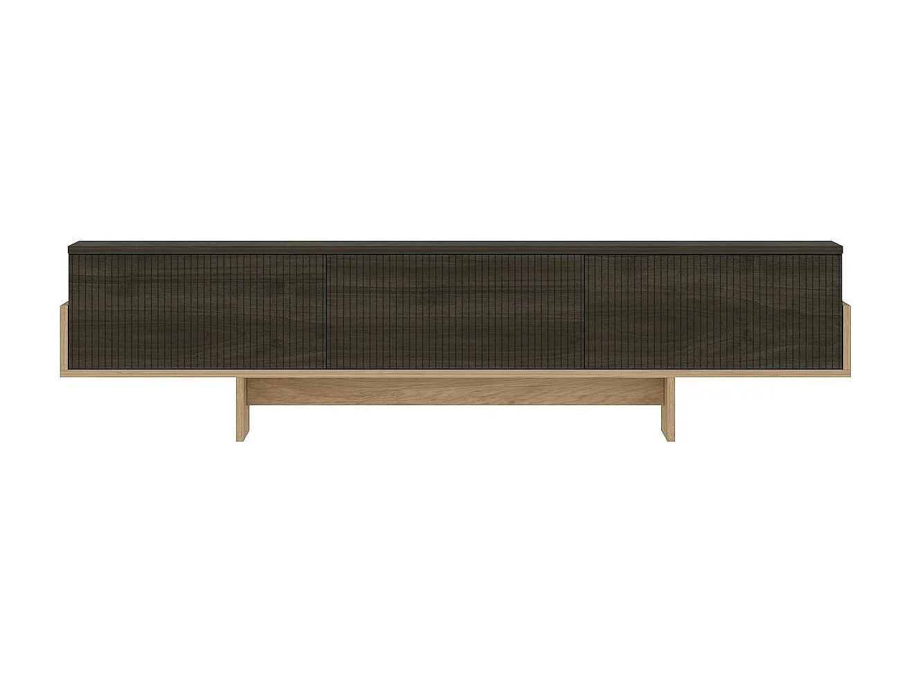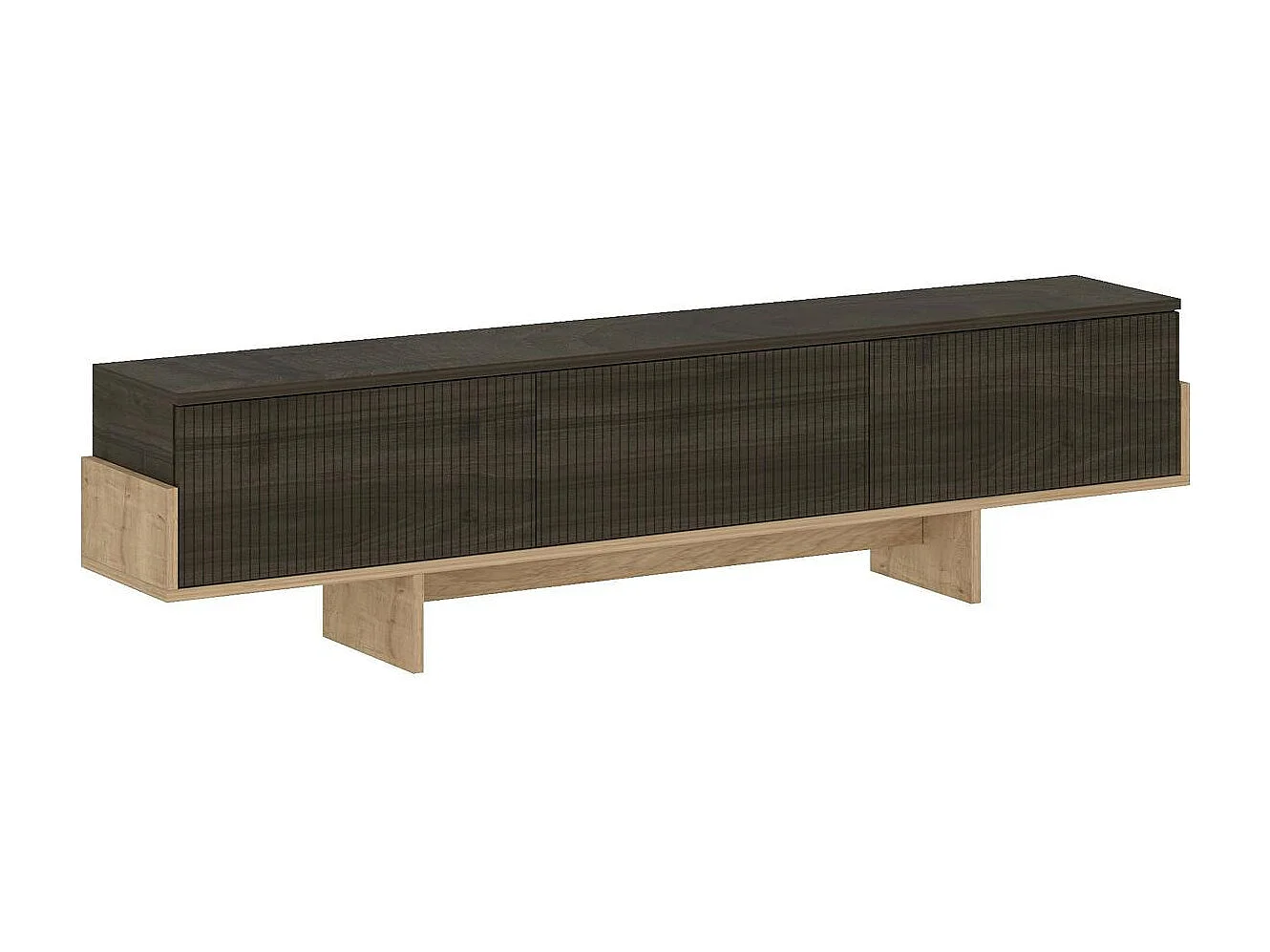 Meuble TV design 3 portes striées effet bois foncé cadre clair MARFA