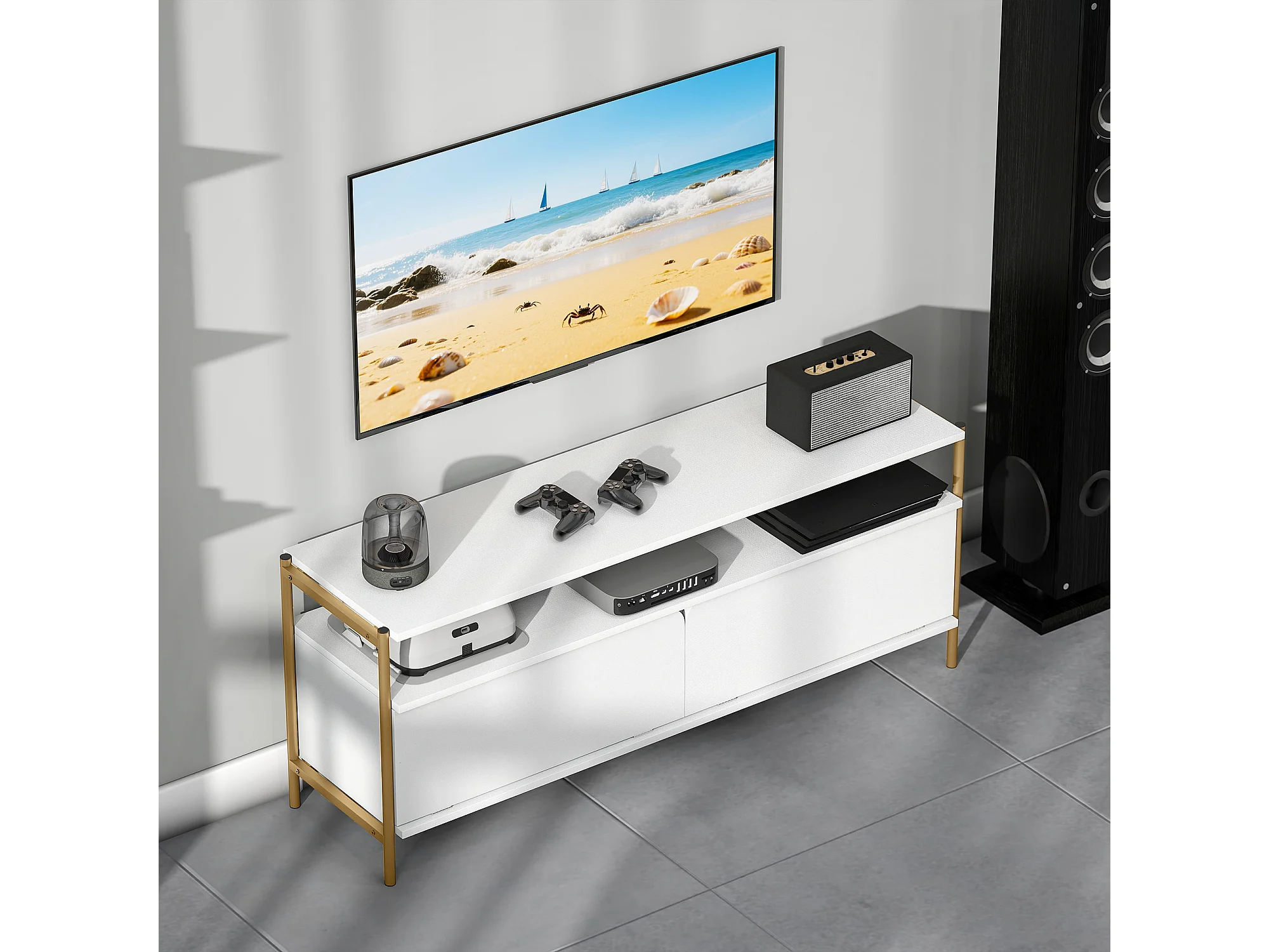 Meuble TV design Art déco 2 portes battantes étagère dim. 124 x 35 x 50 cm acier doré effet bois blanc