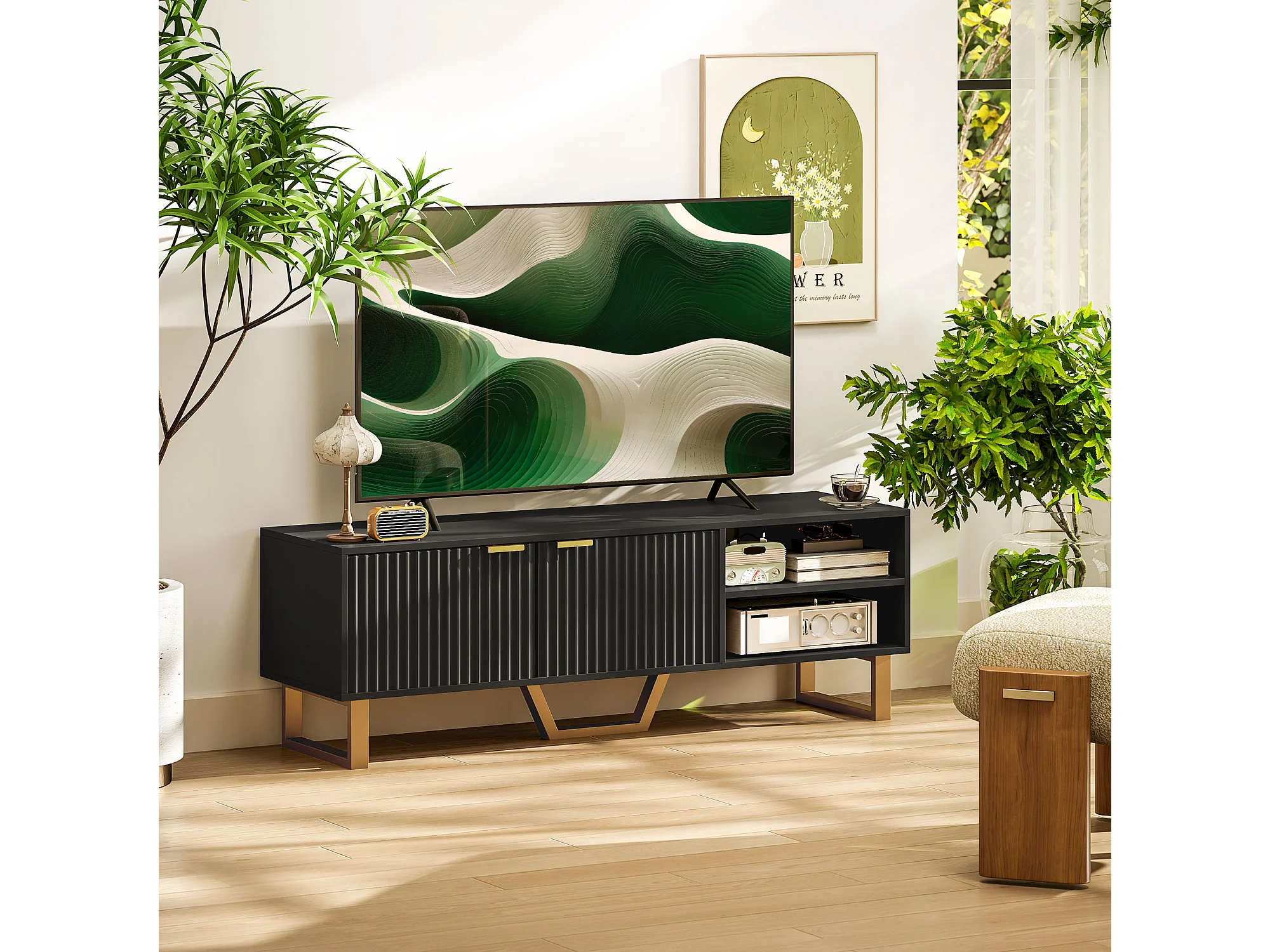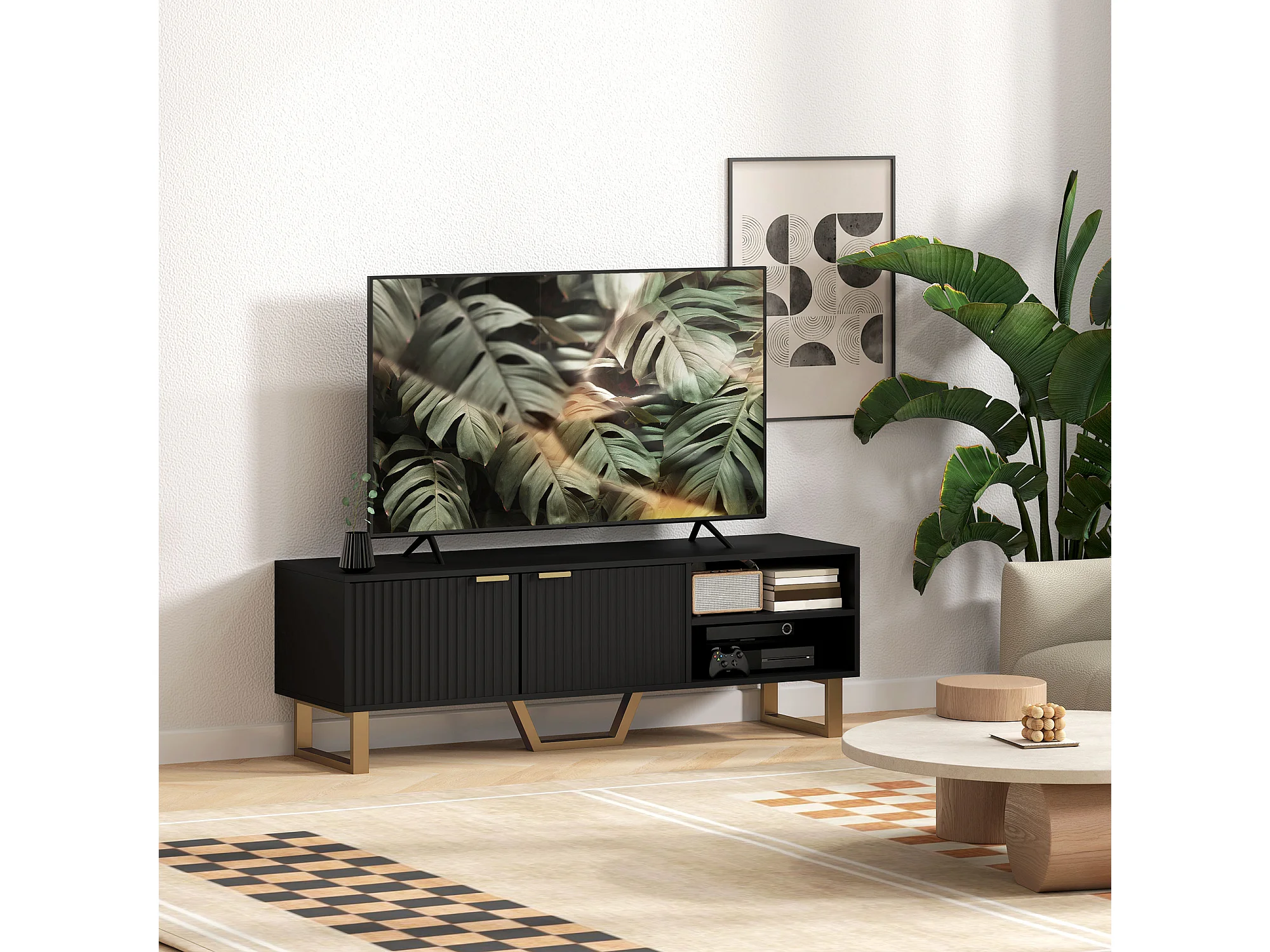 Meuble TV design contemporain 2 portes effet cannelé 2 niches piètement poignées métal doré MDF noir