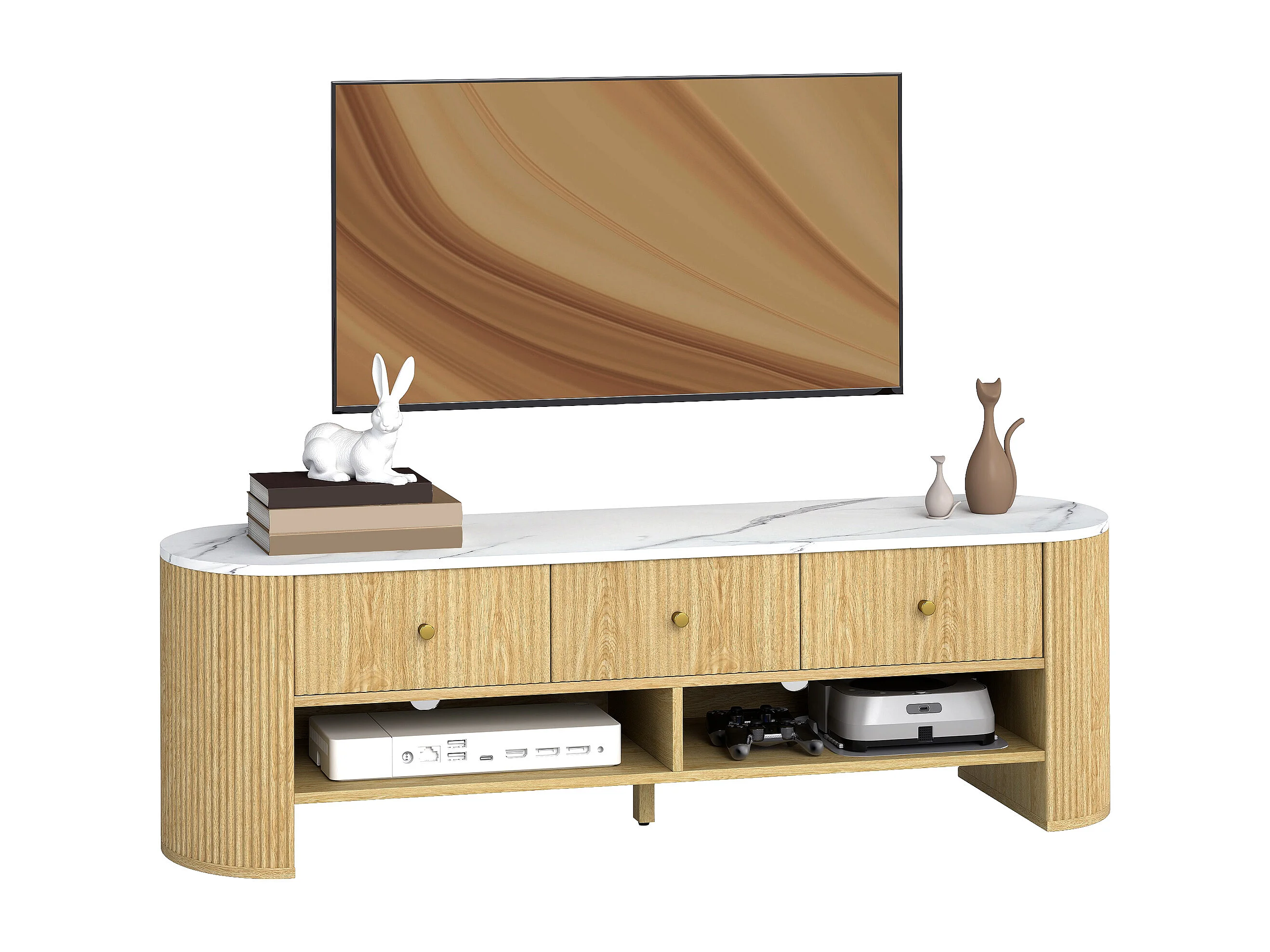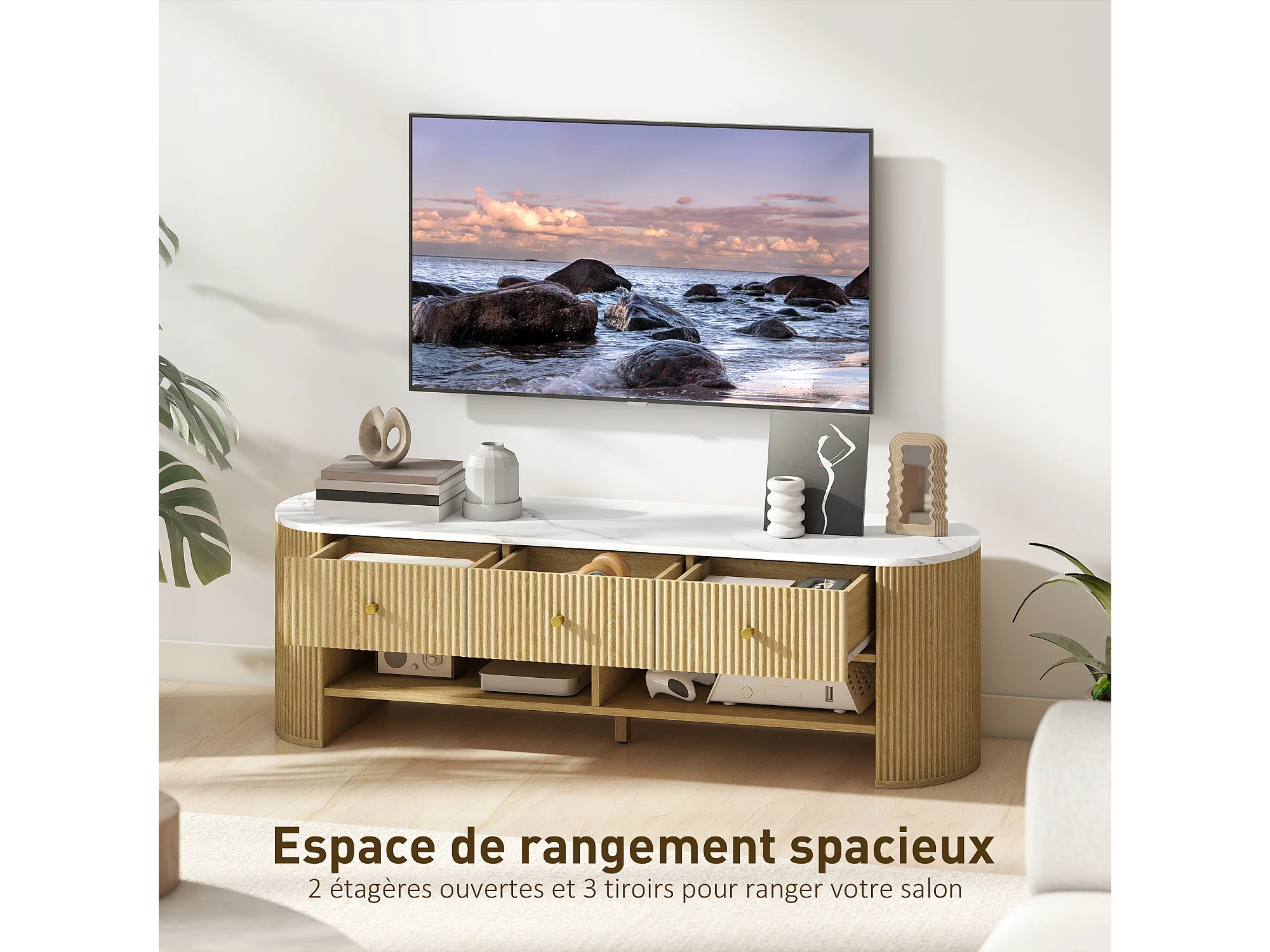 Meuble TV design ovale effet marbre blanc 140 x 40 x 43 cm 3 tiroirs 2 niches aspect bois clair