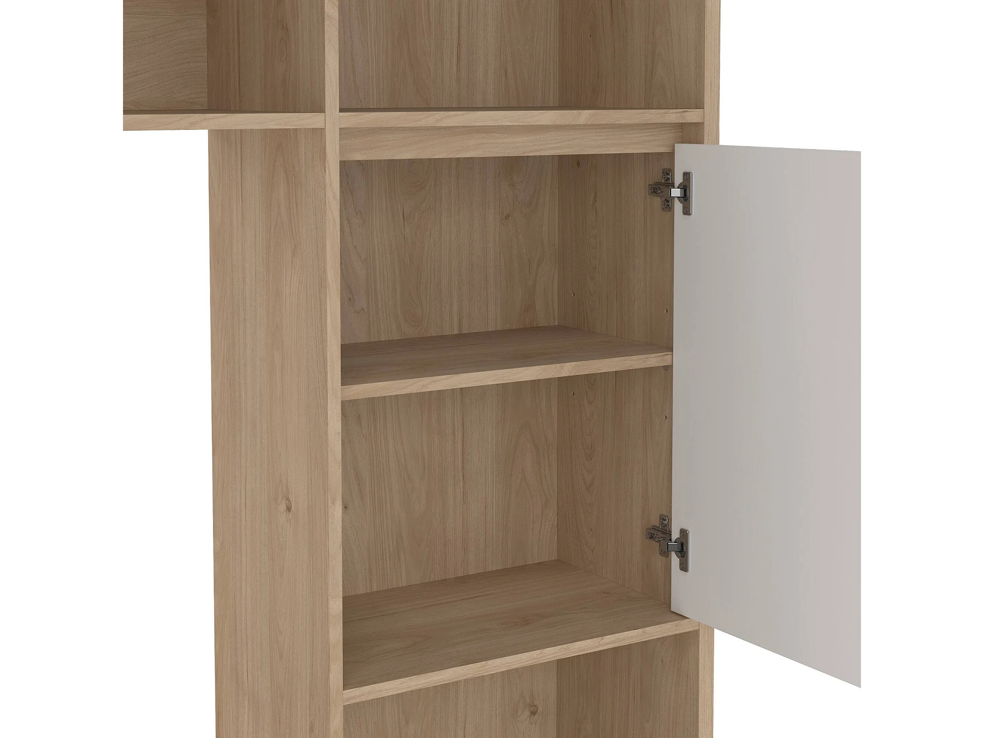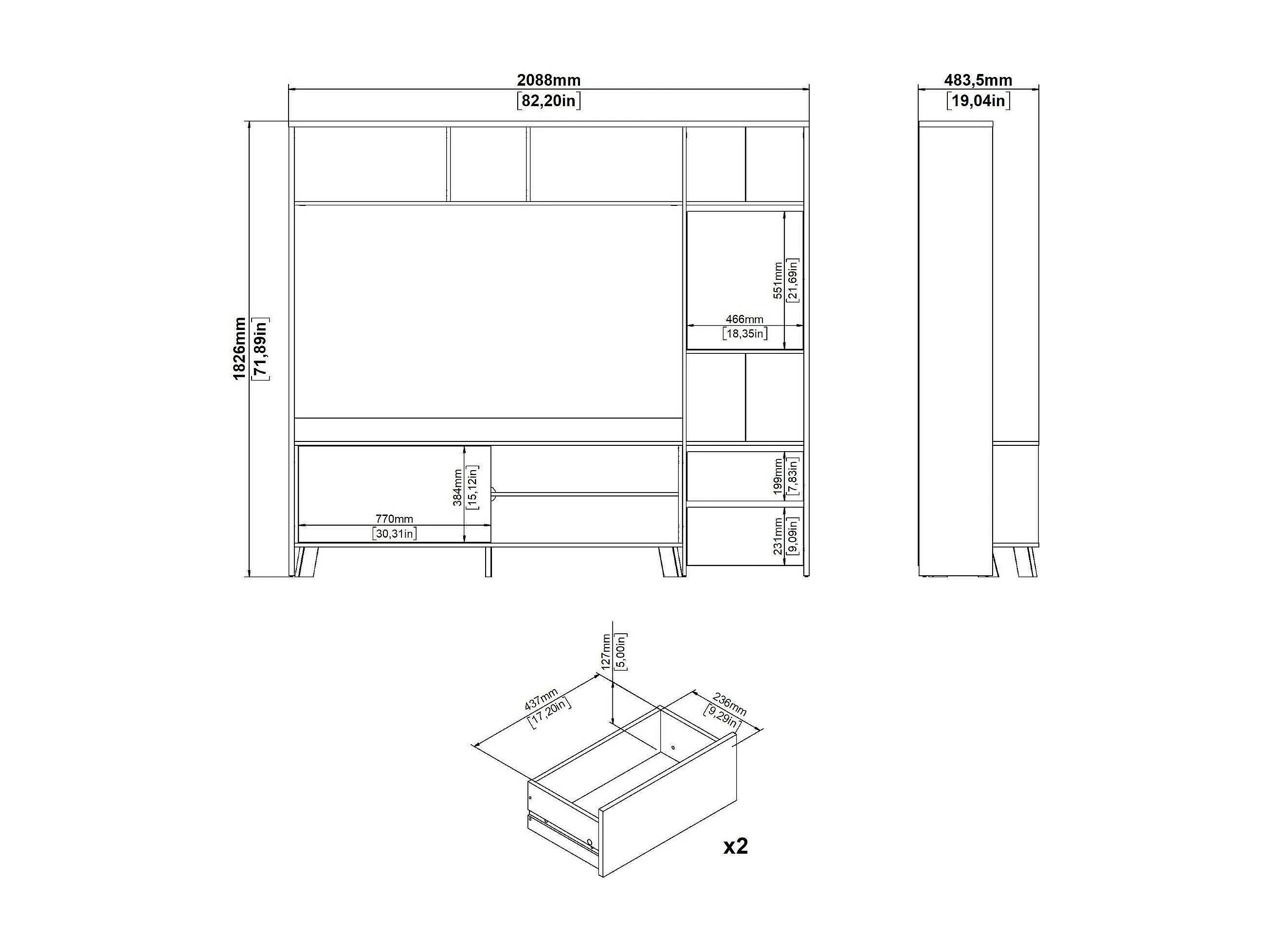 Meuble TV Dtolja, Buffet de salon, Armoire basse pour TV, Base murale de rangement, 209x48 h183 cm, Chêne clair et Blanc