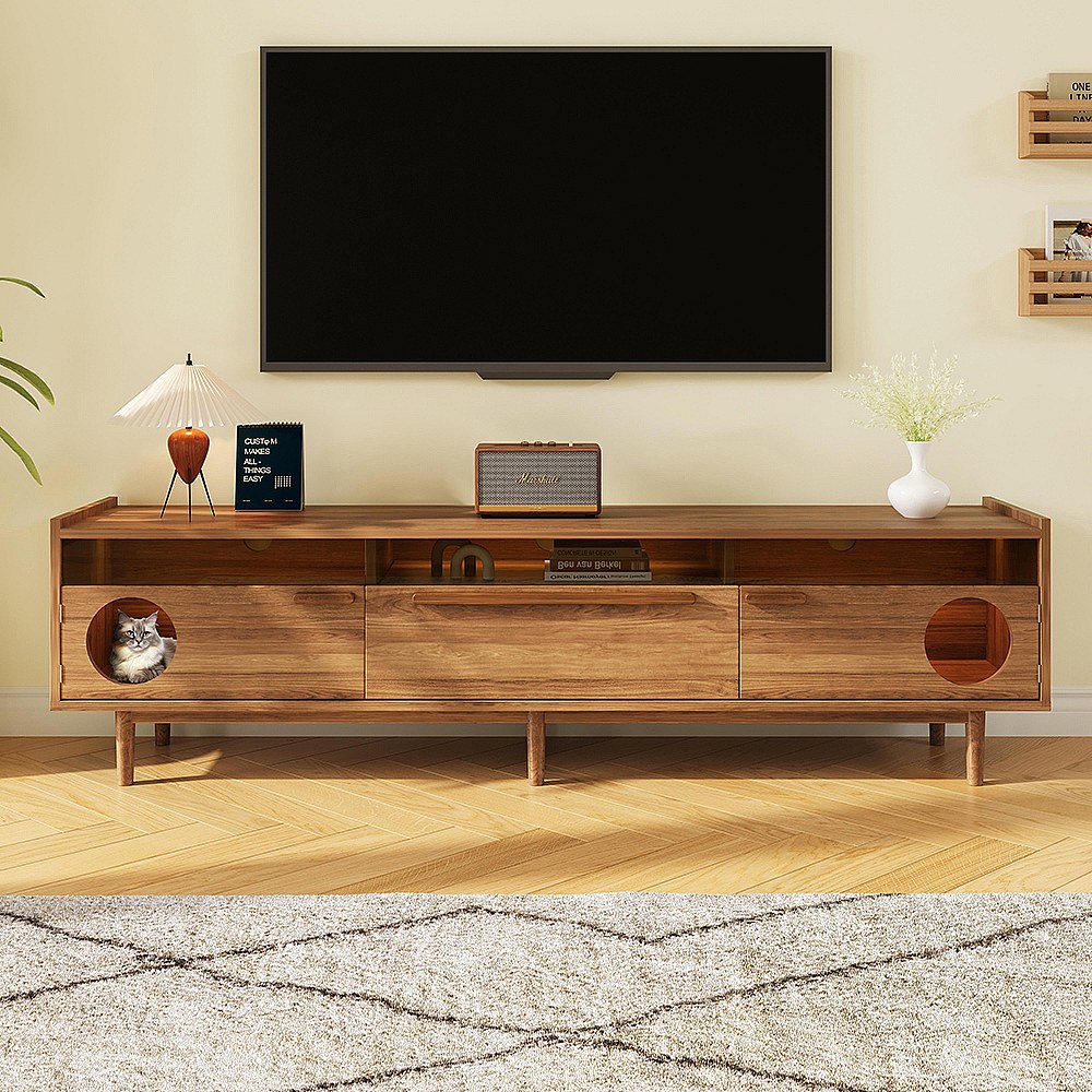 Meuble TV pivotant polyvalent extensible animaux portes verre acier espace repos chat noyer 180(+80)x40x50 cm