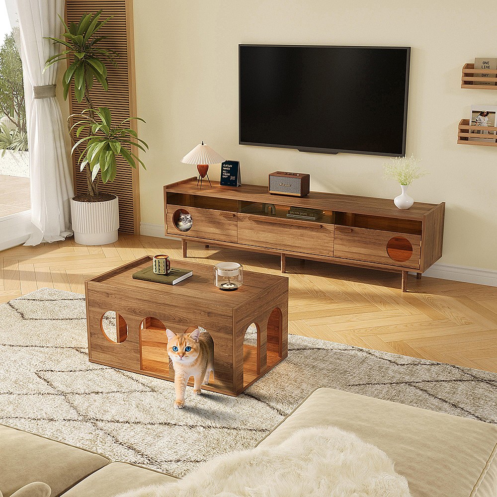 Meuble TV table basse ensemble salon 2 pièces pivotant panier chat noyer