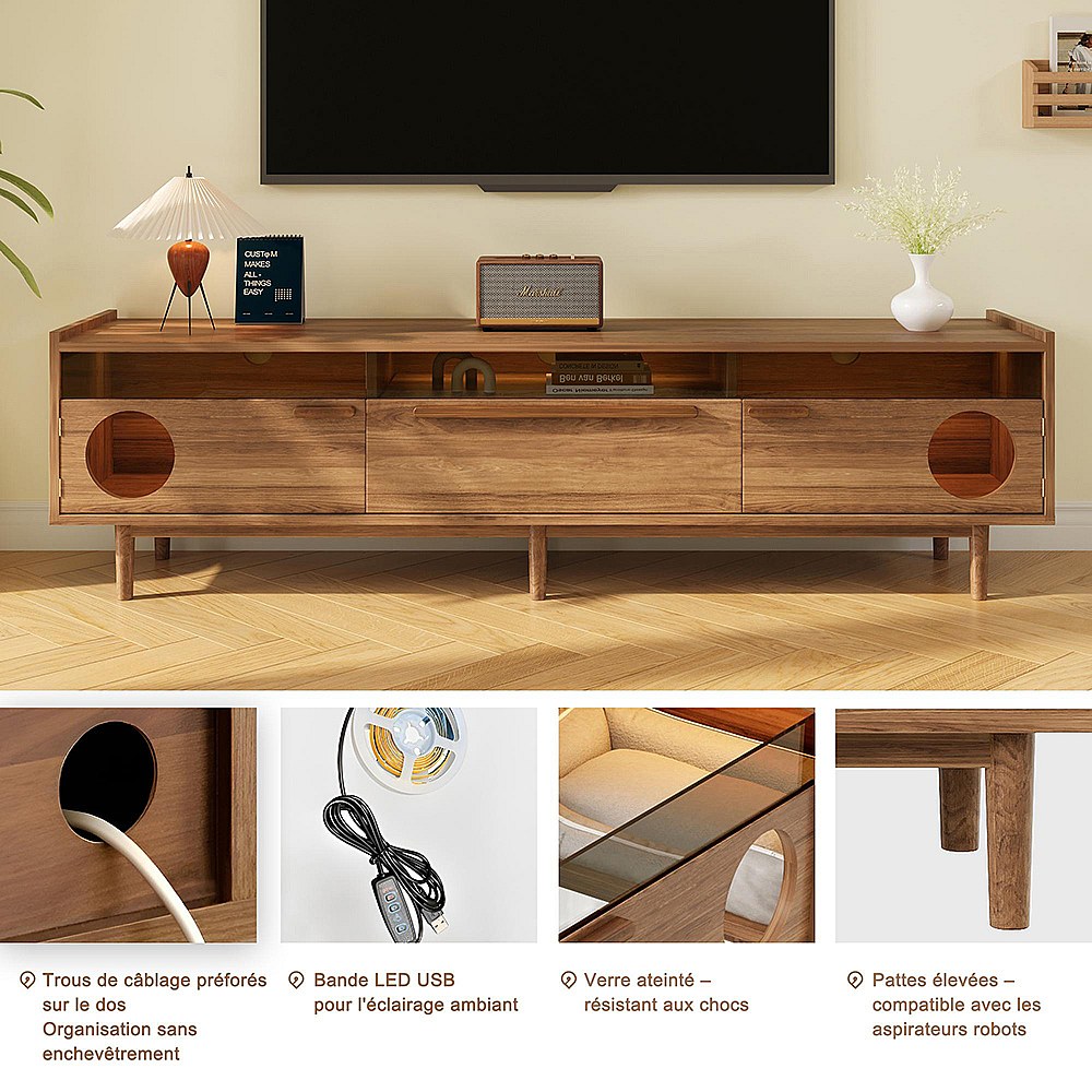 Meuble TV éclairage LED espace repos chat portes verre acier 1 tiroir noyer