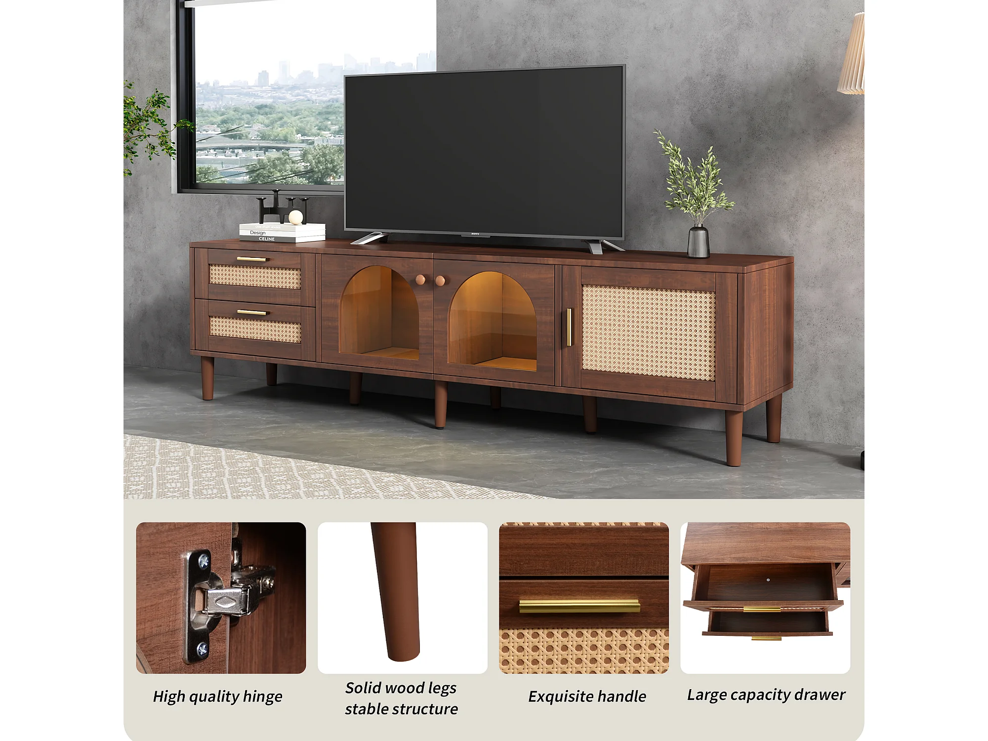 URBAN MEUBLE Meuble TV effet bois marron avec rangement élégant 2 tiroirs en rotin, 2 portes vitrées cintrées et 1 porte en rotin éclairage LED 180cm