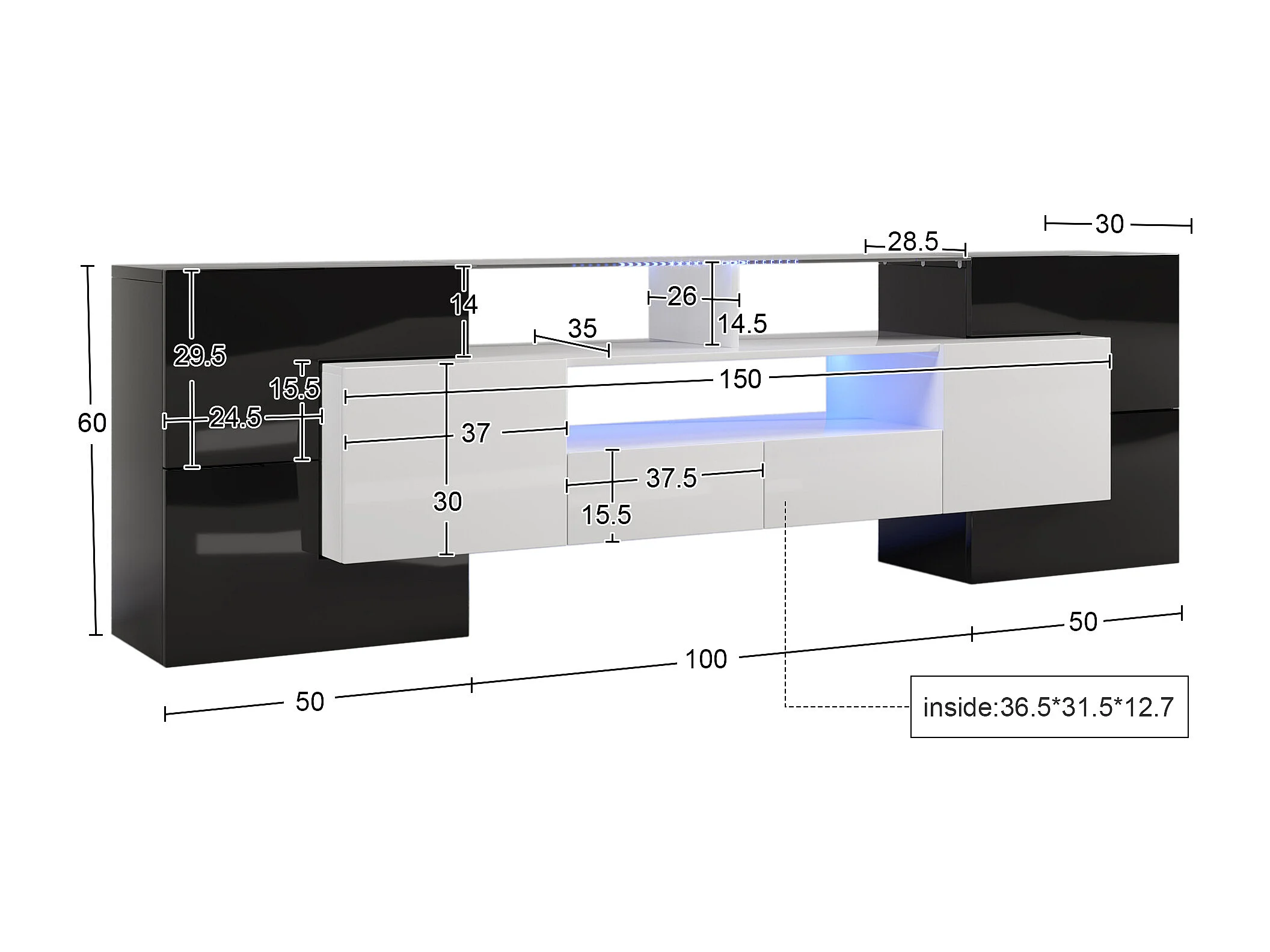 Meuble TV élégant 200 cm blanc/noir brillant avec LED. Design moderne, surface en verre facile à nettoyer, parfait pour salons contemporains