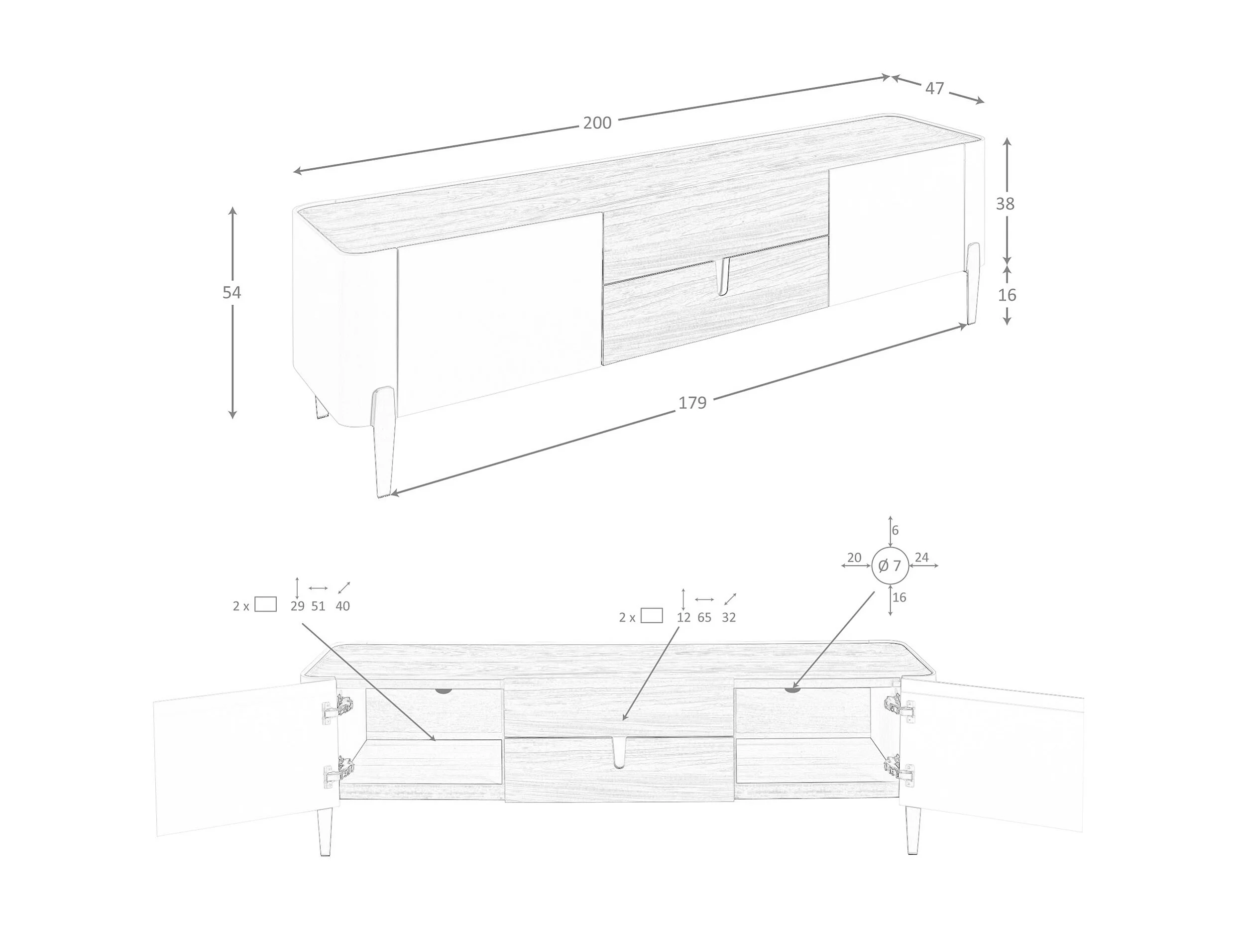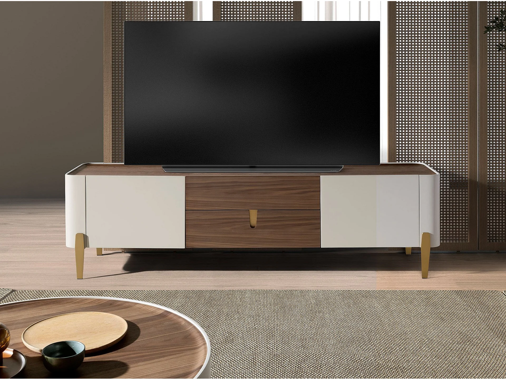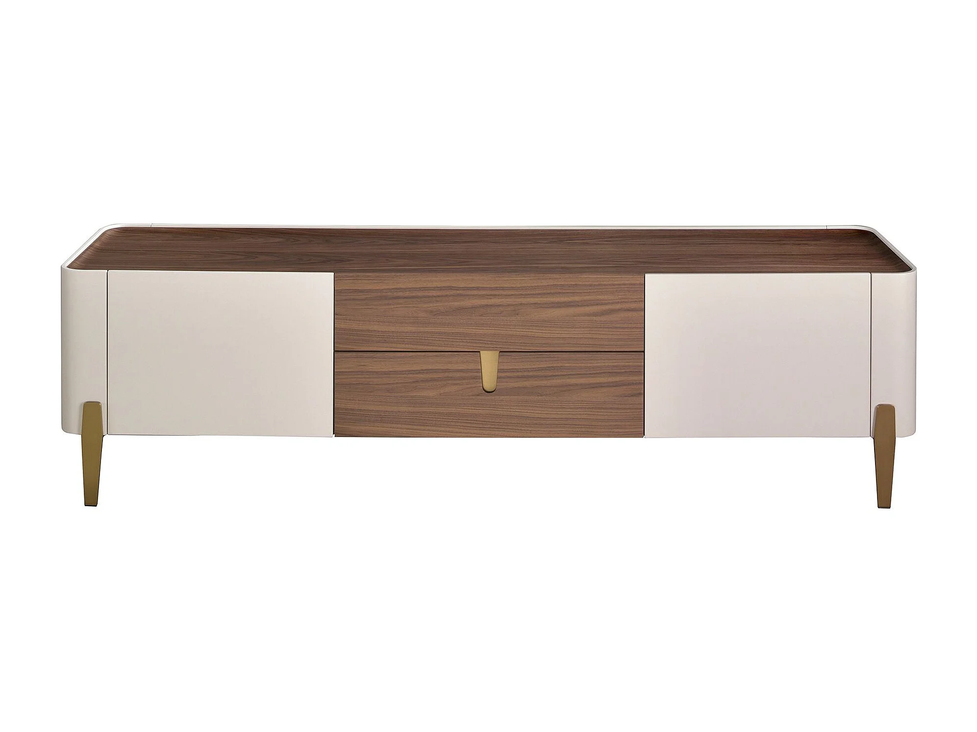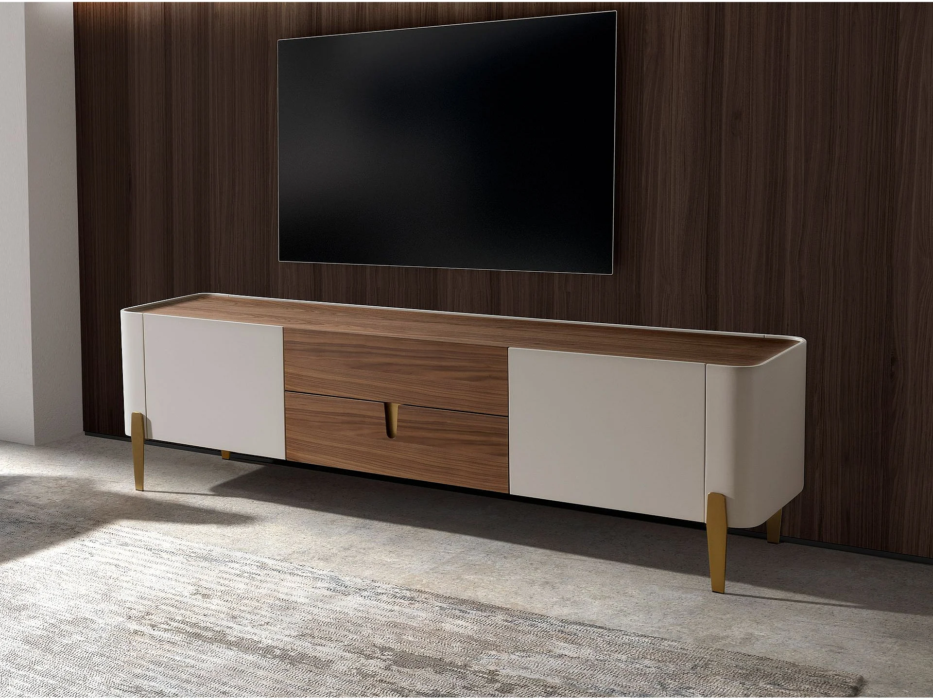 Meuble TV en bois beige, acier poli doré et plateau en noyer 3275 ANGEL CERDA