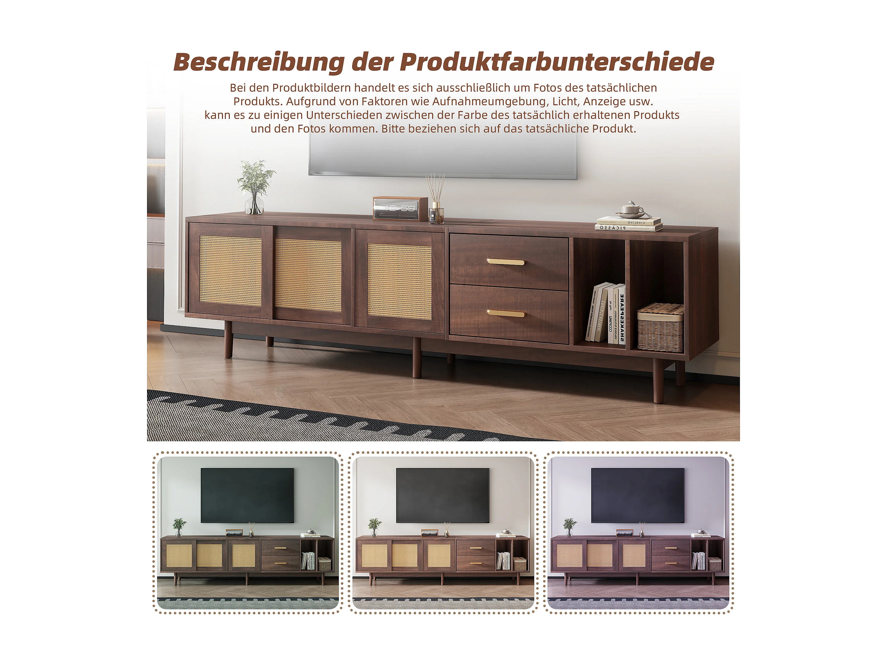 Meuble TV en bois marron avec portes en rotin et tiroirs, support TV pour écran jusqu'à 75 pouces, design avec 6 pieds de soutien, 190x37x52cm