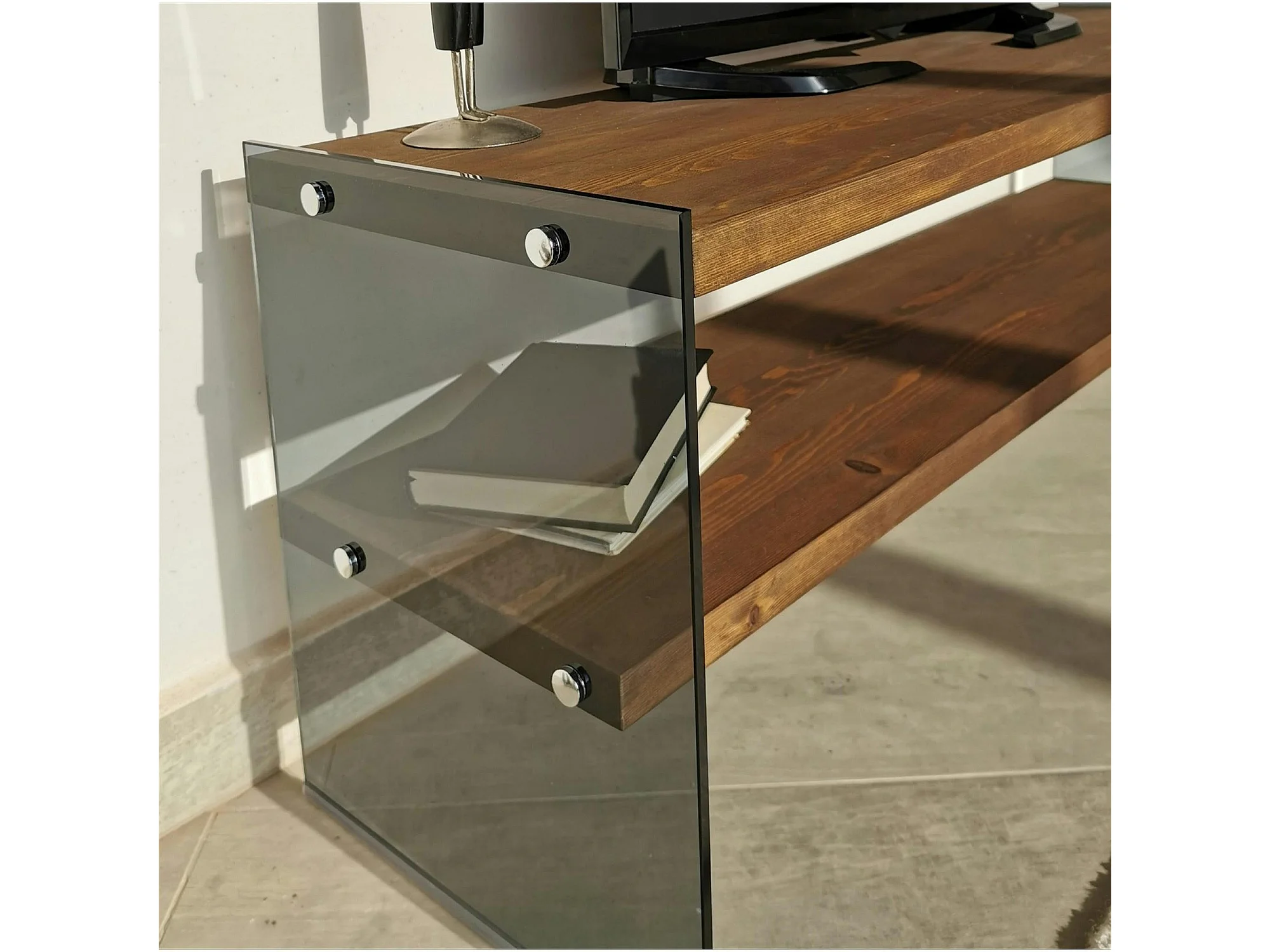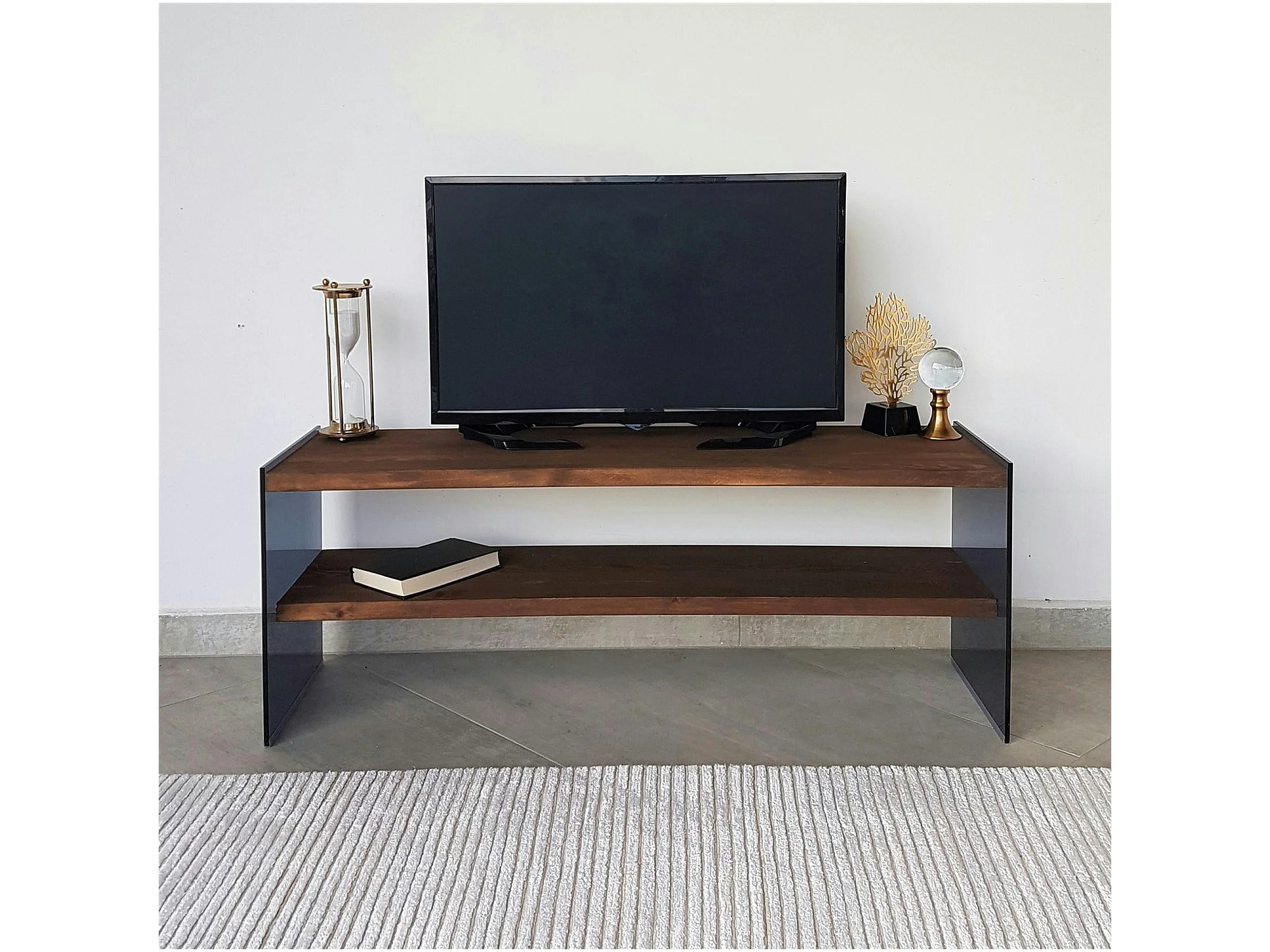 Meuble TV en bois marron et verre fumé - 2 niveaux LHASA