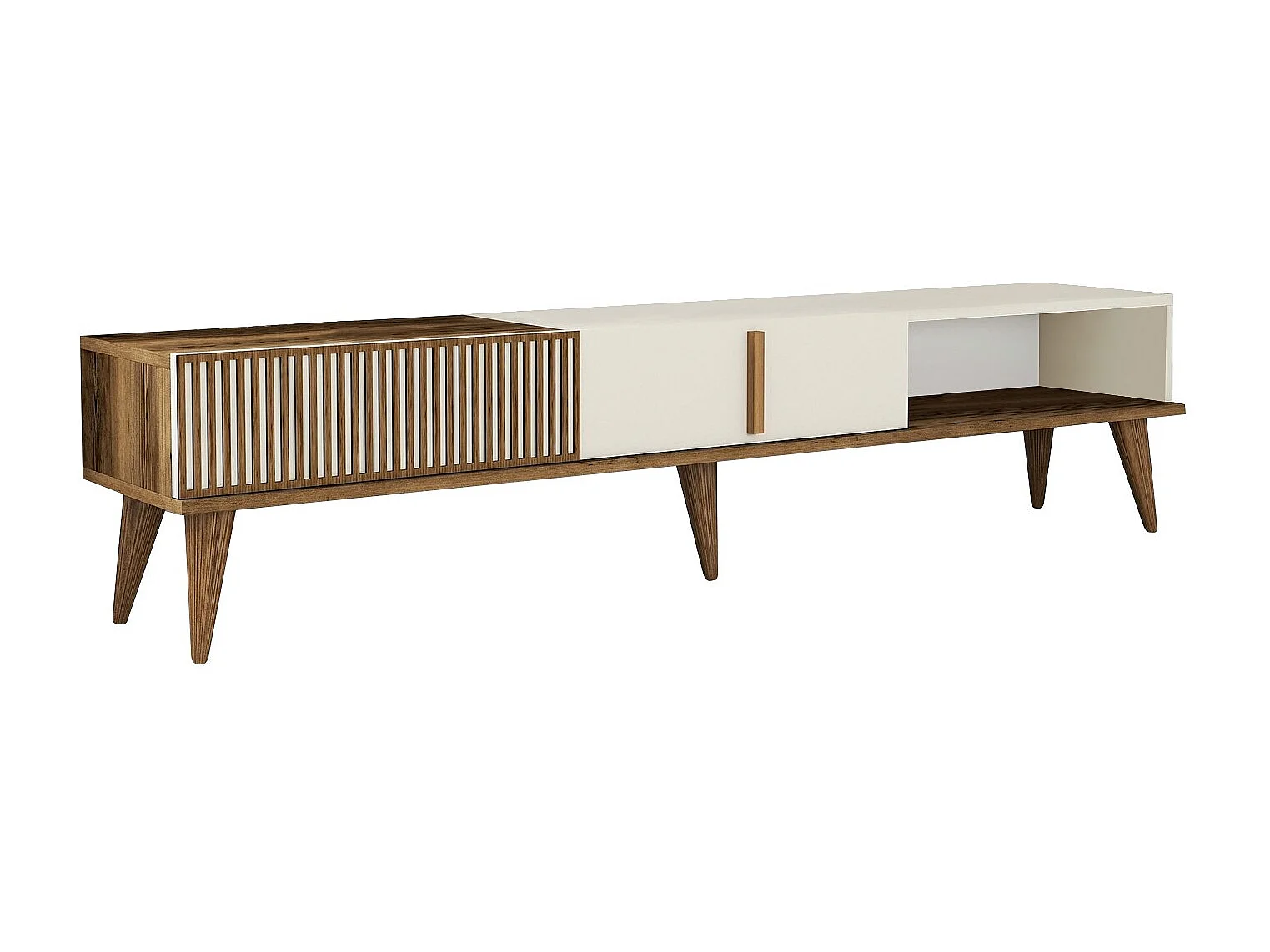 Meuble TV Milan en bois crème de noix 180x35x40 cm, 3 portes, 1 étagère, finition mélamine blanche
