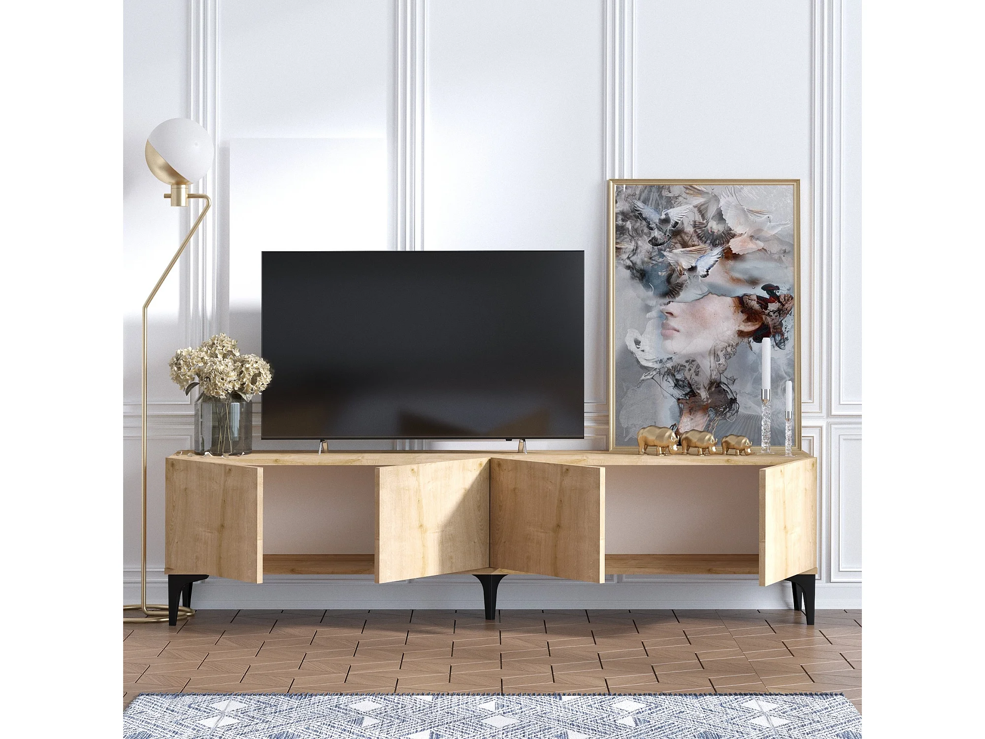 Meuble TV "Nora" en bois Chêne Saphir 180x35x50 cm, 4 portes, style scandinave industriel traditionnel