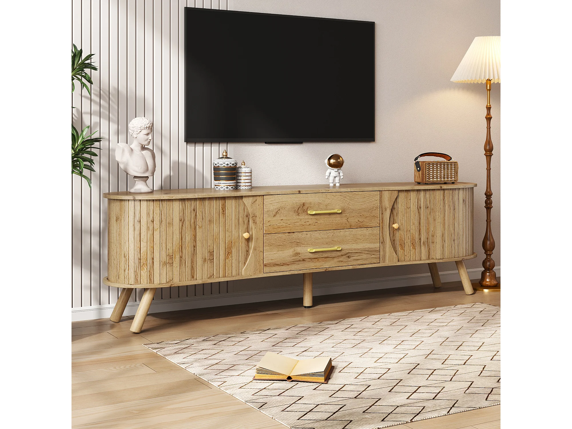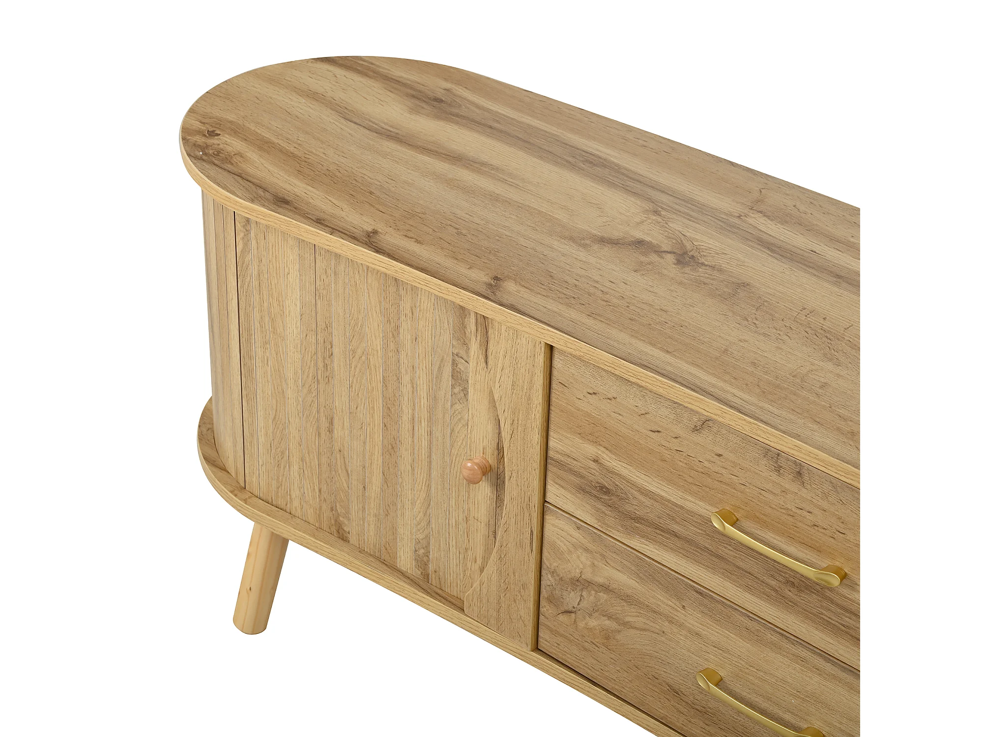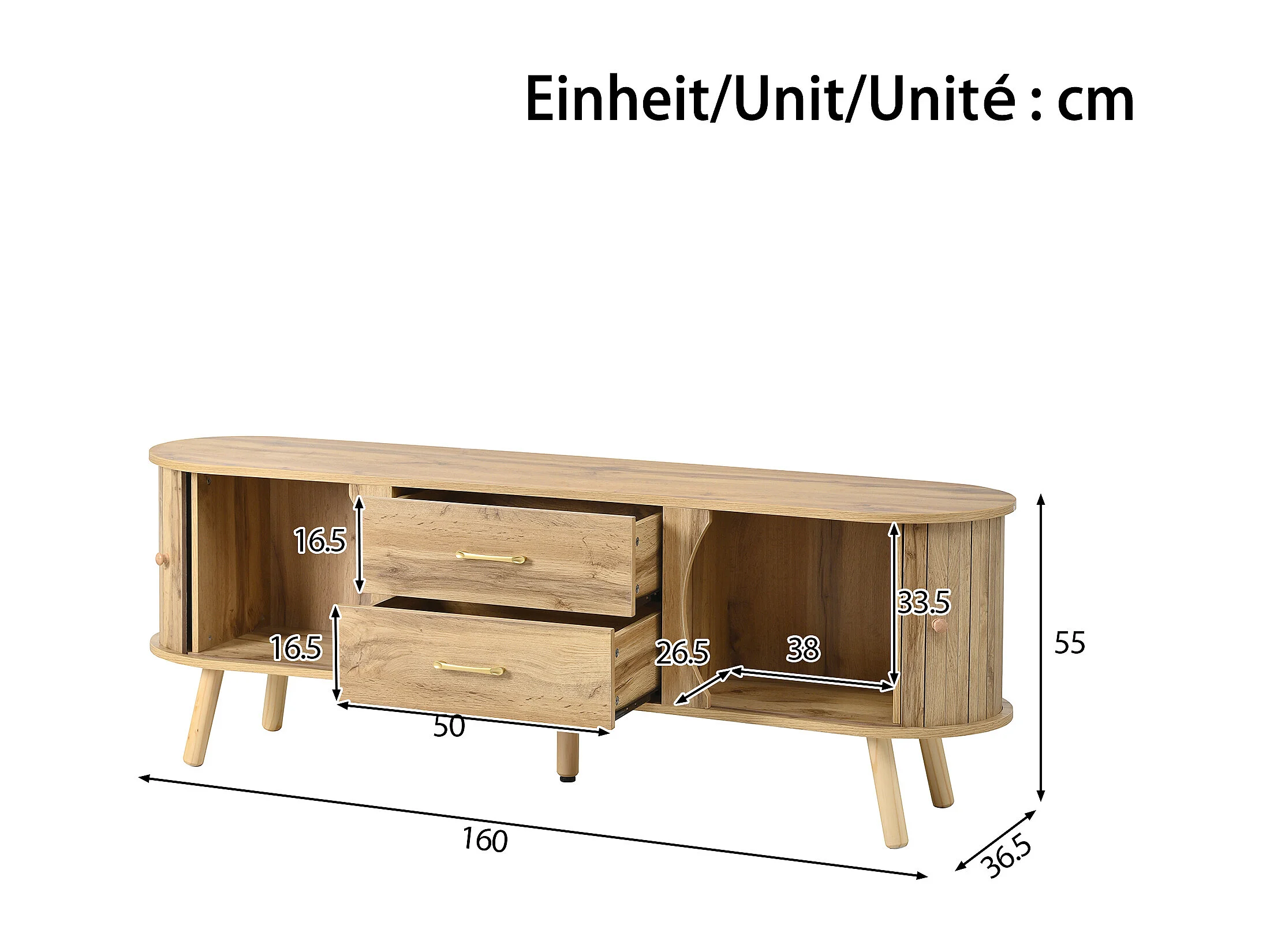 Meuble TV en forme de pois 160x36.5x55 cm - 2 portes coulissantes et 2 tiroirs - Pieds en bois massif - Finition bois - MDF - Naturel