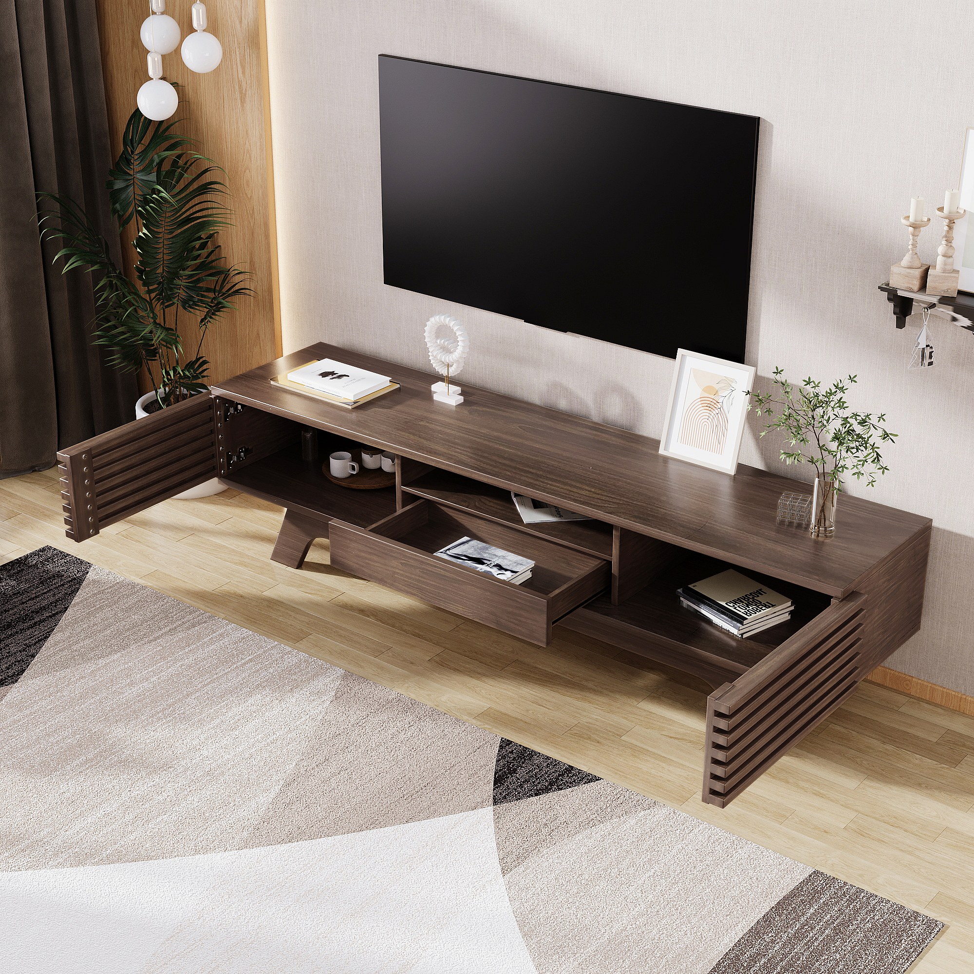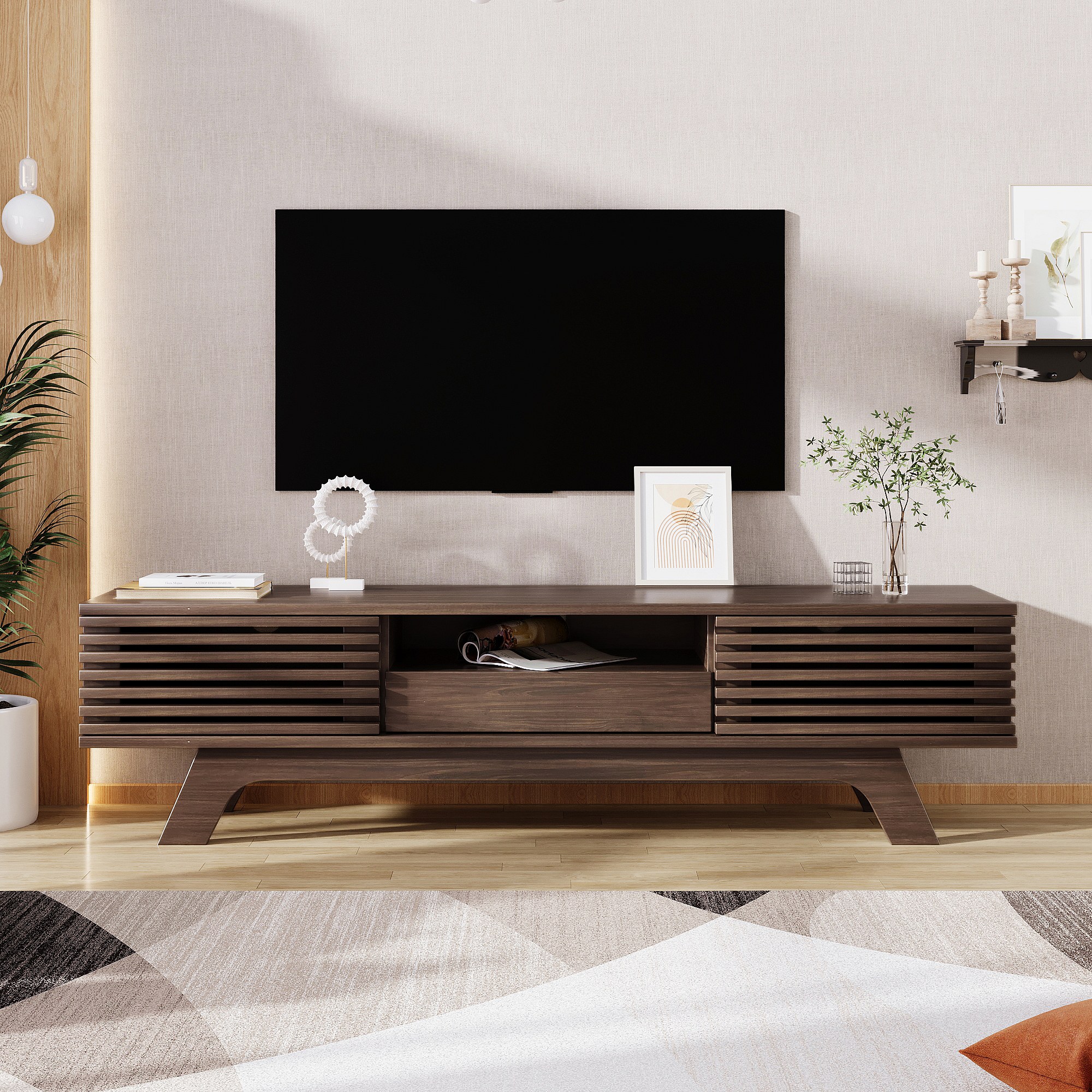 Meuble TV en noyer foncé avec 2 portes et 1 tiroir, design portes à lattes en bois 150x35x44cm