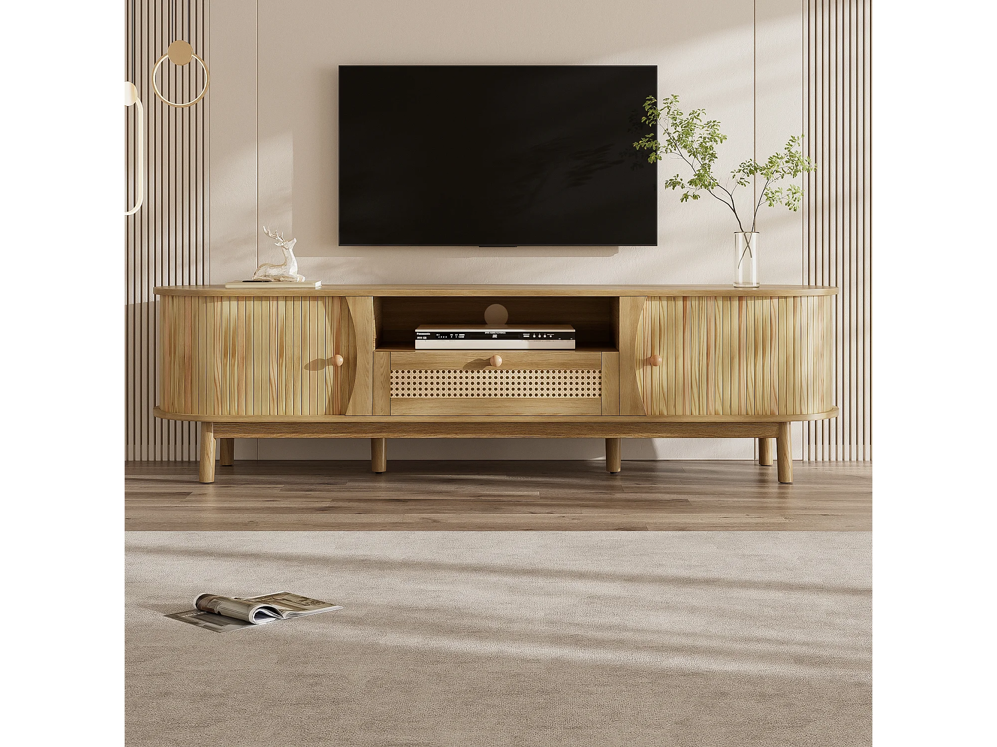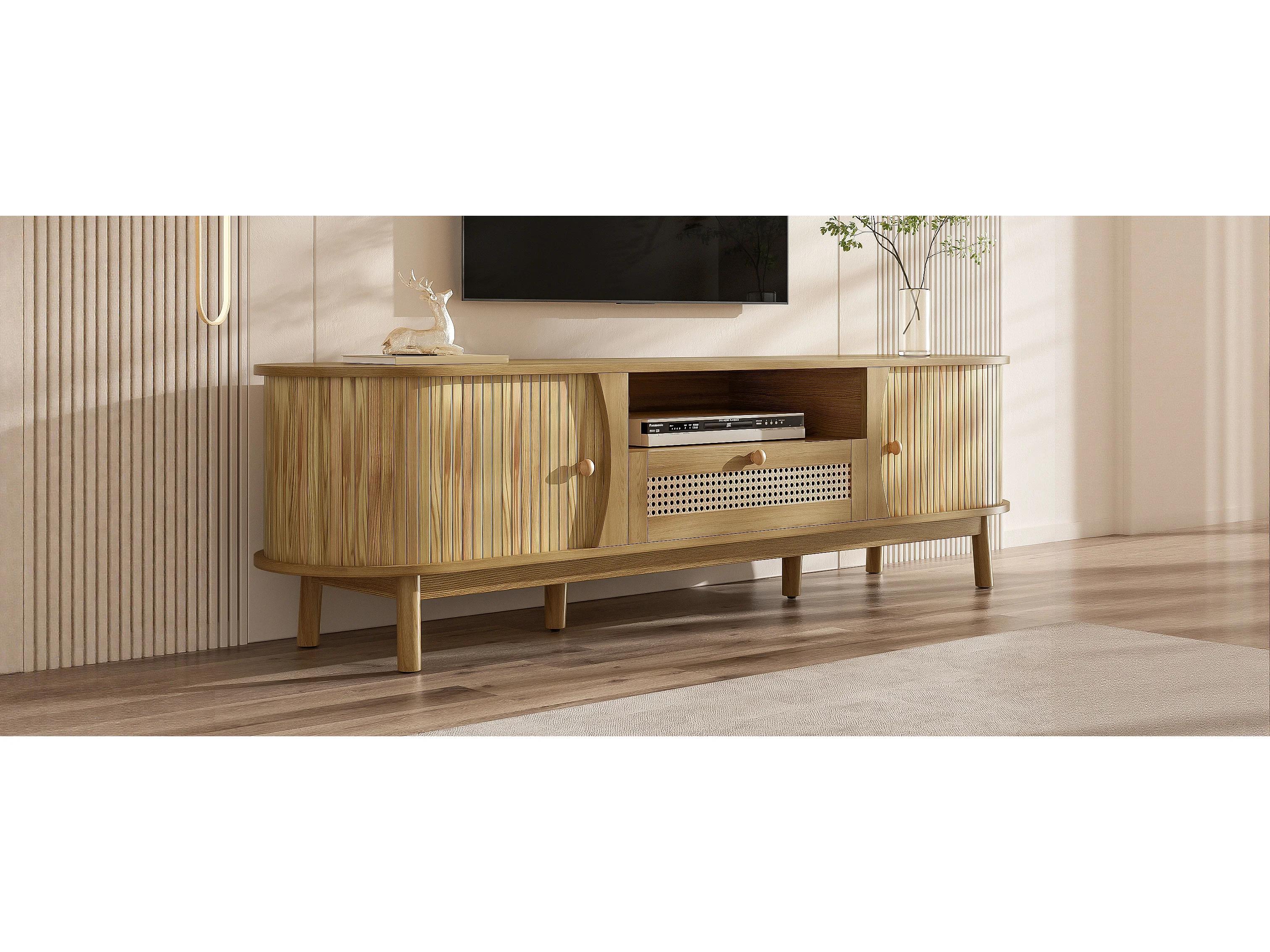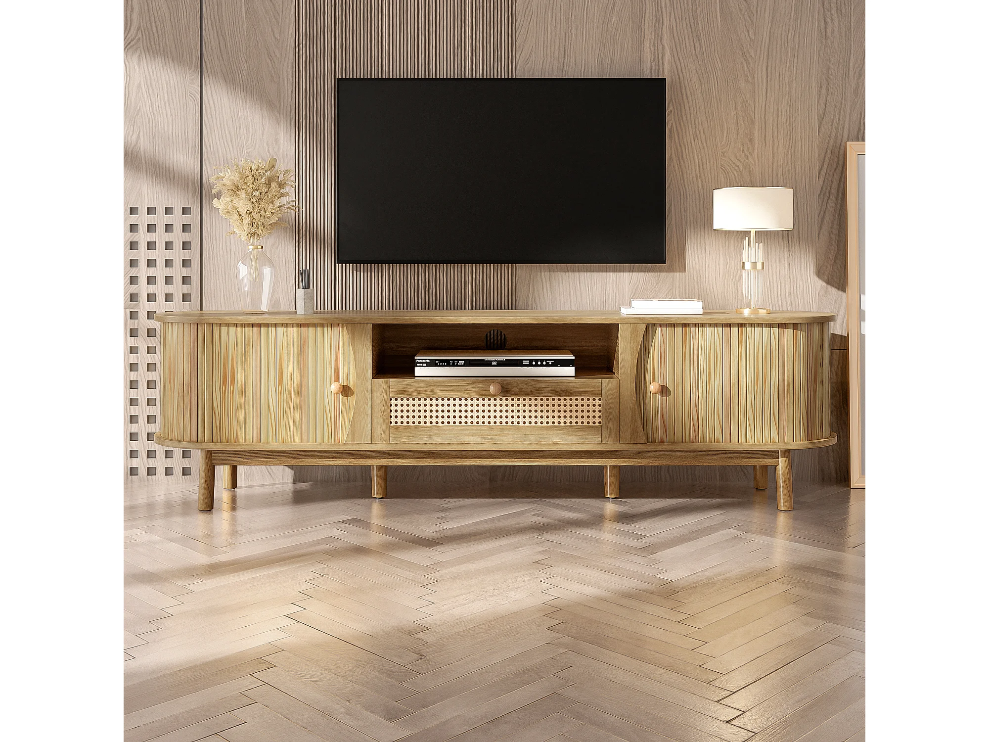 Meuble TV en rotin - 165 x 37 x 46 cm - avec 2 portes + 1 tiroir + étagère - façade basse - MDF - naturel
