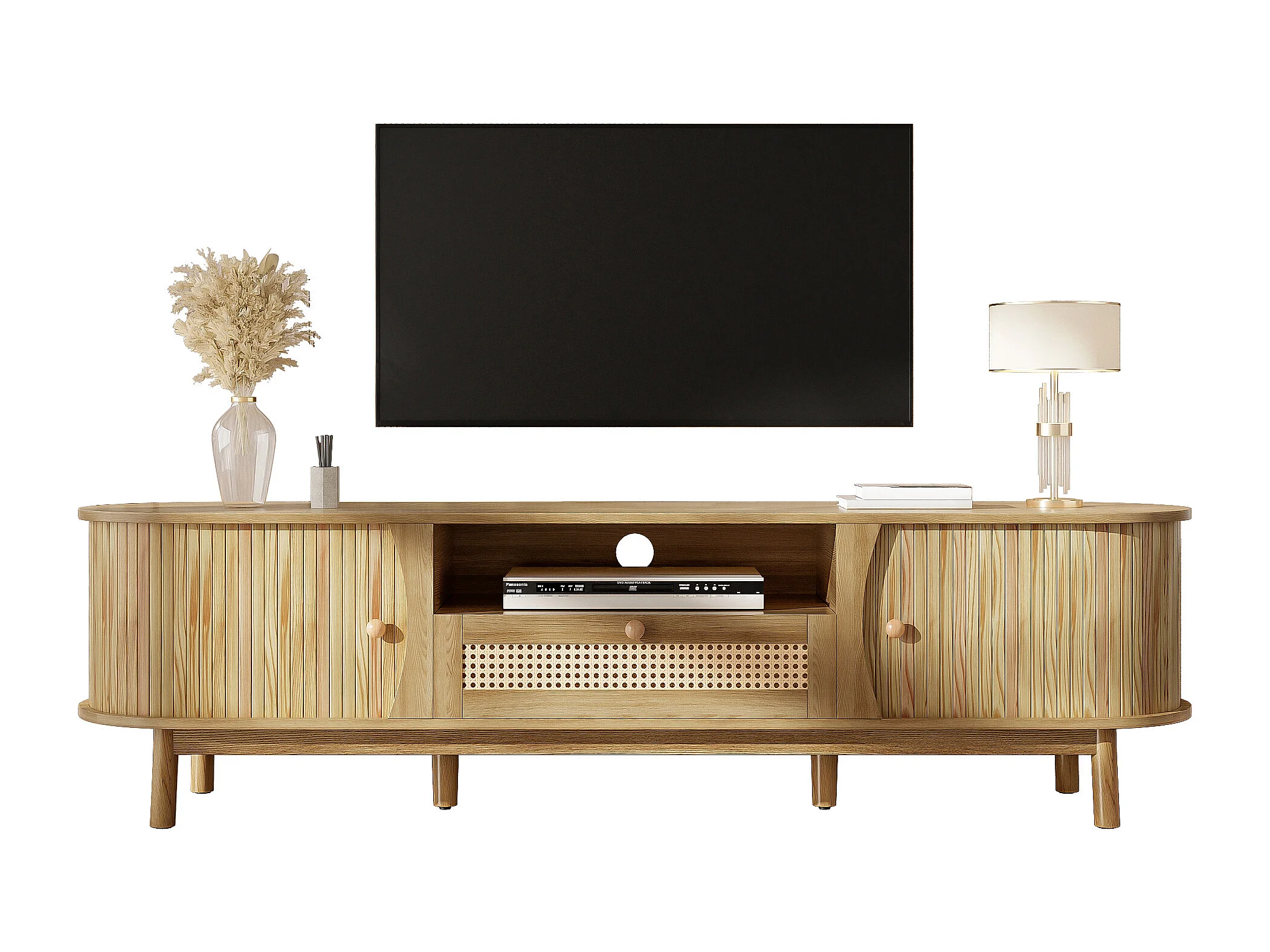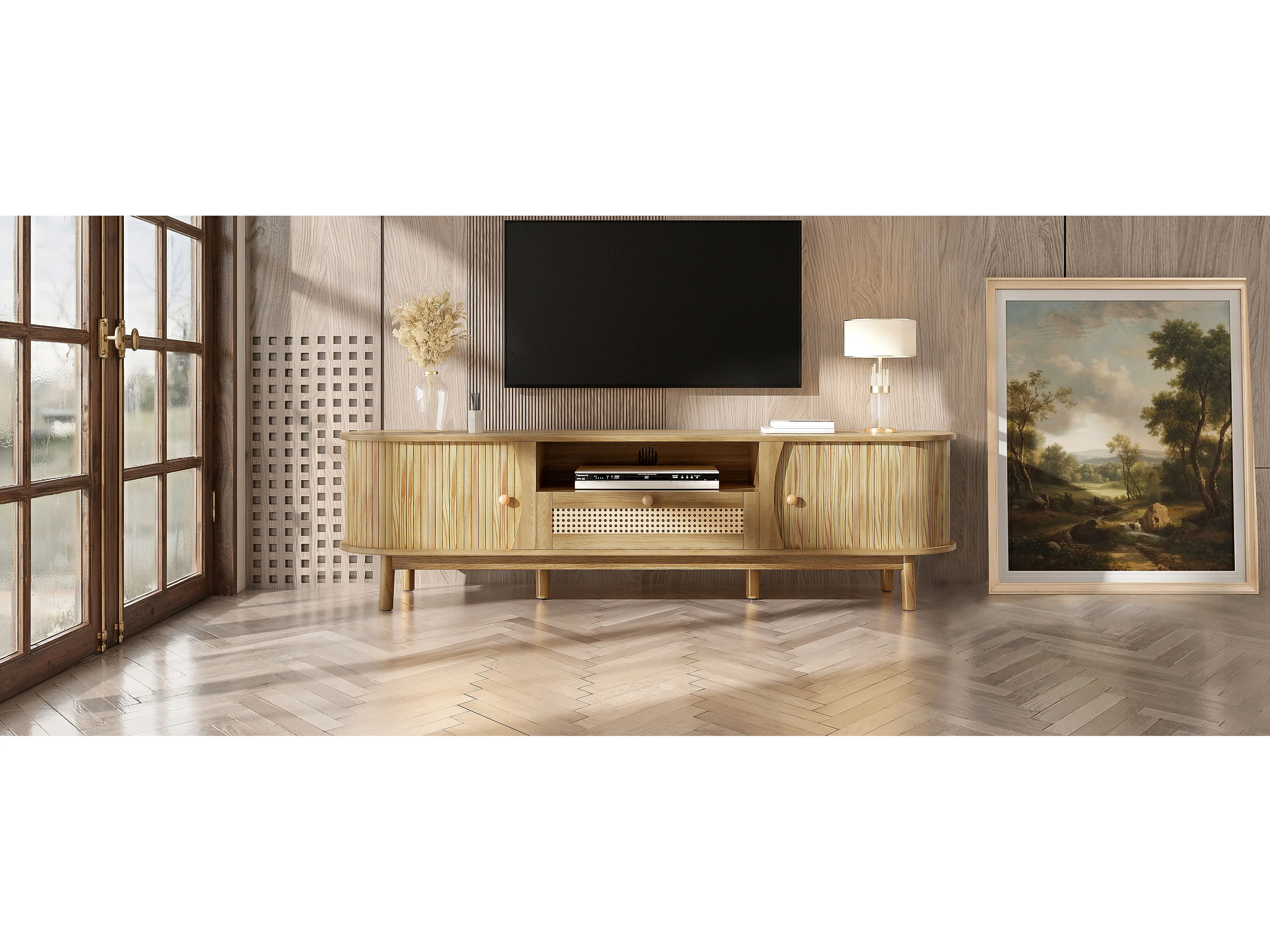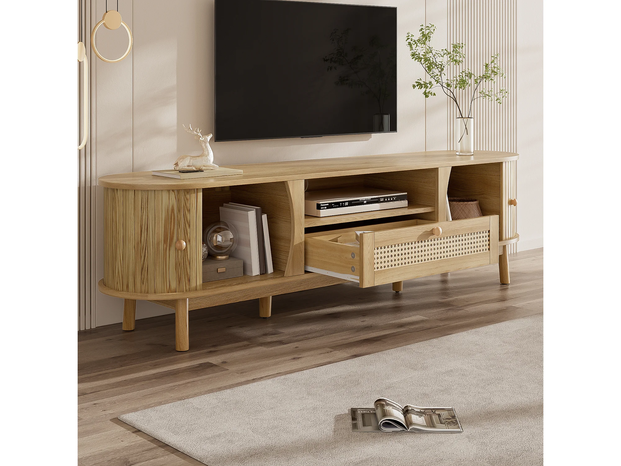 Meuble TV en rotin - 165 x 37 x 46 cm - avec 2 portes + 1 tiroir + étagère - façade basse - MDF - naturel