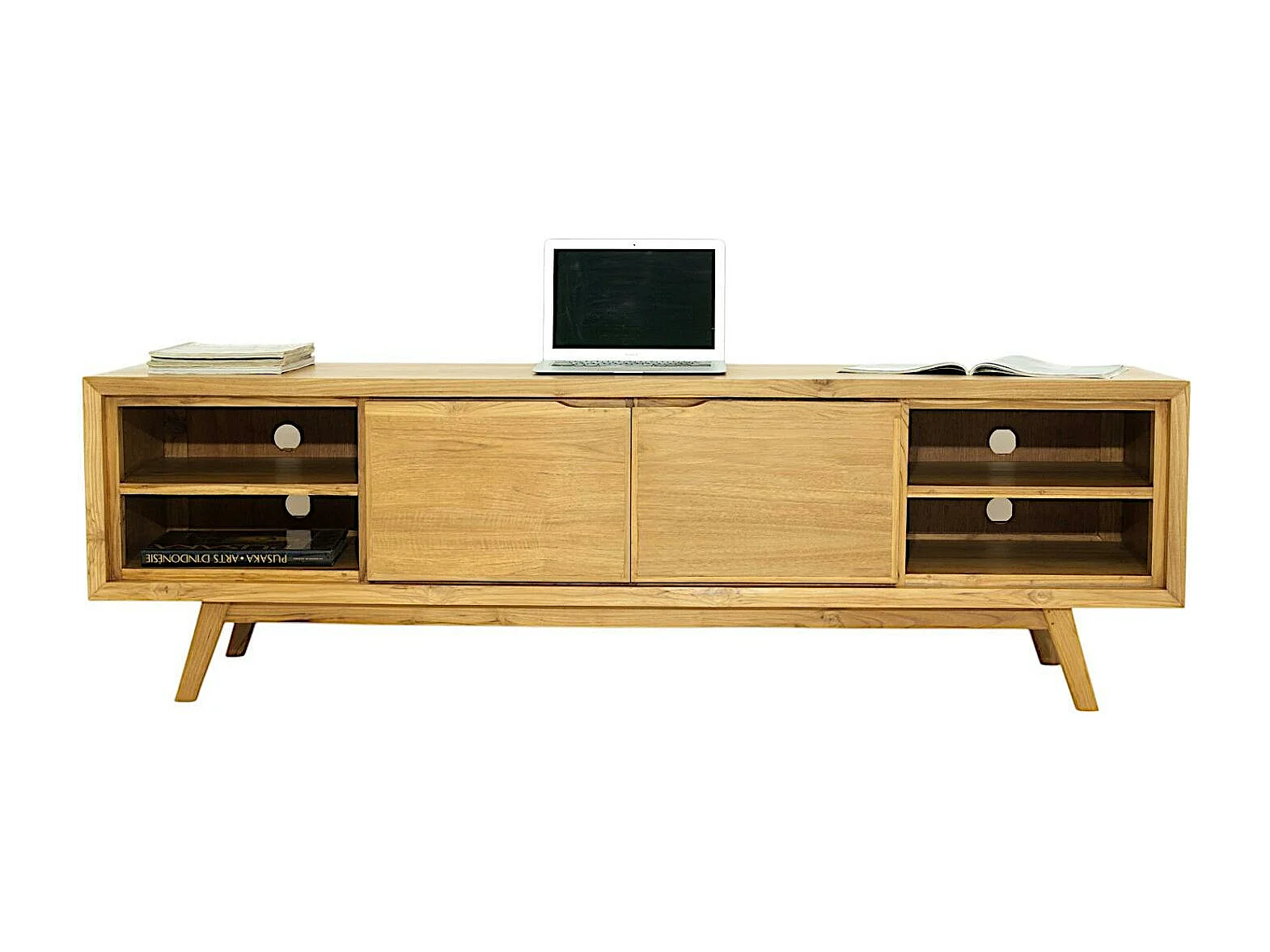 Meuble TV en Teck massif naturel 2 portes et 4 niches 180x45x55cm FIFTEES
