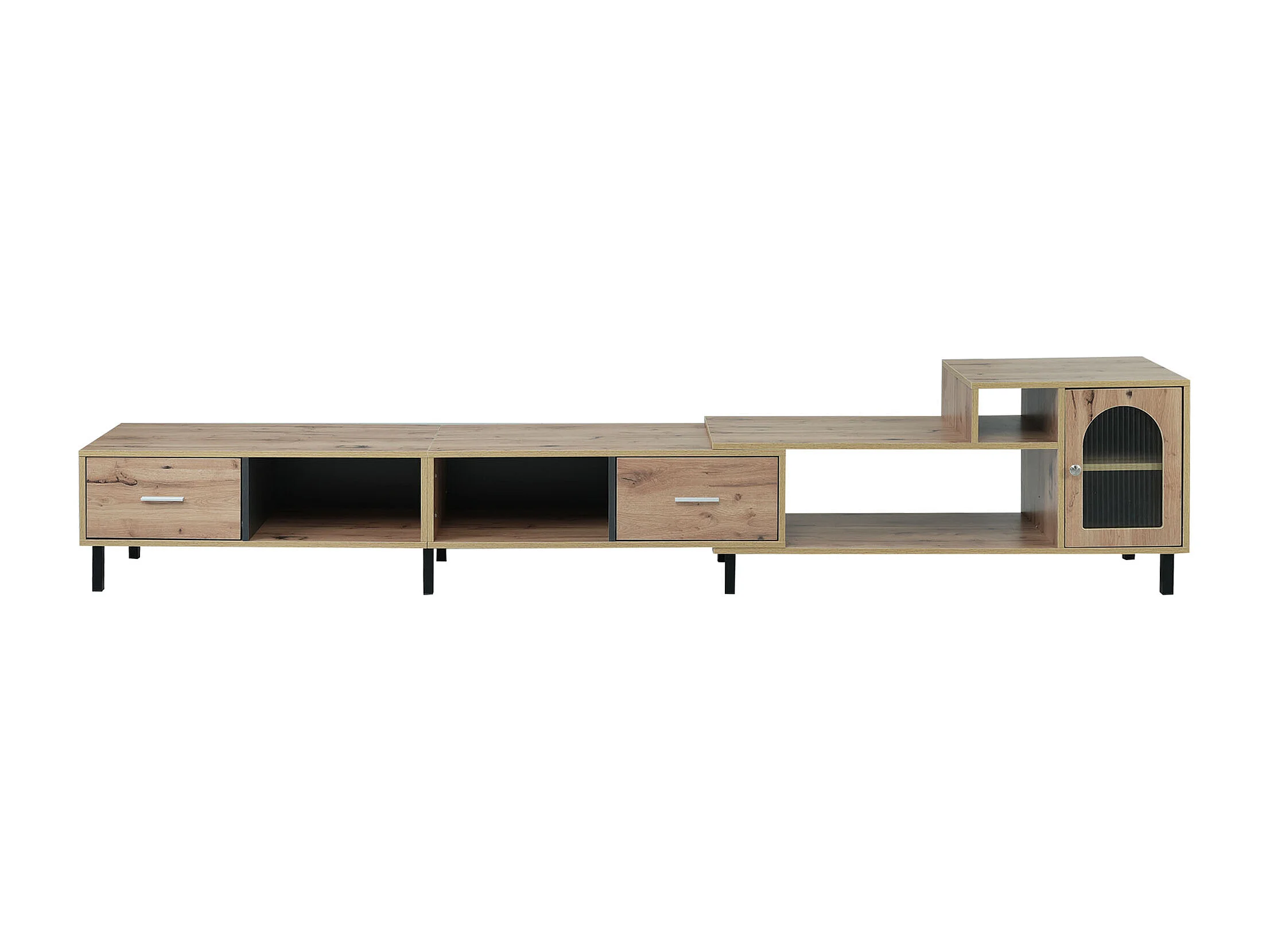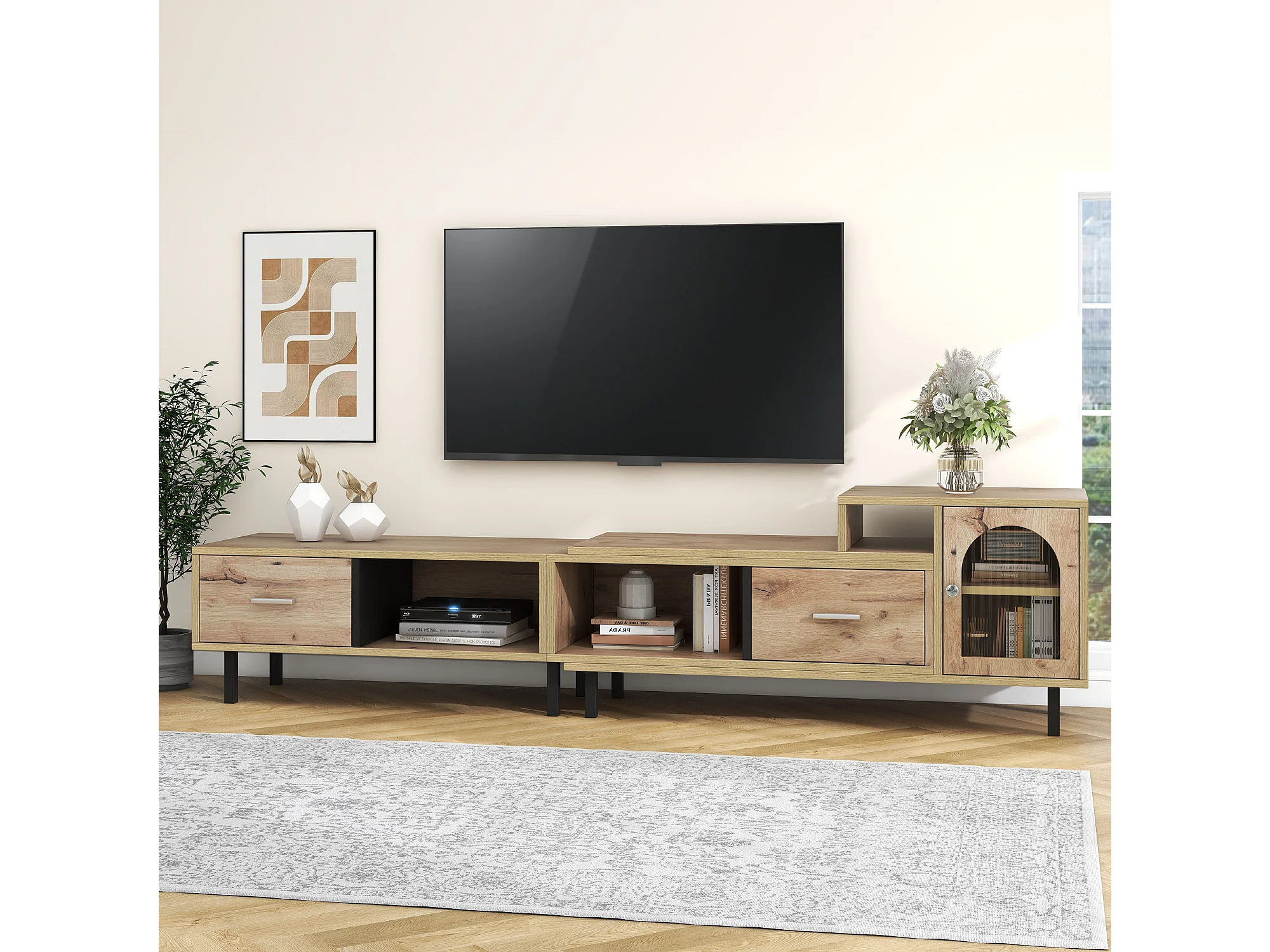 Meuble TV extensible aspect bois - 4 compartiments, 2 tiroirs, porte vitrée, longueur variable 200-278cm QUVRUX