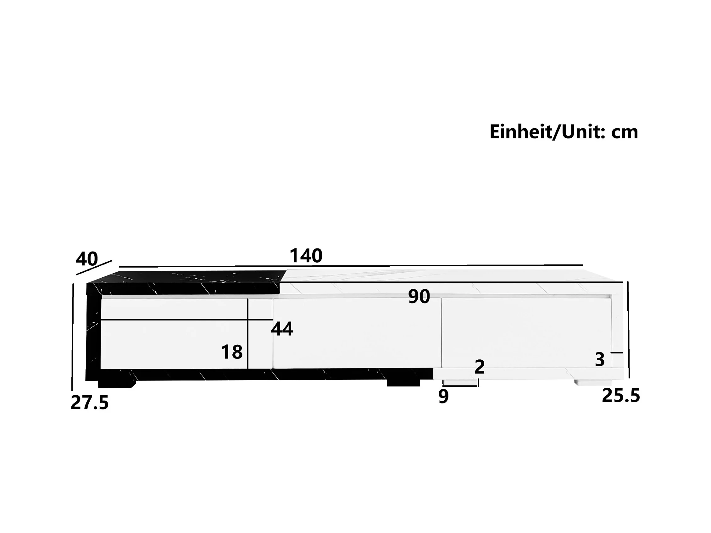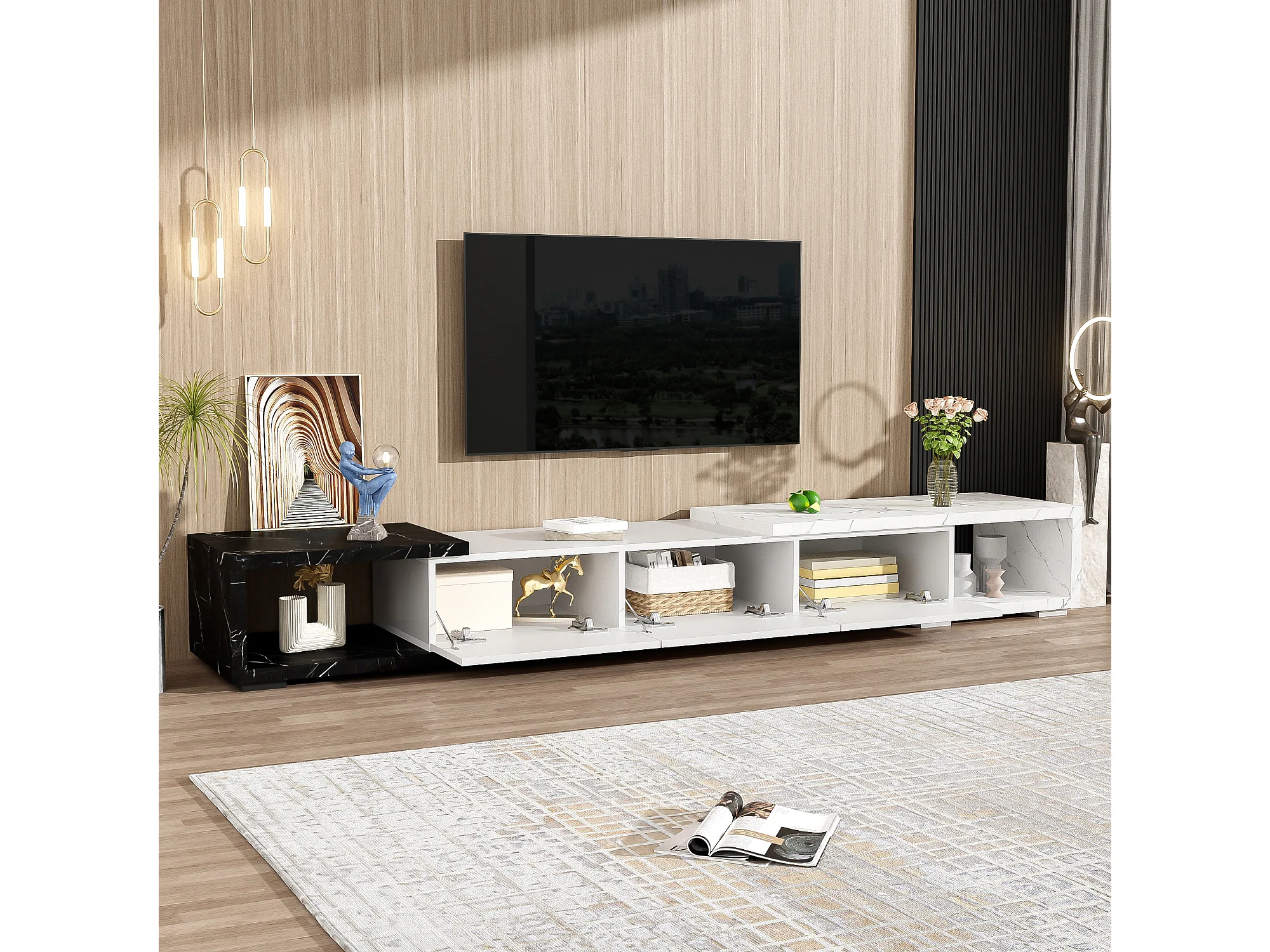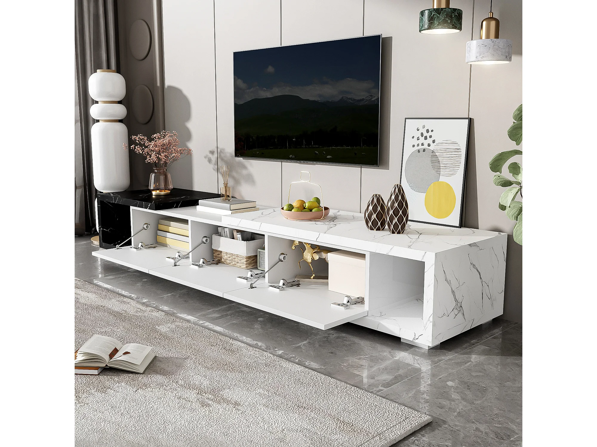 Meuble TV extensible et rotative avec 3 portes - 140/179.5 x 40 x 27.5 cm - Effet marbre - MDF - Noir + blanc