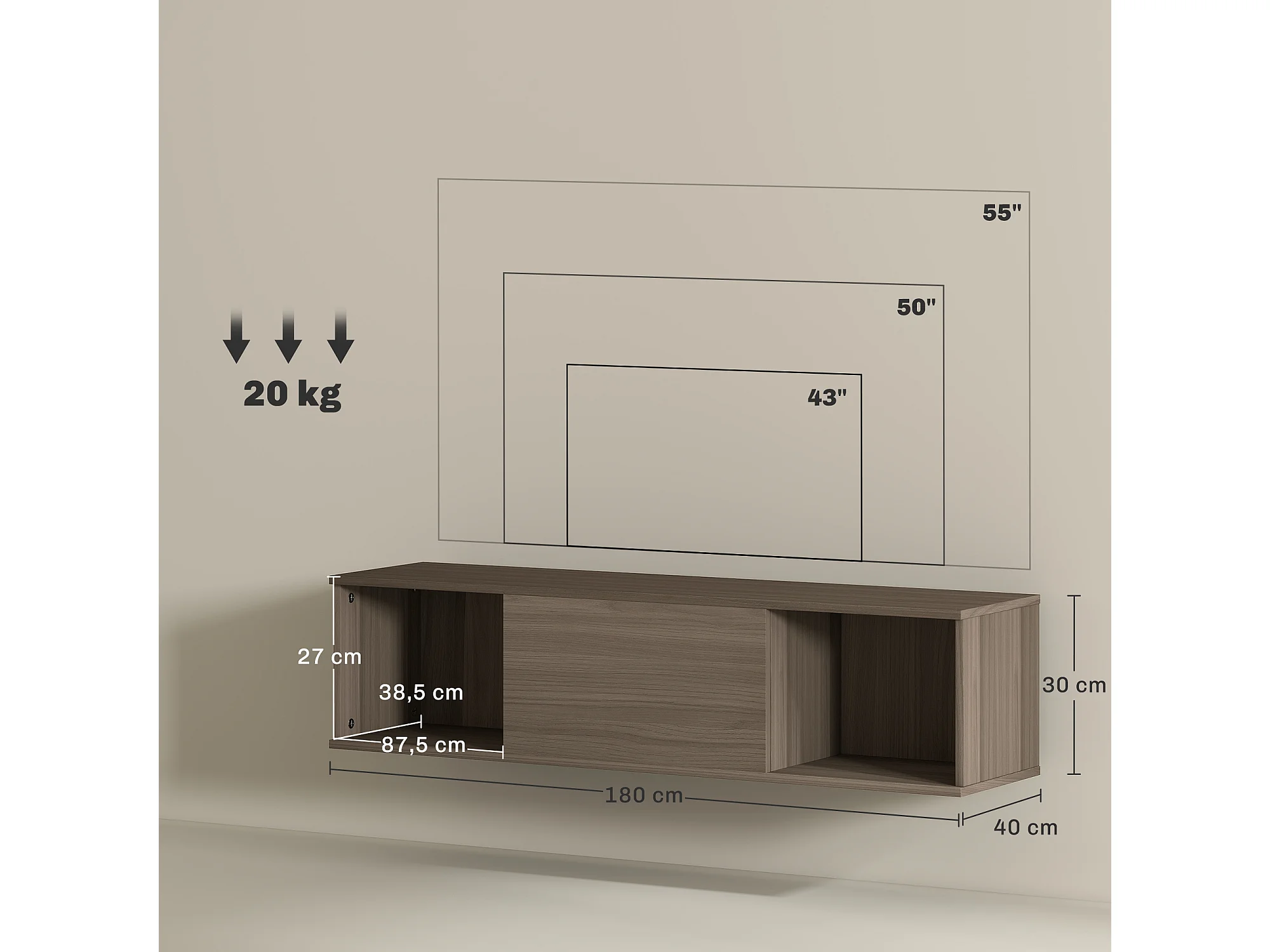 Meuble TV flottant suspendu - 2 niches, porte battante - effet bois noisetier brun gris