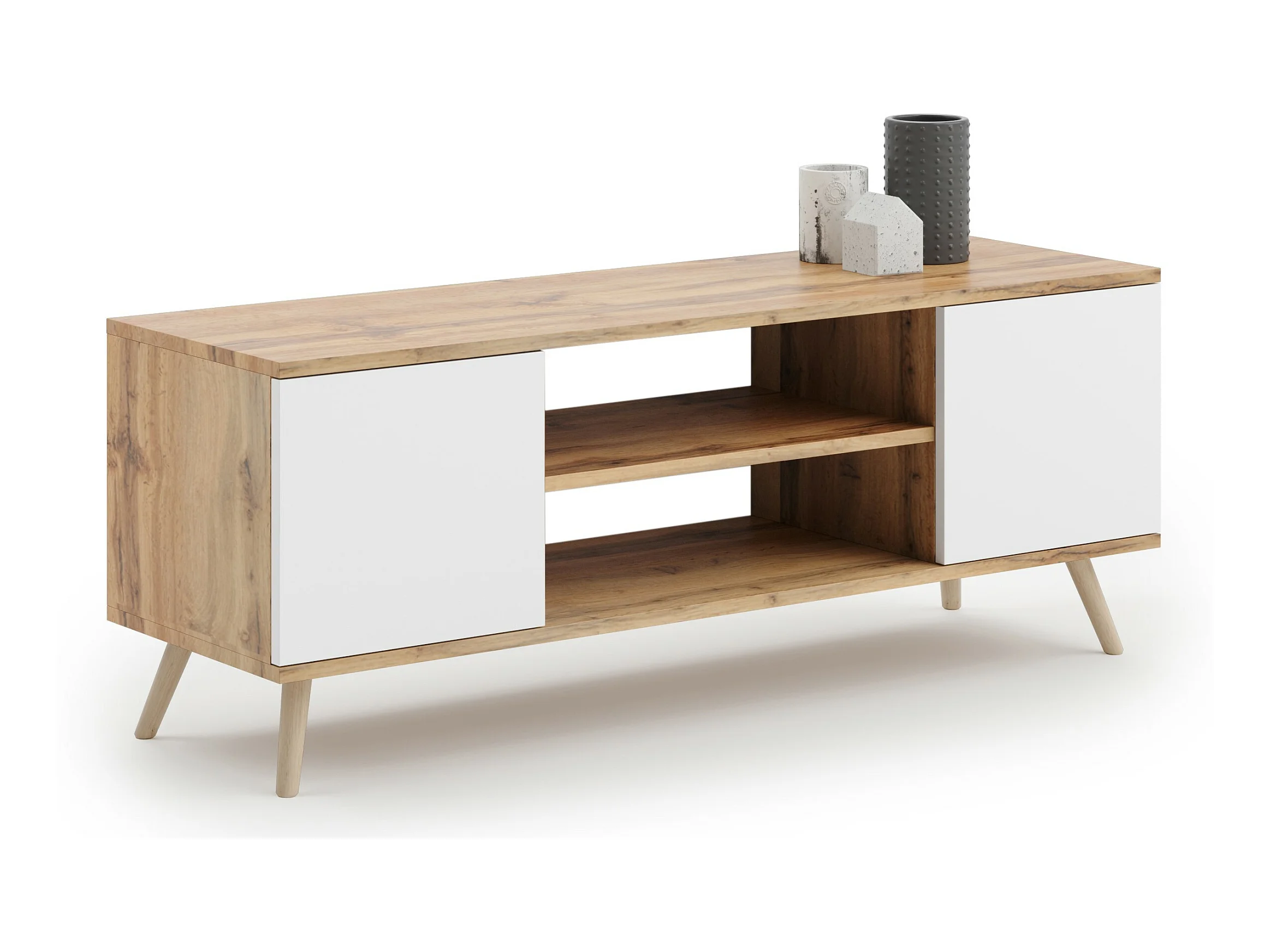 Meuble TV Focus chêne doré - blanc, pieds bois, style scandinave