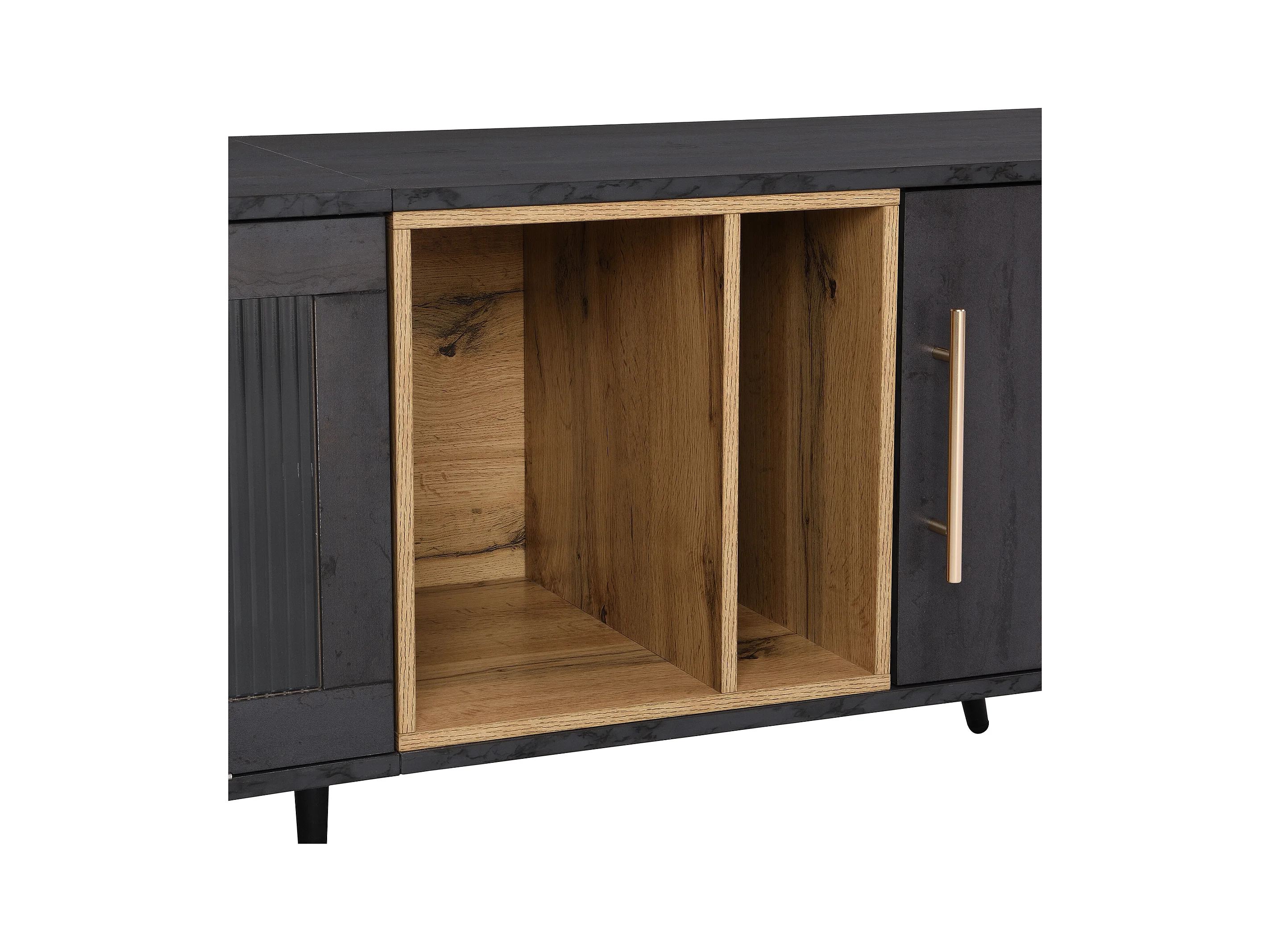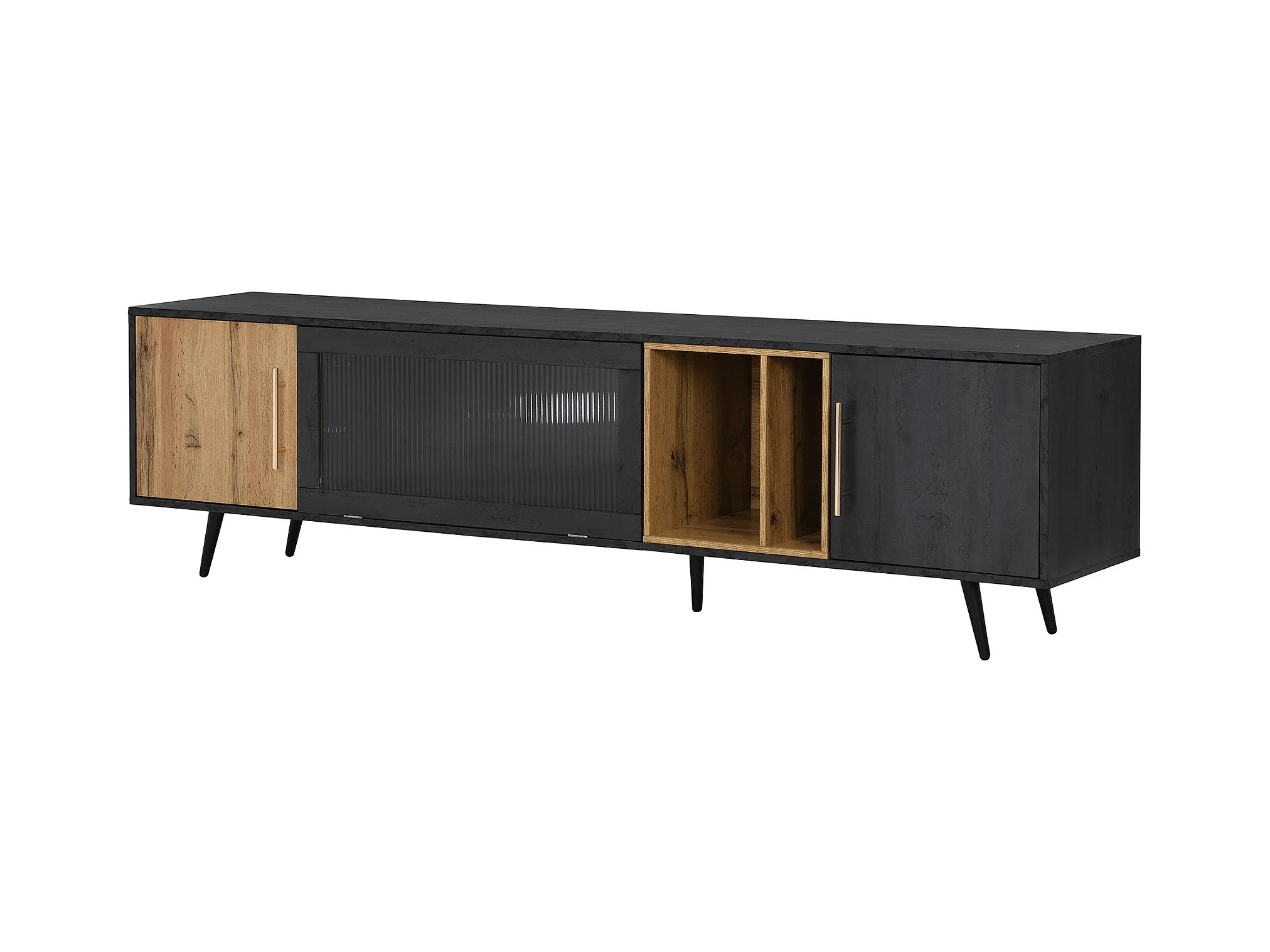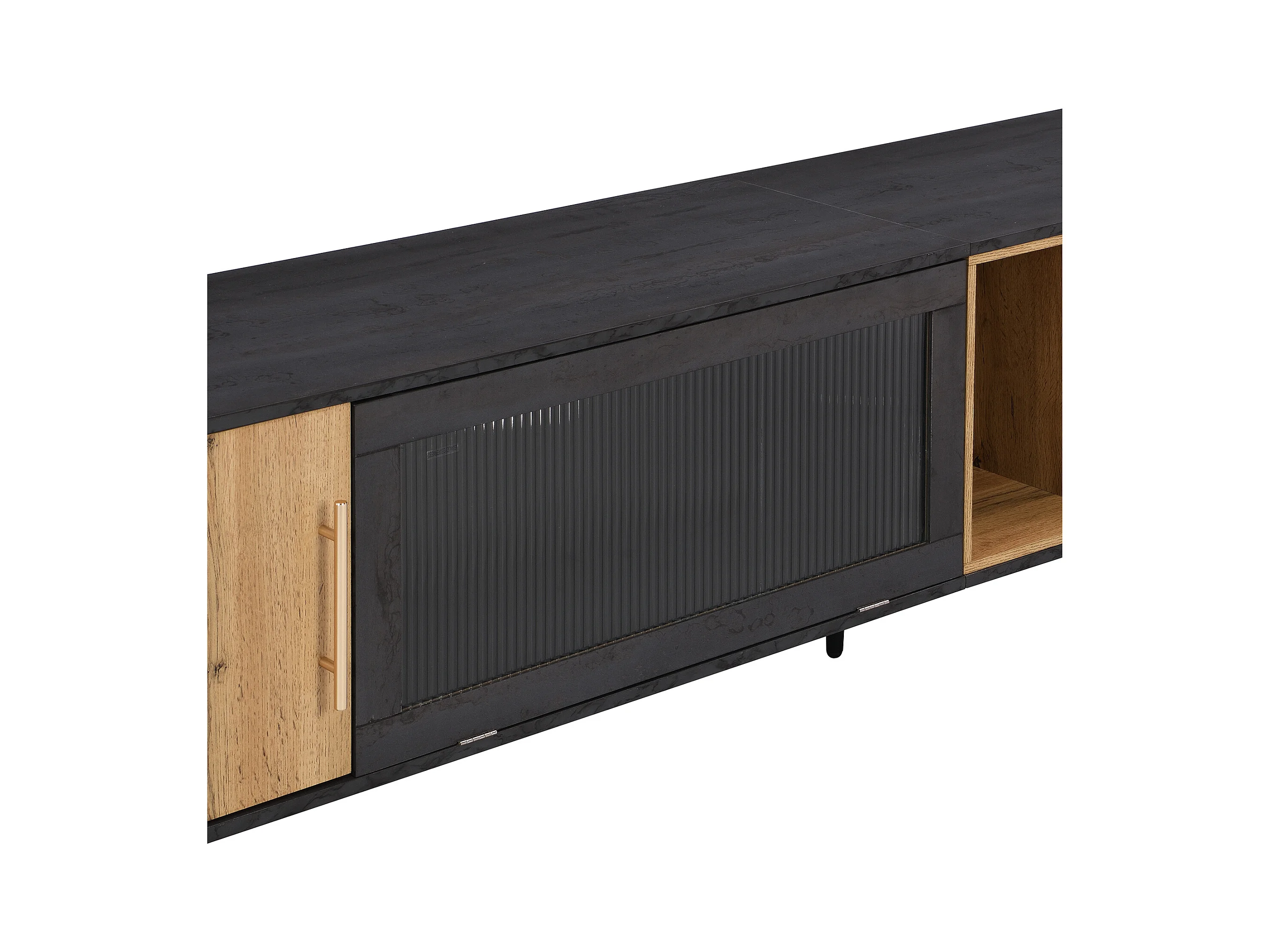 Meuble TV gris et verre ondulé avec 3 portes battants niche ouvert rangement 200 x 40 COVUNS