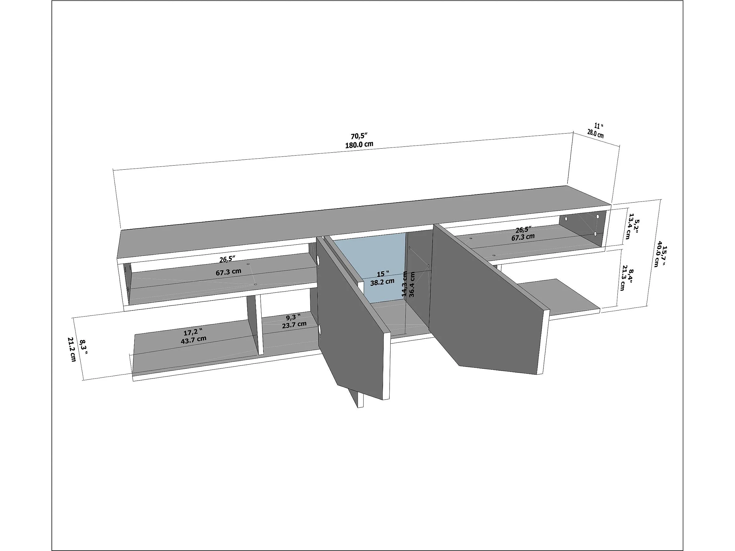 Meuble TV Incia de 180 cm avec 3 Armoires en style ailes (Blanc brillant)