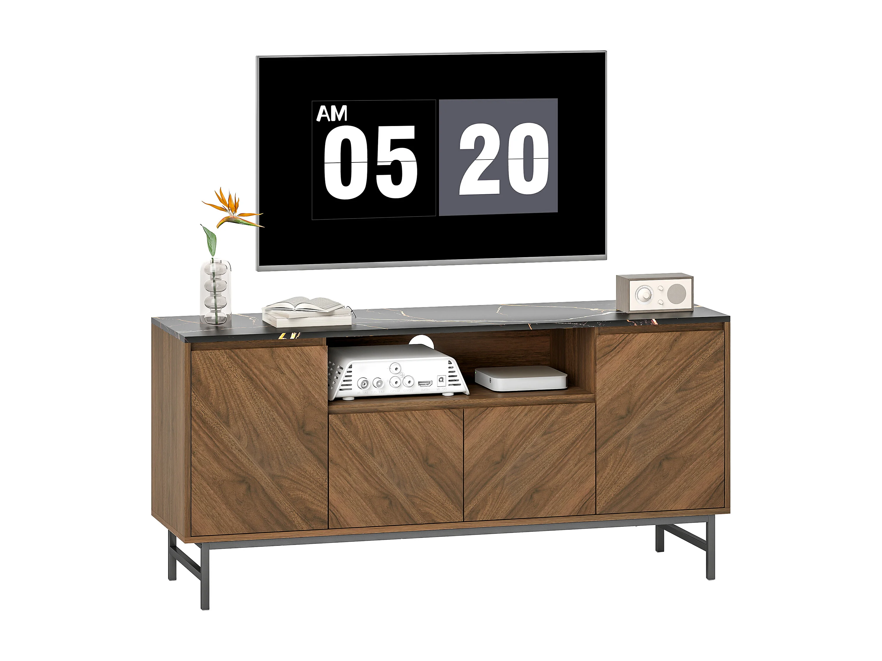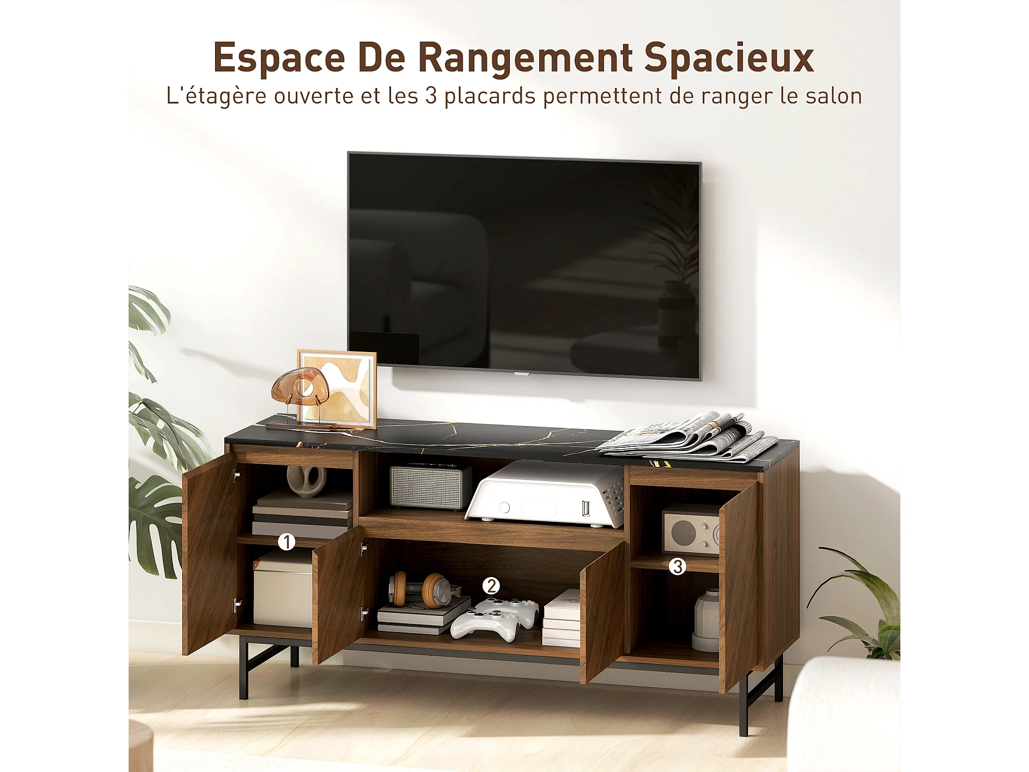 Meuble TV 120 cm, pour téléviseur jusqu'à 55 pouces avec 4 portes, plateau effet marbre, étagères réglables et pieds en acier