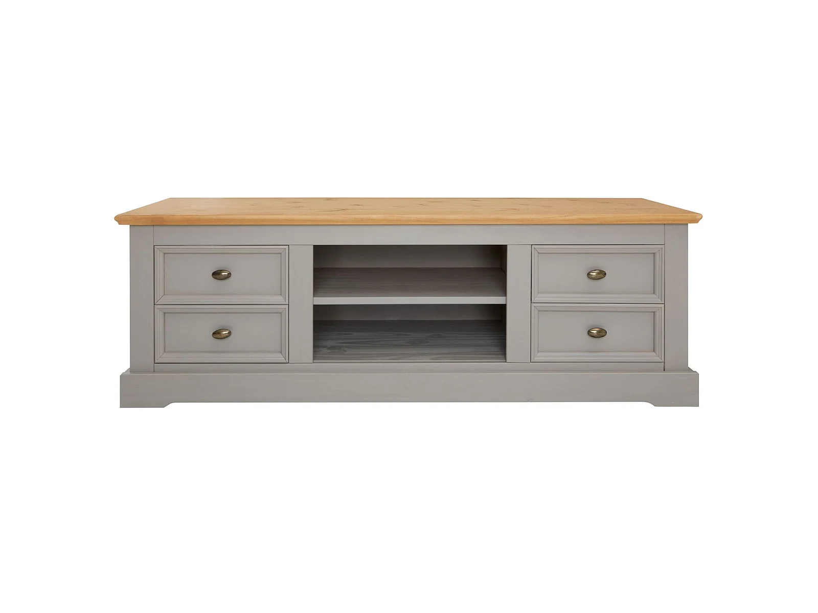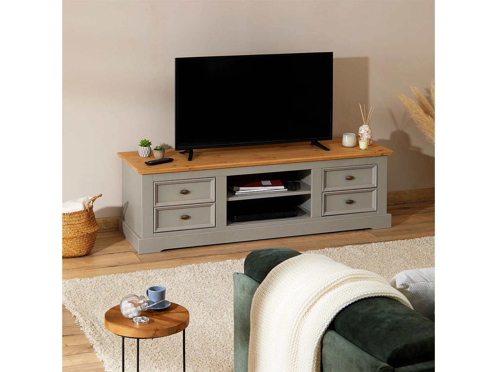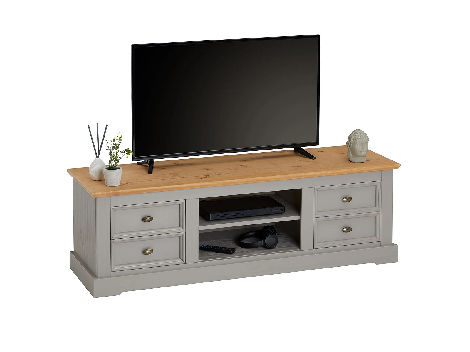Meuble TV KENT banc télévision en pin massif lasuré gris et brun 144 x 46 x 45 cm, avec 4 tiroirs et 2 niches
