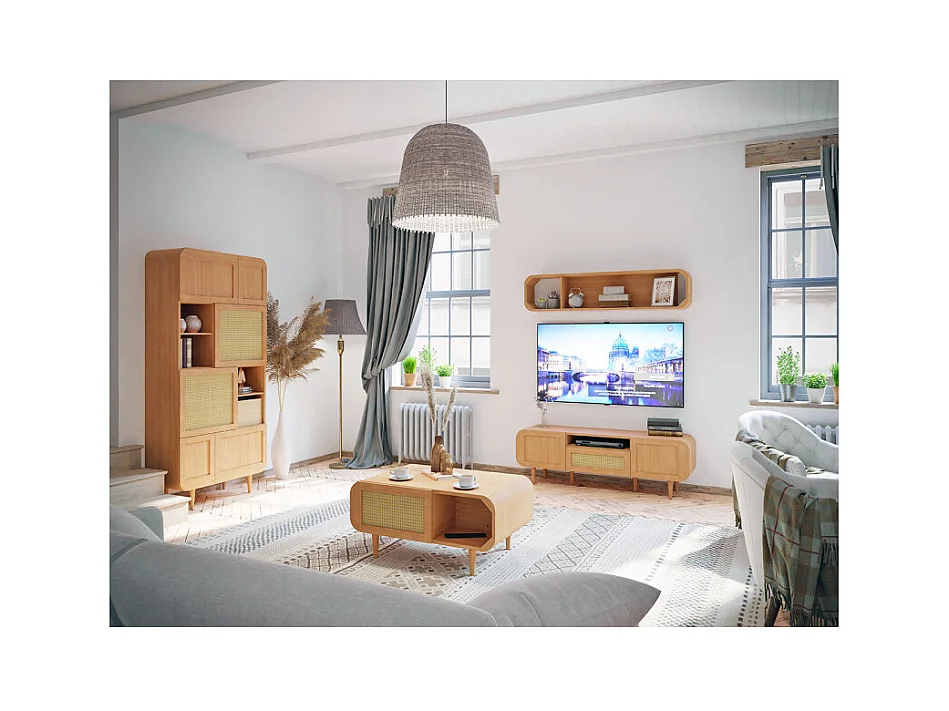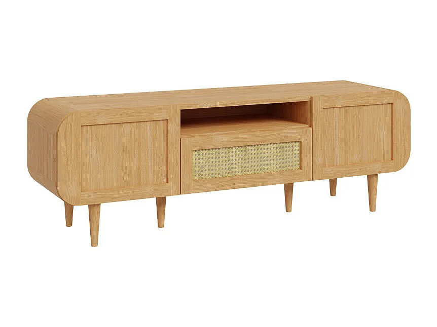 Meuble TV L. 160 cm décor chêne cannage rotin pieds en bois - VIVIAN