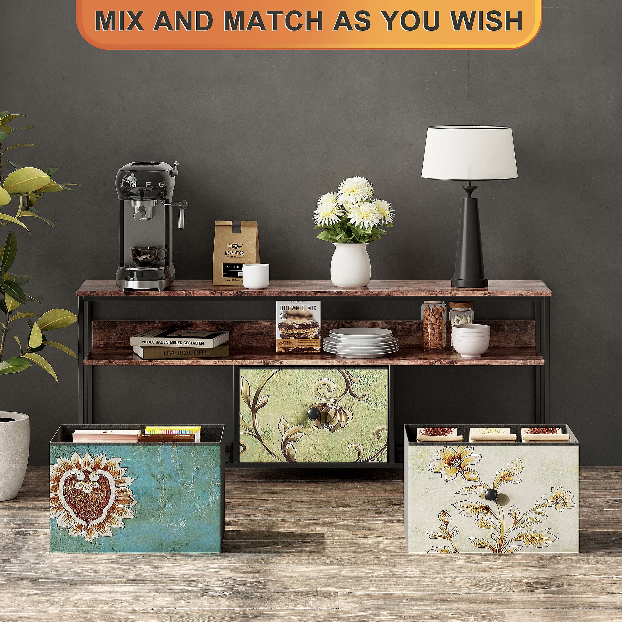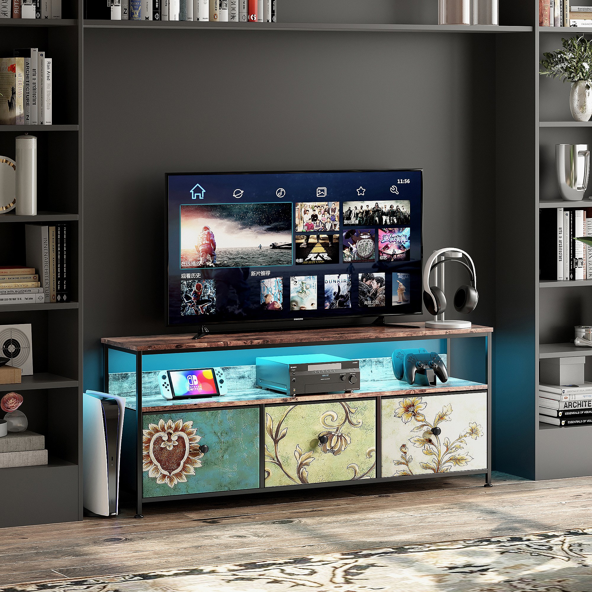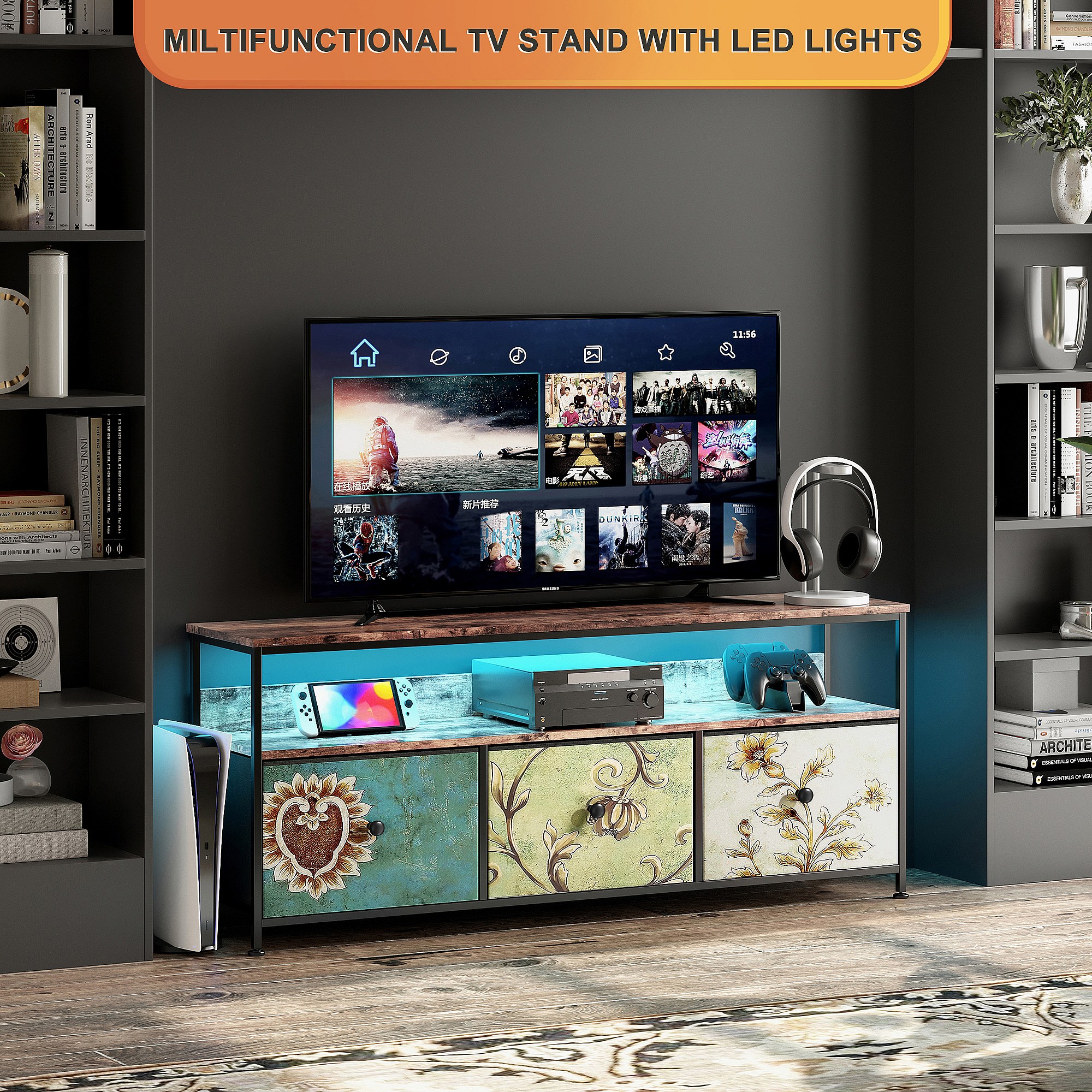 Meuble TV LED avec 3 Tiroirs, Petit Meuble Tele avec Rangement, Banc TV, Support Télé, Commode en Tissu pour Le Salon Chambre à Coucher Entrée Rustique, Colorés