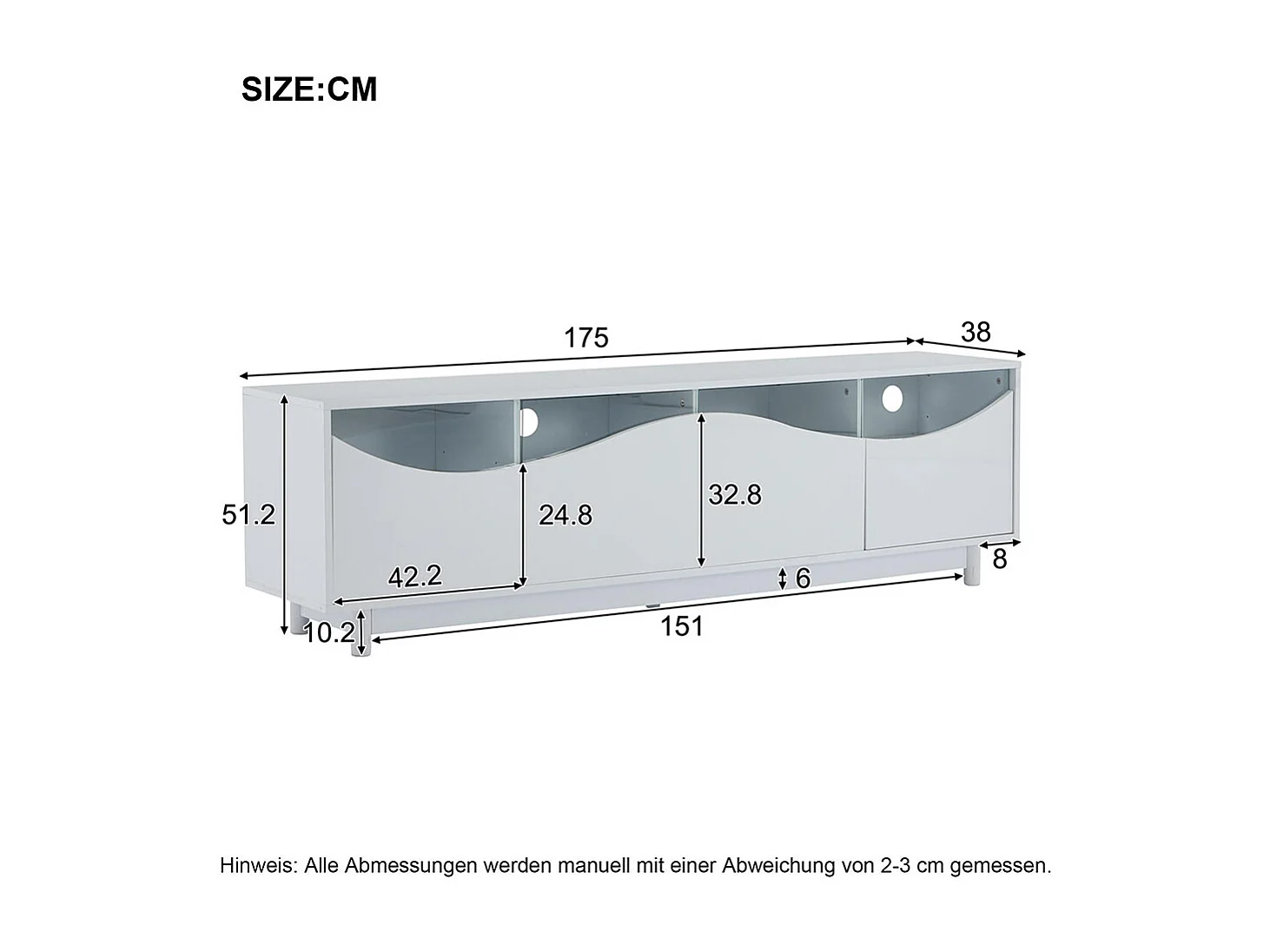 Meuble TV LED avec 4 portes au design incurvé blanc brillant porte en verre trempé éclairage
