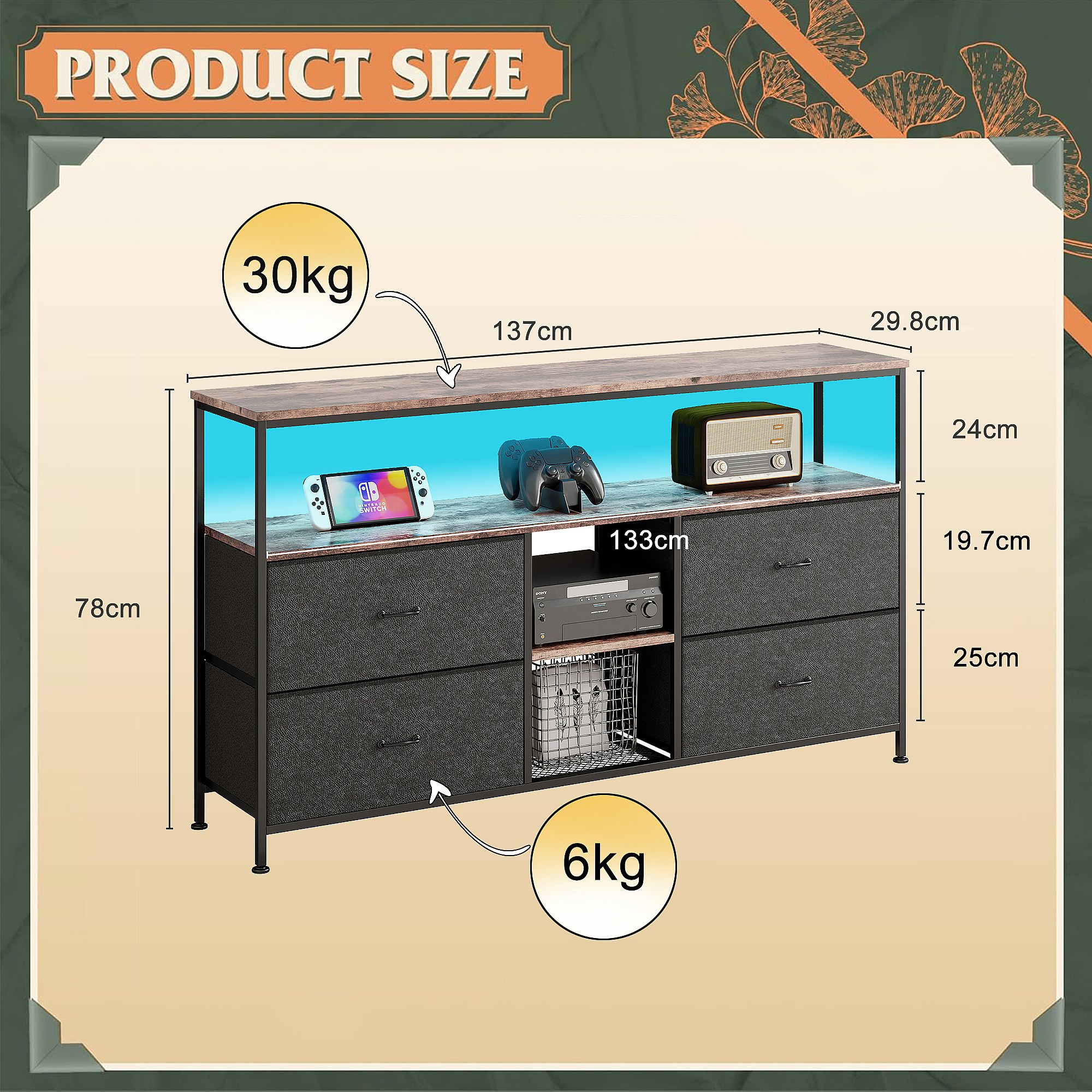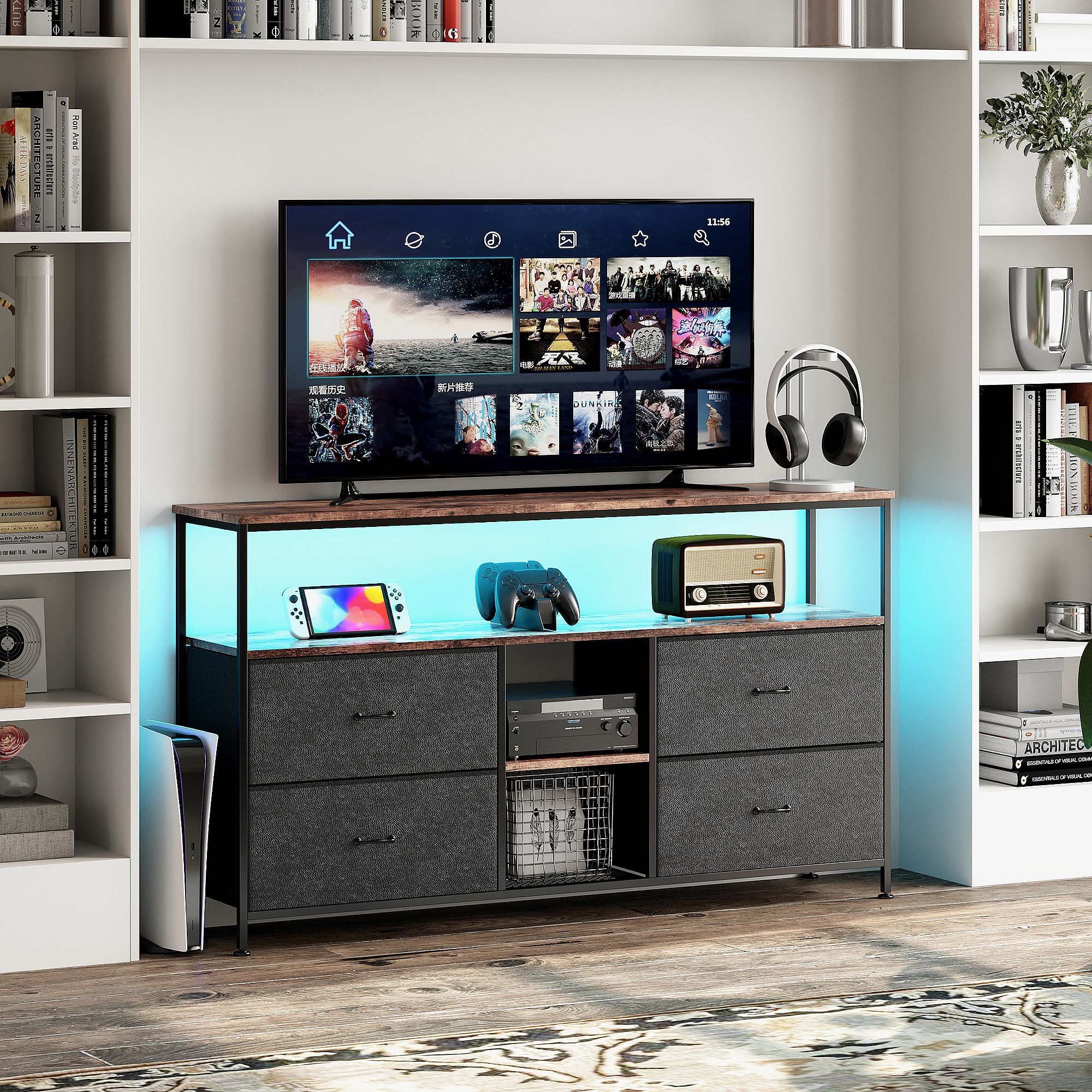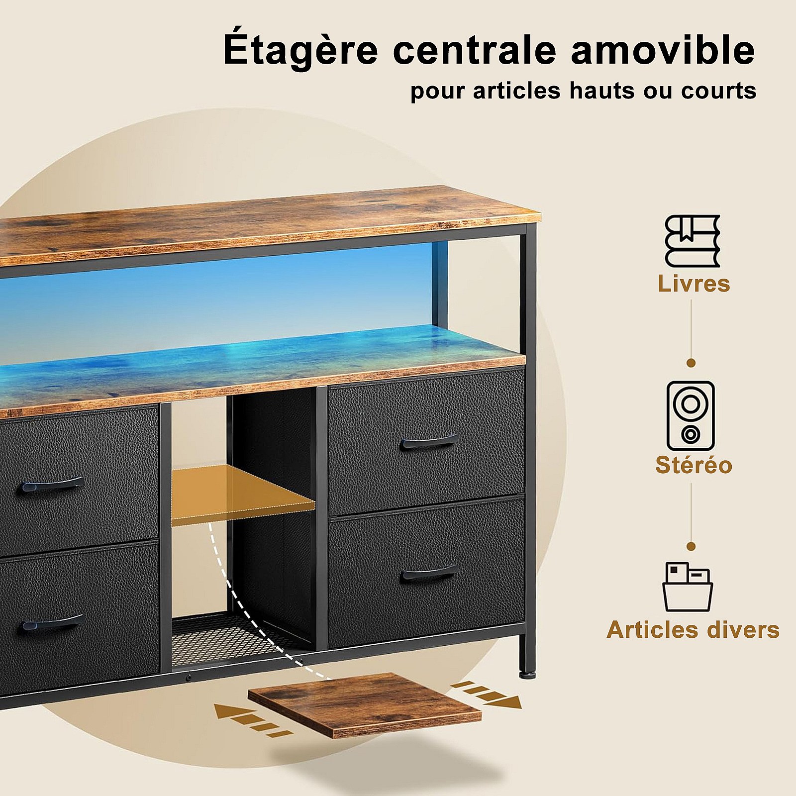 Meuble TV LED avec 4 Tiroirs, Petit Meuble Tele avec Rangement, Banc TV, Support Télé, Commode en Tissu pour Le Salon Chambre à Coucher Entrée Rustique, Noir