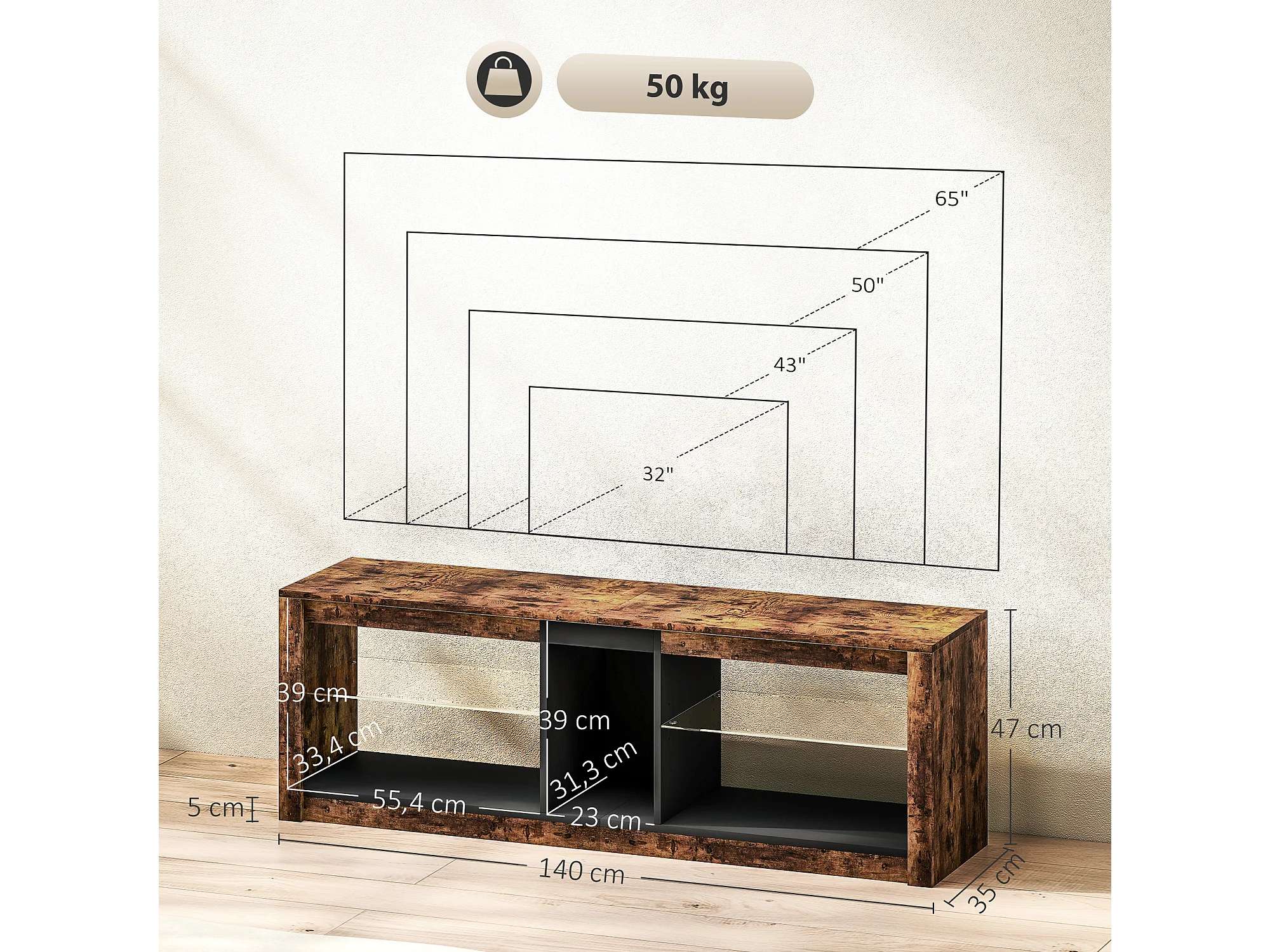 Meuble TV jusqu'à 65 pouces meuble télé aspect bois avec compartiment ouvert, portes, étagères réglables et passe-câbles, 140x39x66cm