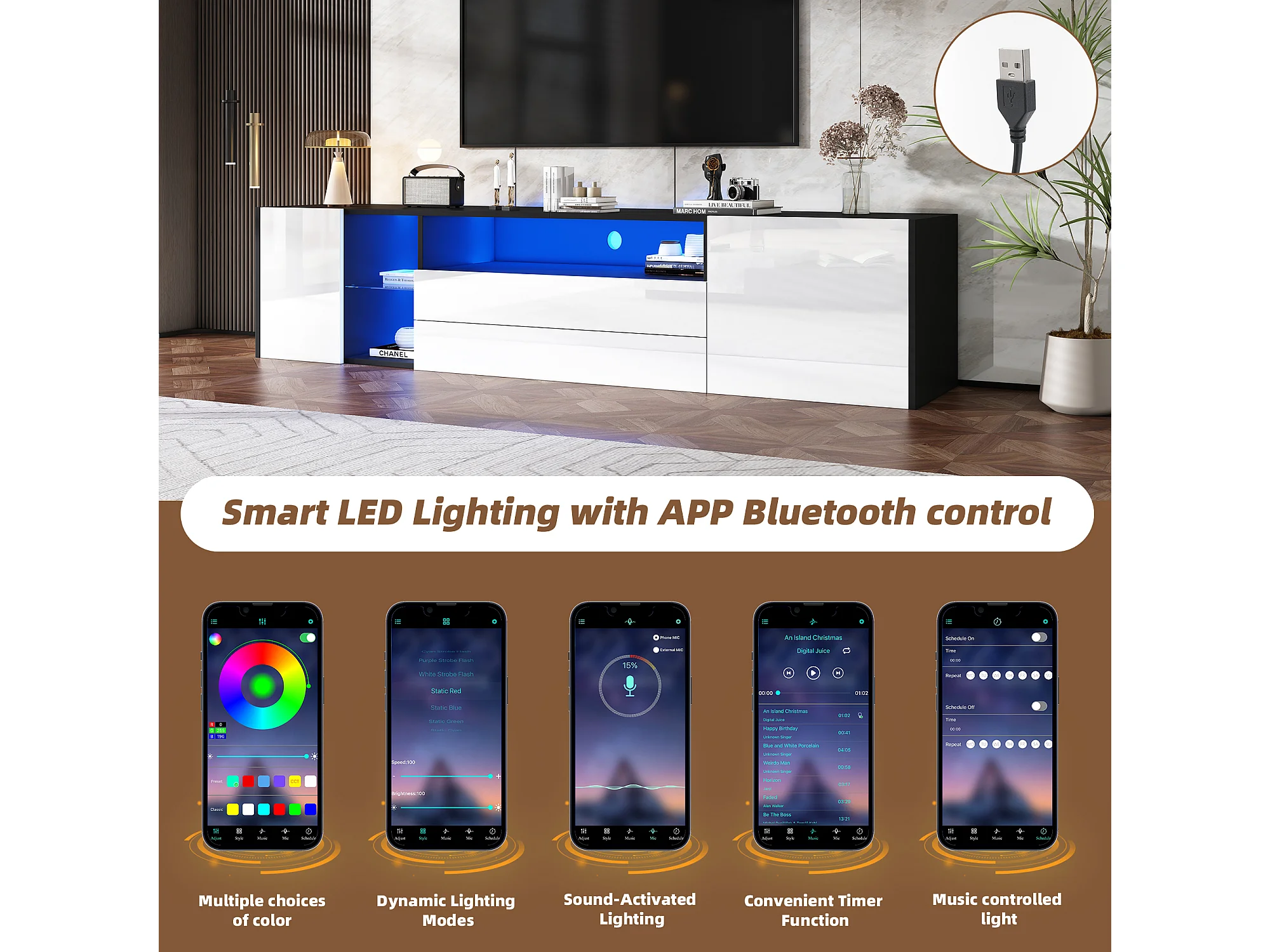 Meuble TV LED Blanc Noir Moderne, 2 Tiroirs + 2 Portes, Meuble Télé avec LED, 180 x 40 x 45 cm
