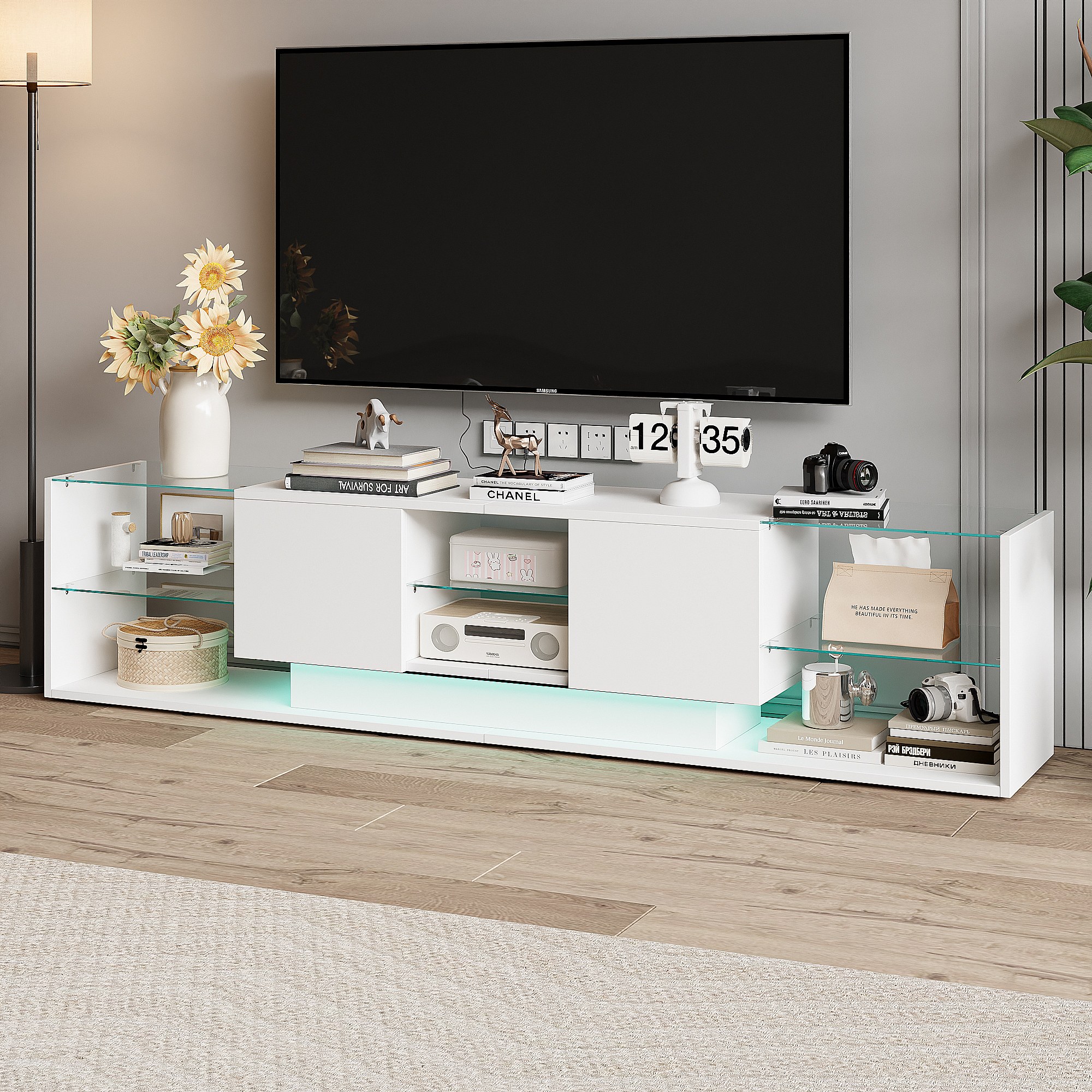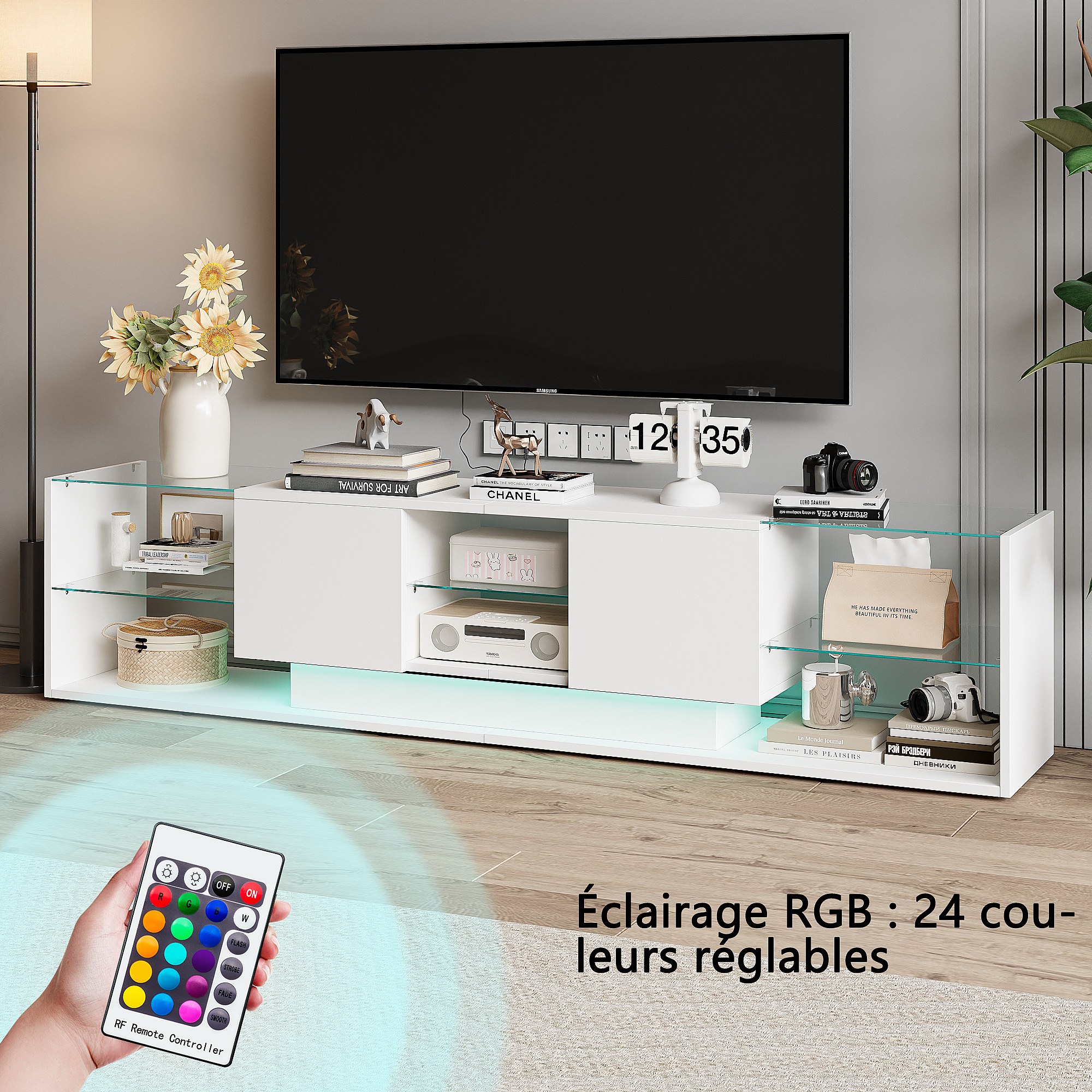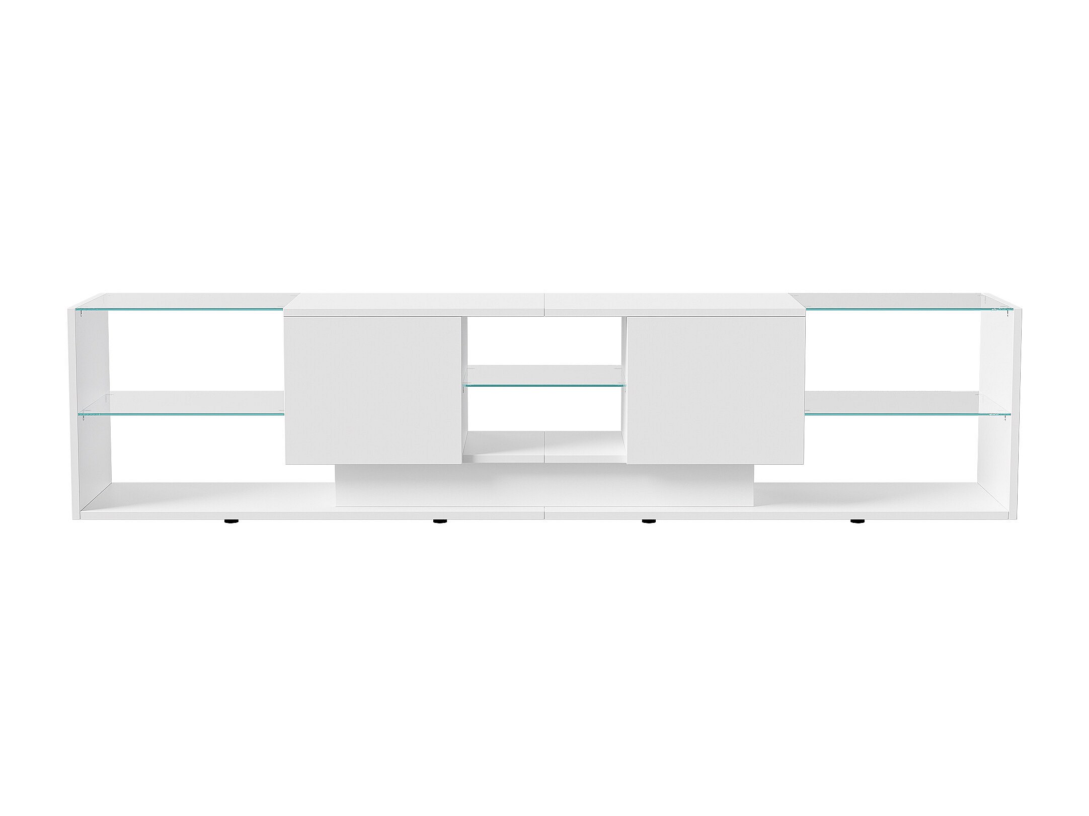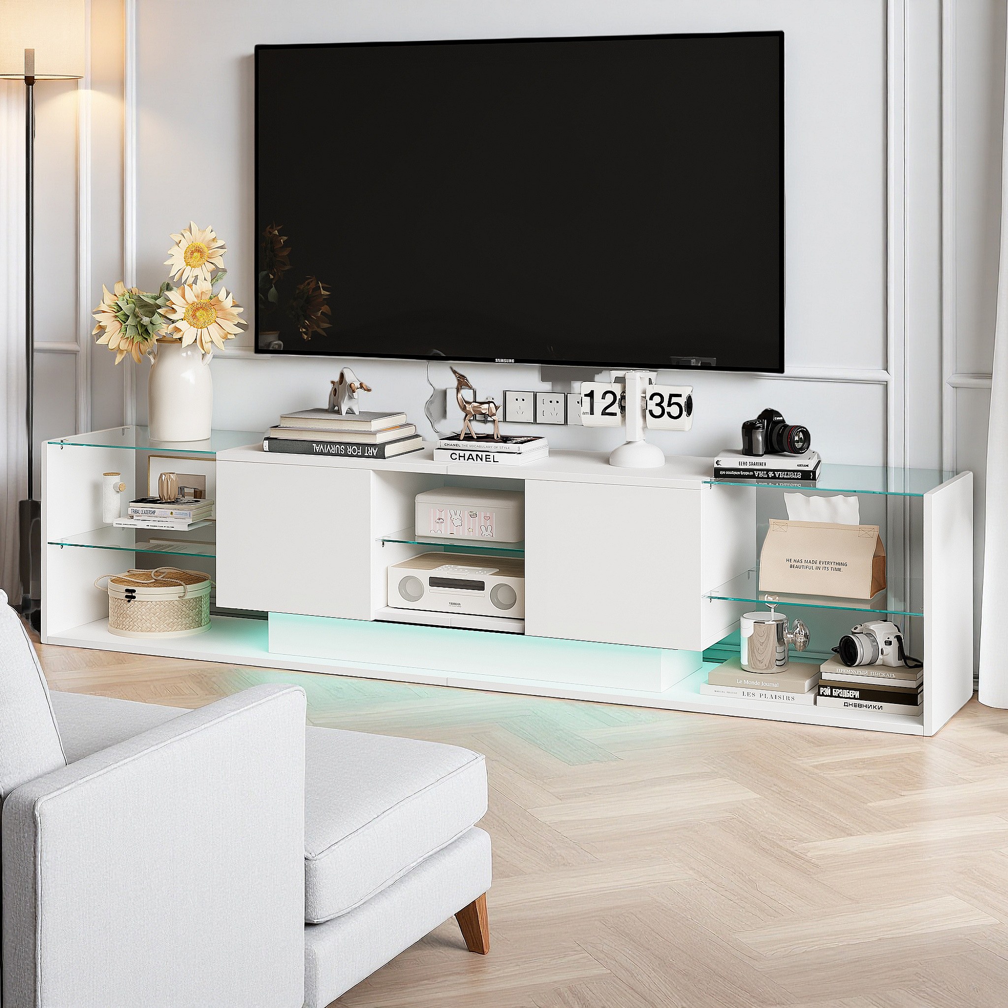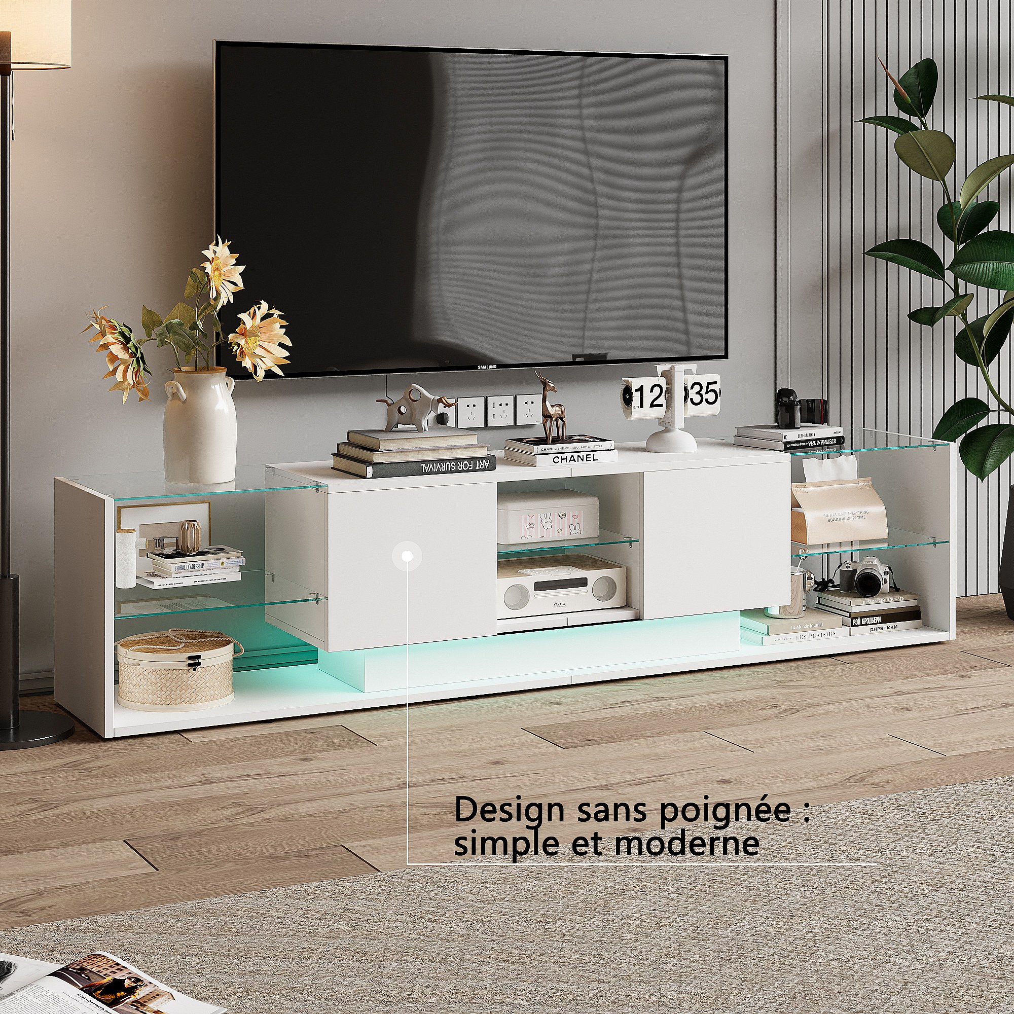 Meuble TV LED, Meuble TV Blanc Brillante, Armoire De Télévision avec 2 Tiroirs, Étagères Ouvertes en Verre, Meuble Tele, 200x35x45cm