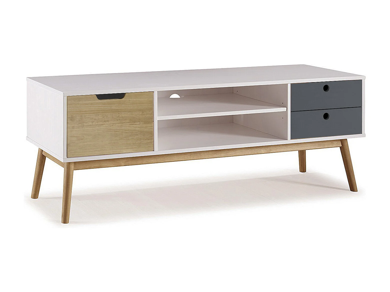 Meuble TV Leti Blanc, Fabriqué en Bois de pin Massif, 1 Porte y 2 tiroirs, 140 cm