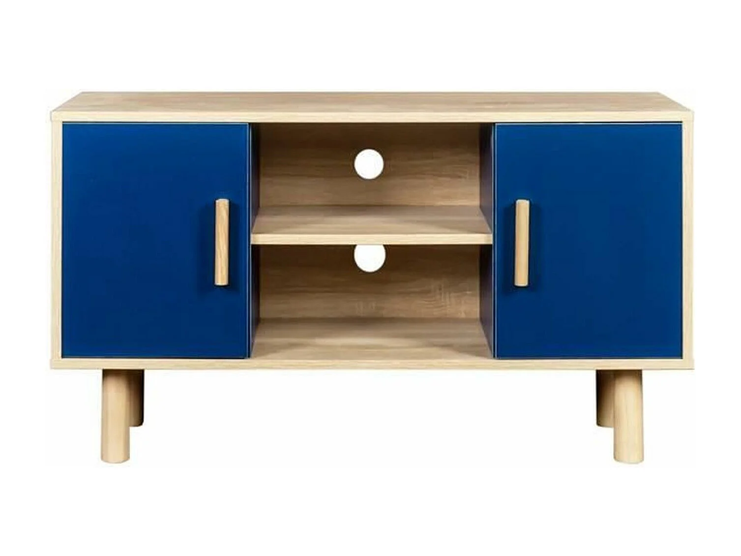 Meuble TV LILA - 2 portes - mélaminé Bleu - Pieds en bois massif - 90 x 35 x 55 cm